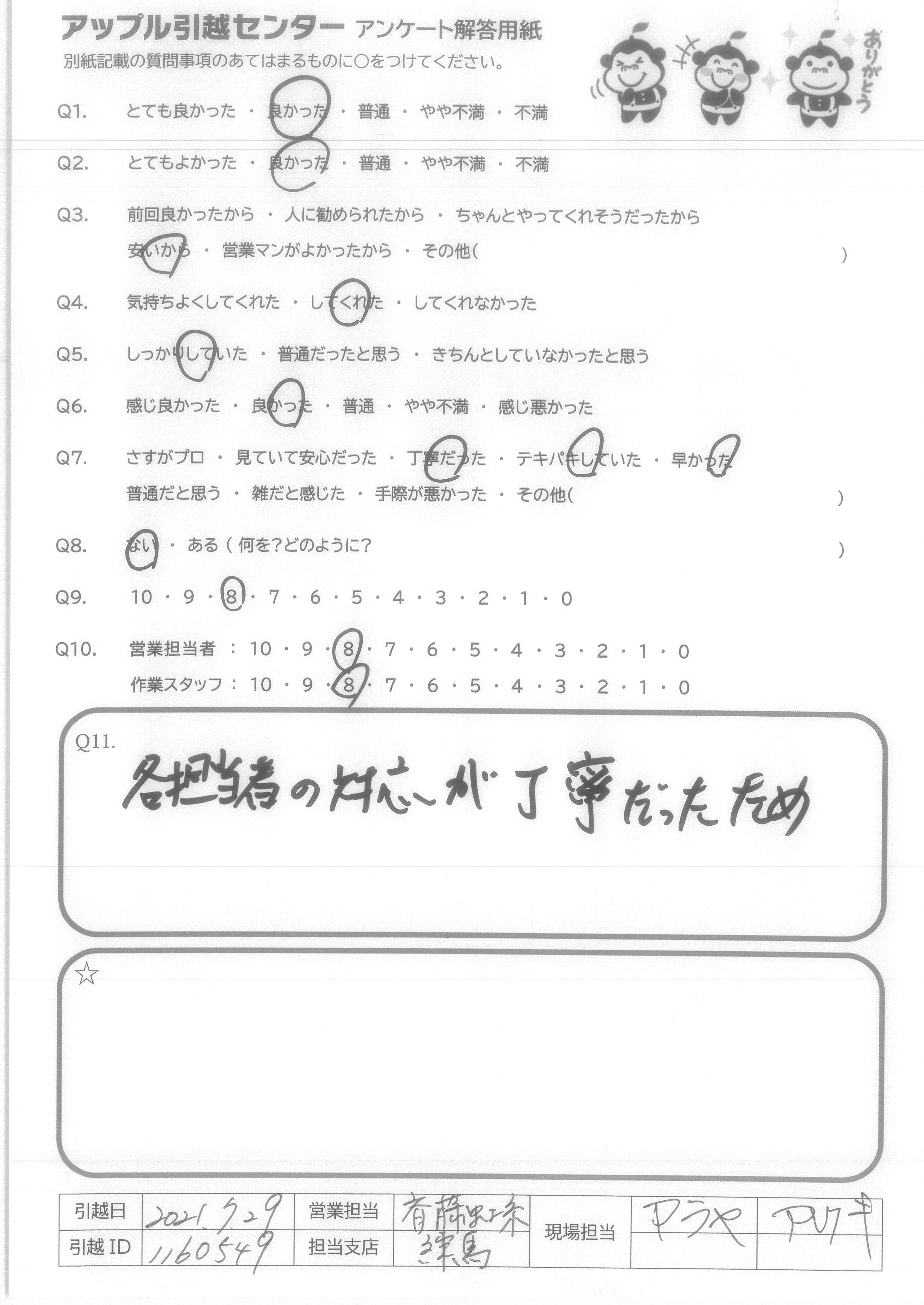 A.現場担当のお二人には、入らない荷物も 臨機応変に対応して頂き、時間も掛かって しまい とても 感謝しています。 重労働ながらも気持ち良い対応でした