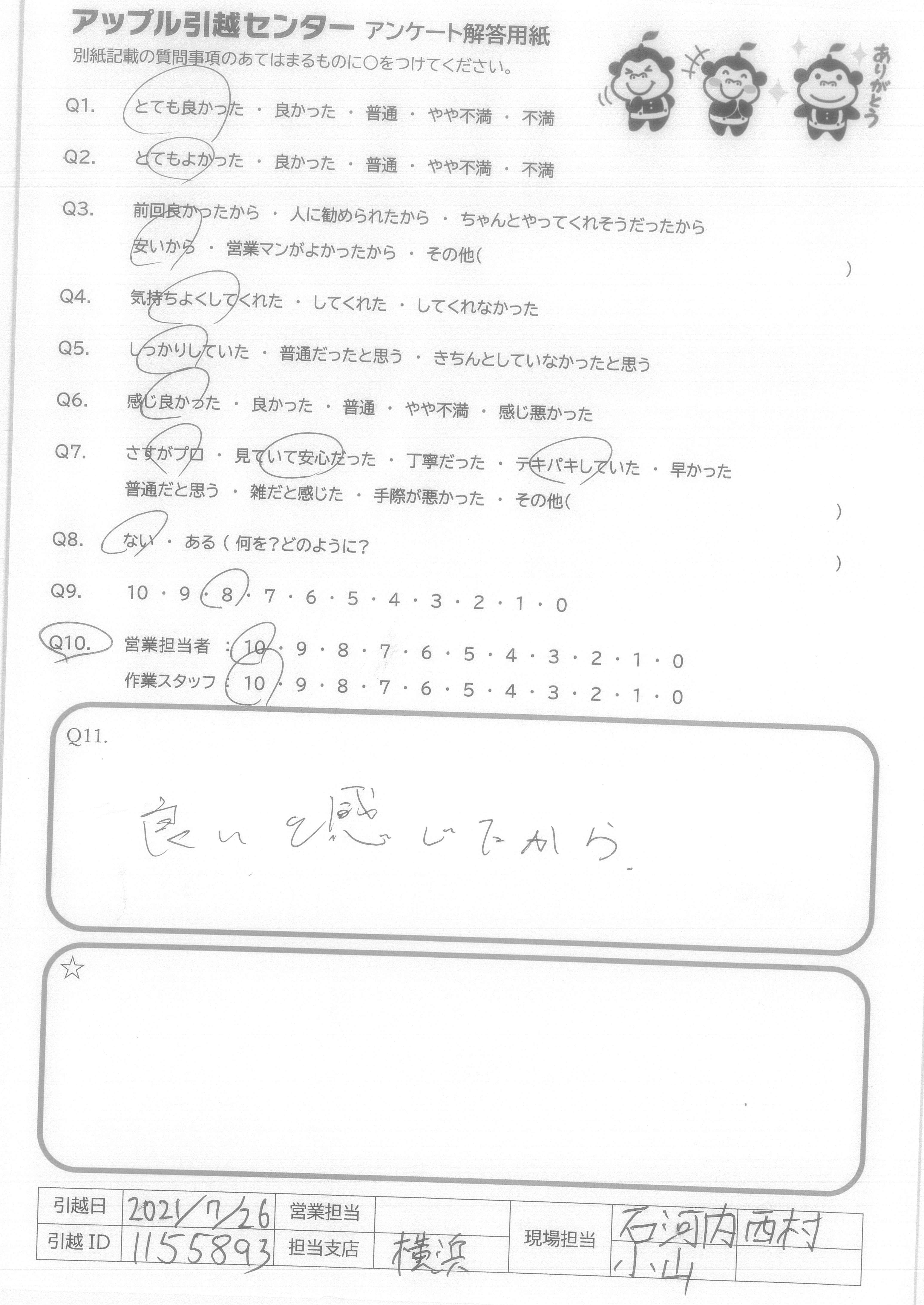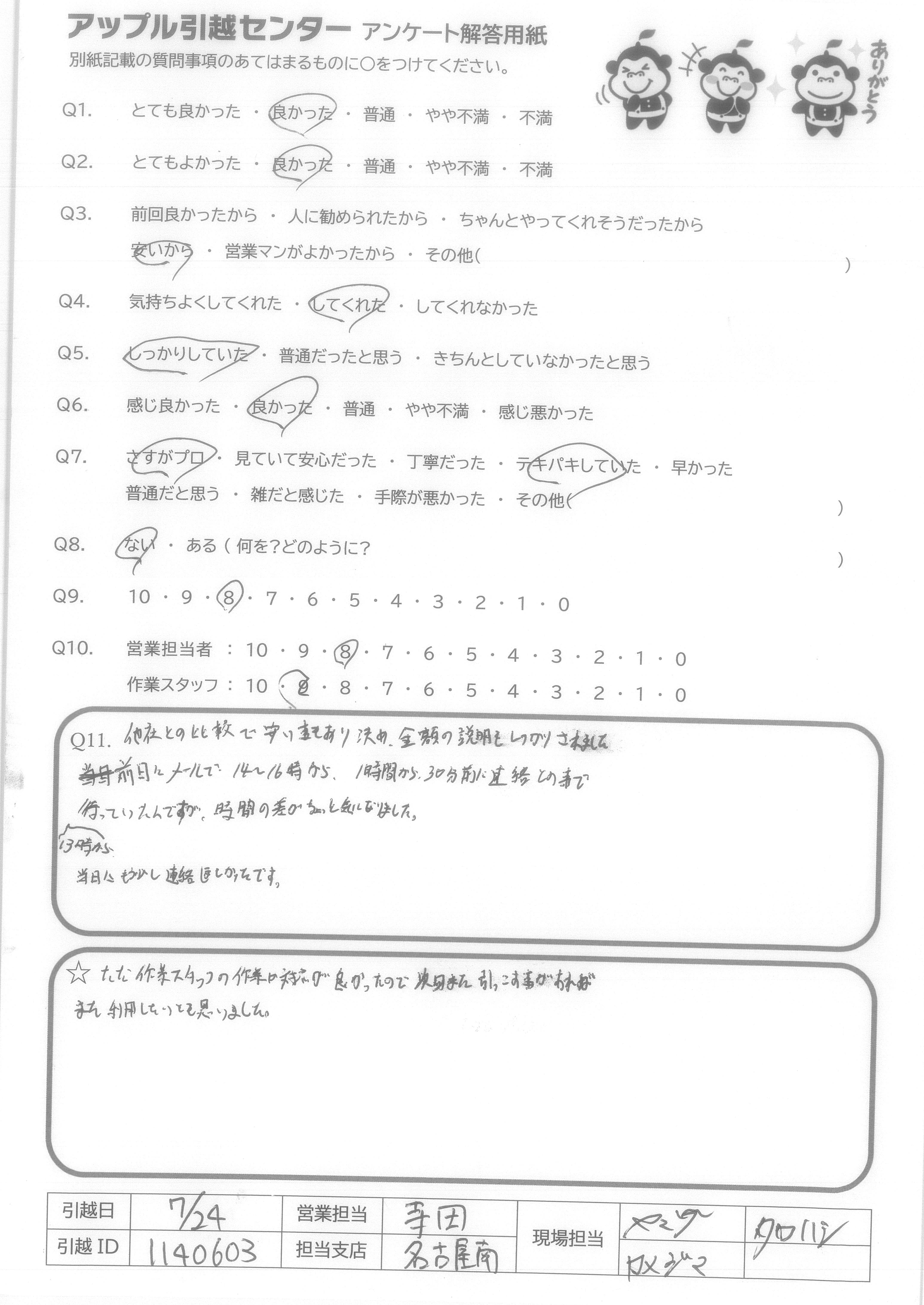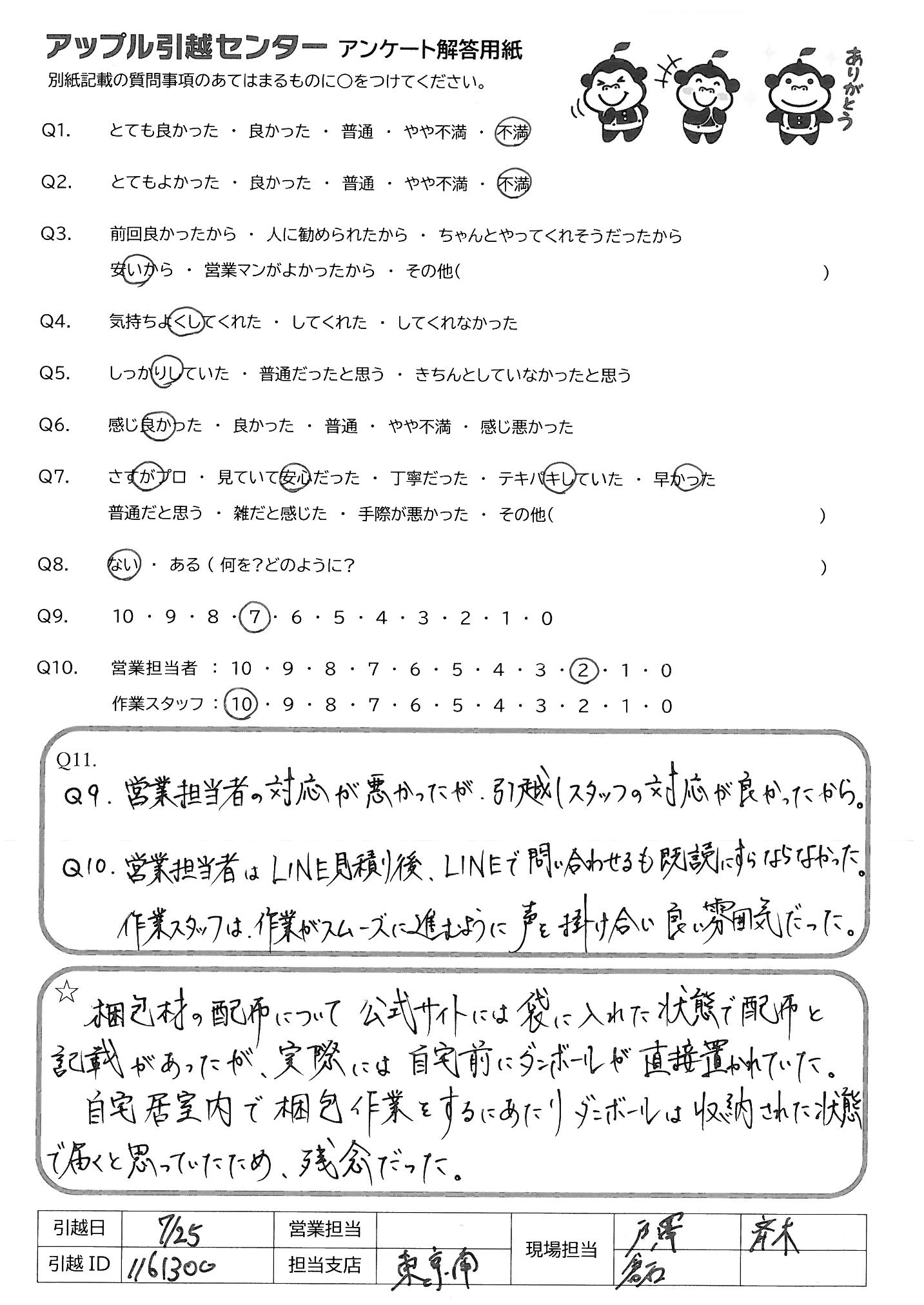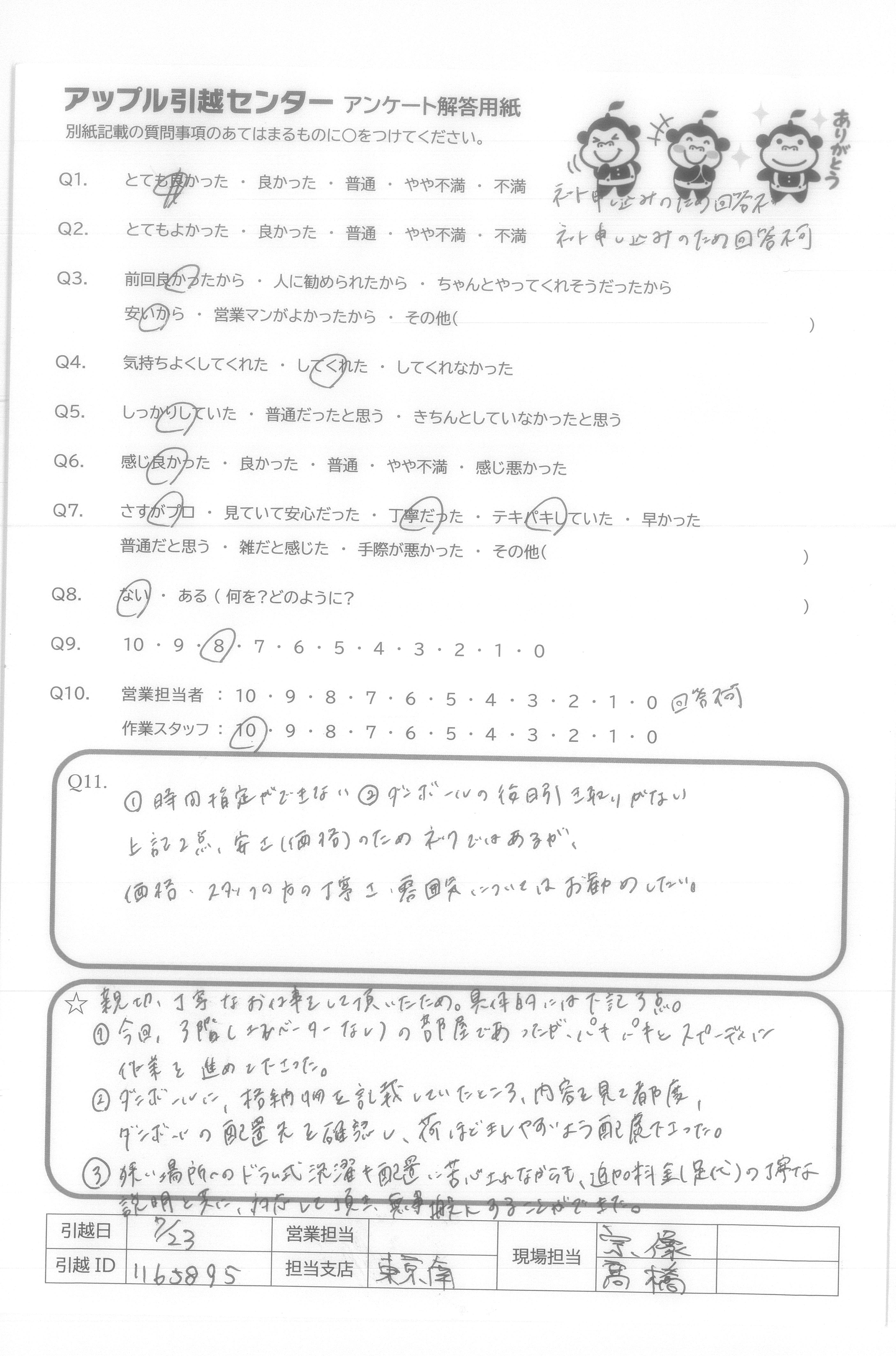 A.Q9.営業担当者の対応が悪かったが、引越しスタッフの対応が良かったから。 Q10.営業担当者はLINE見積り後、LINEで問合わせするも既読にすらならなかった。作業スタッフは、作業がスムーズに進むように声を掛け合い良い雰囲気だった。