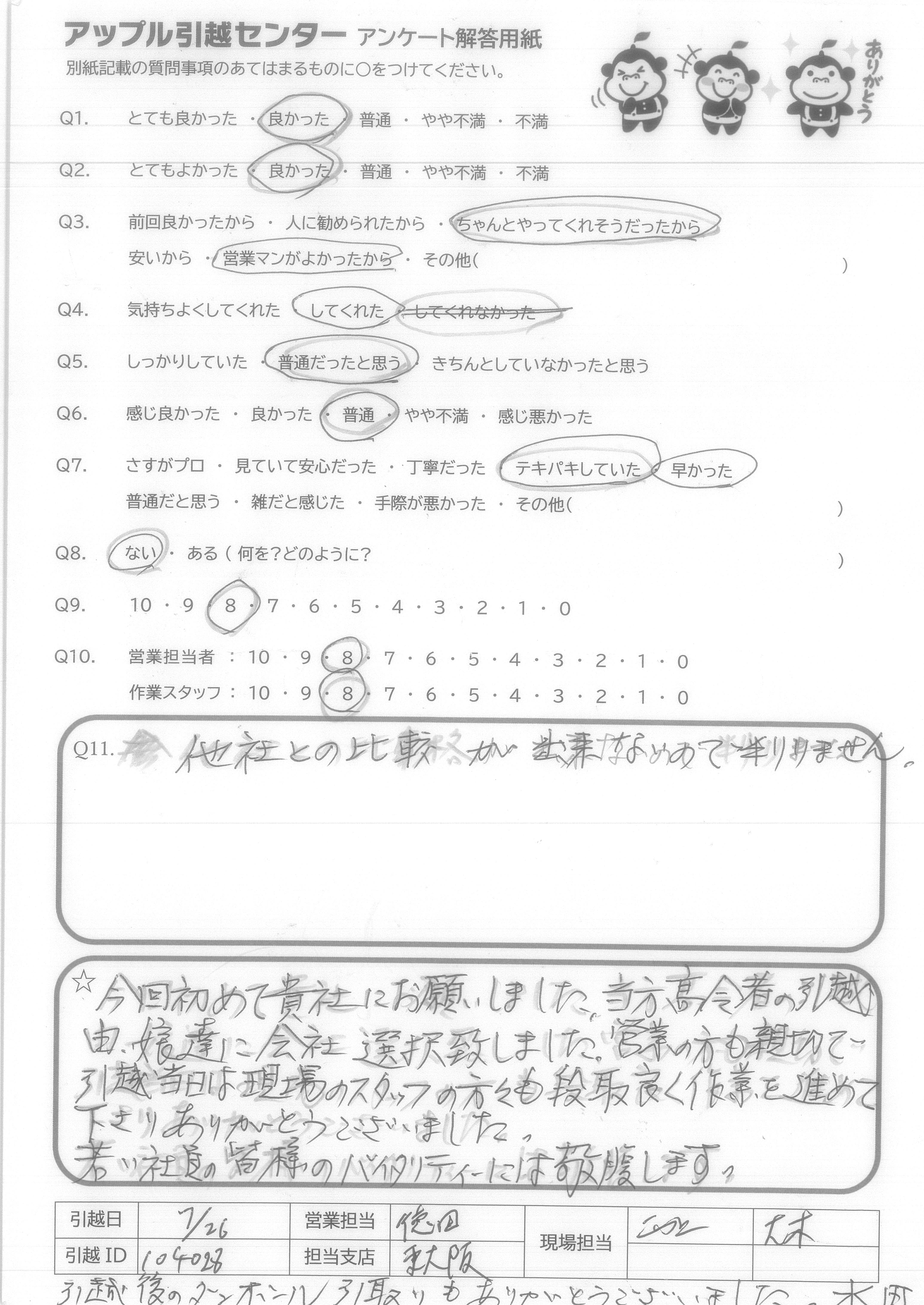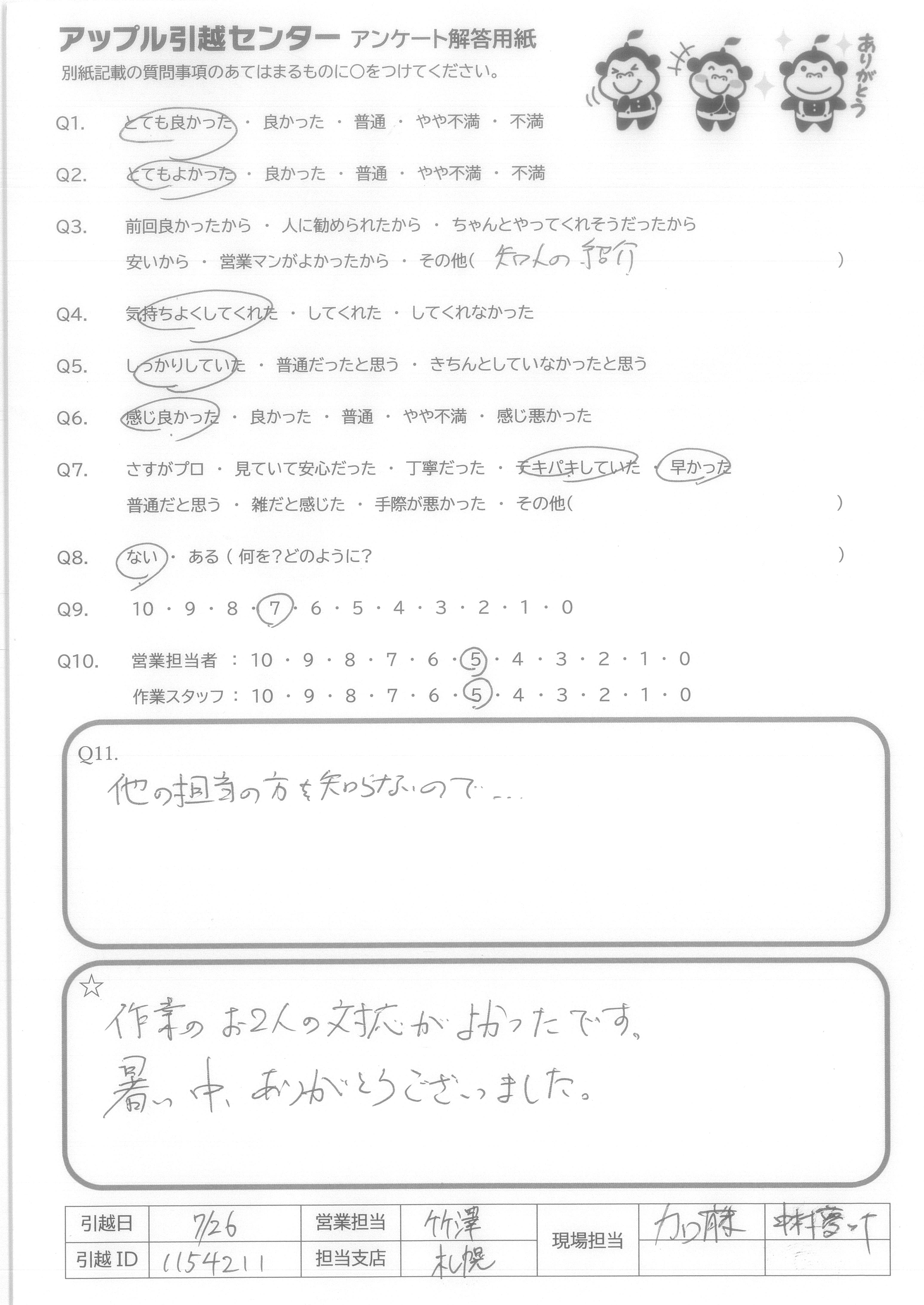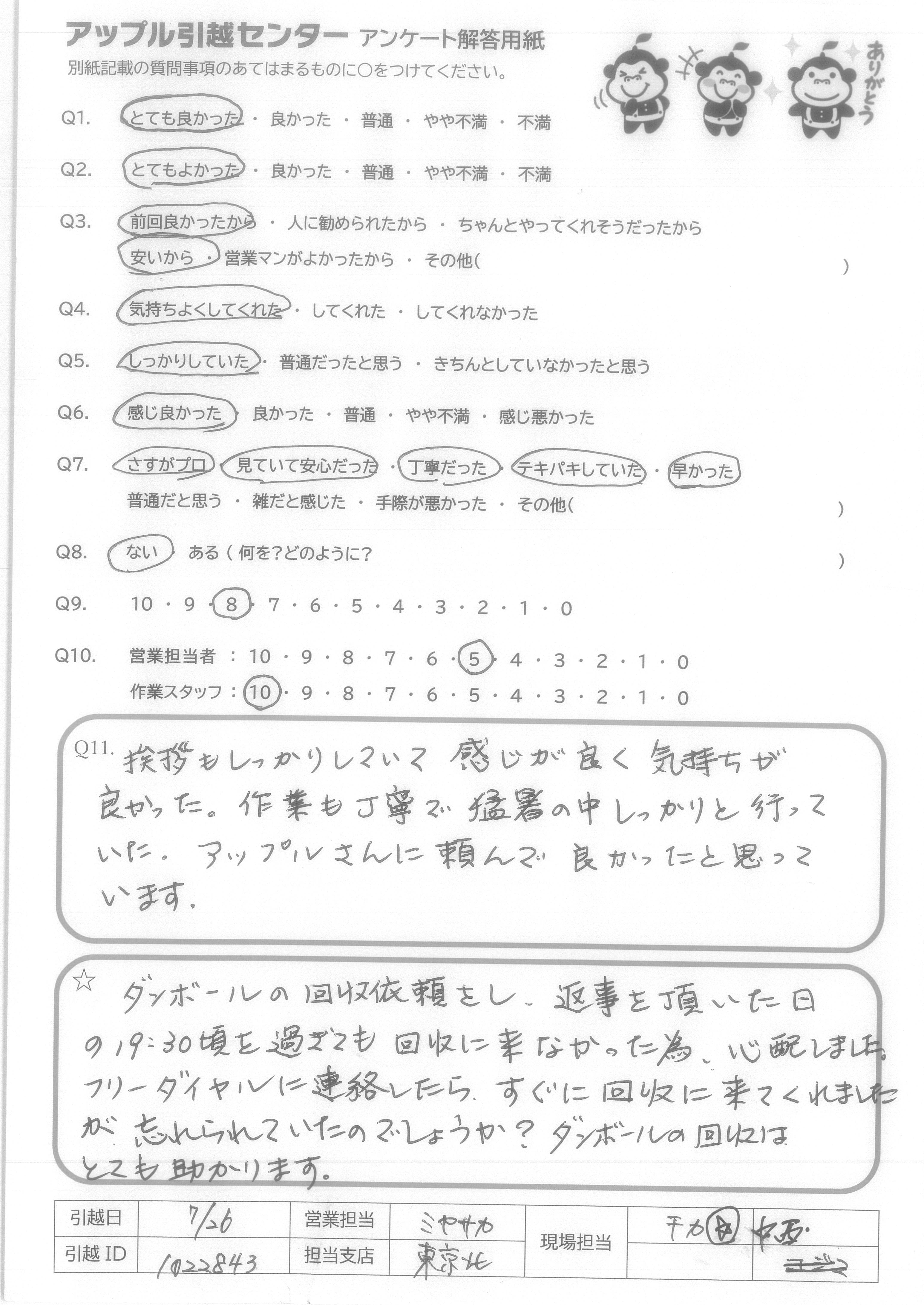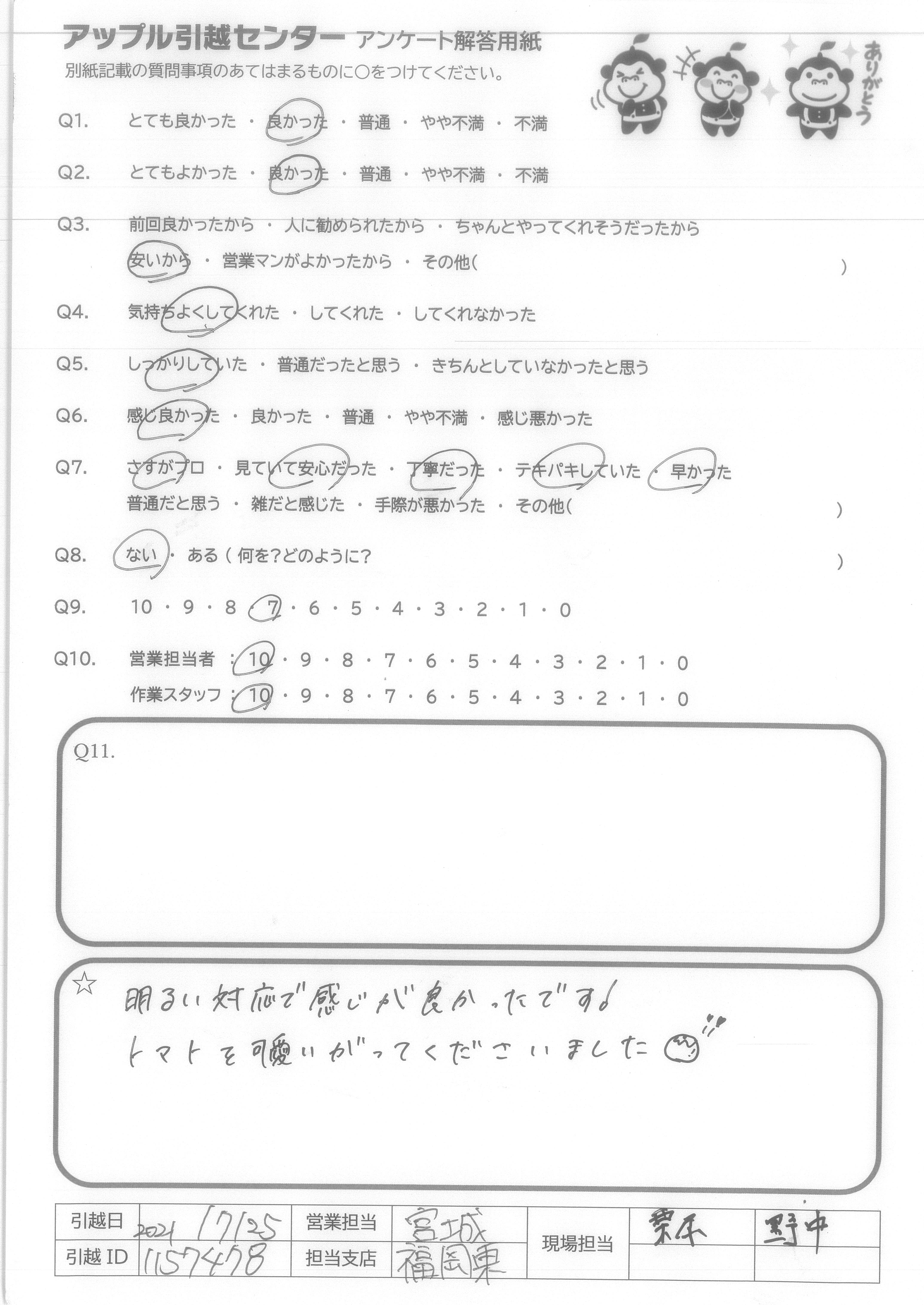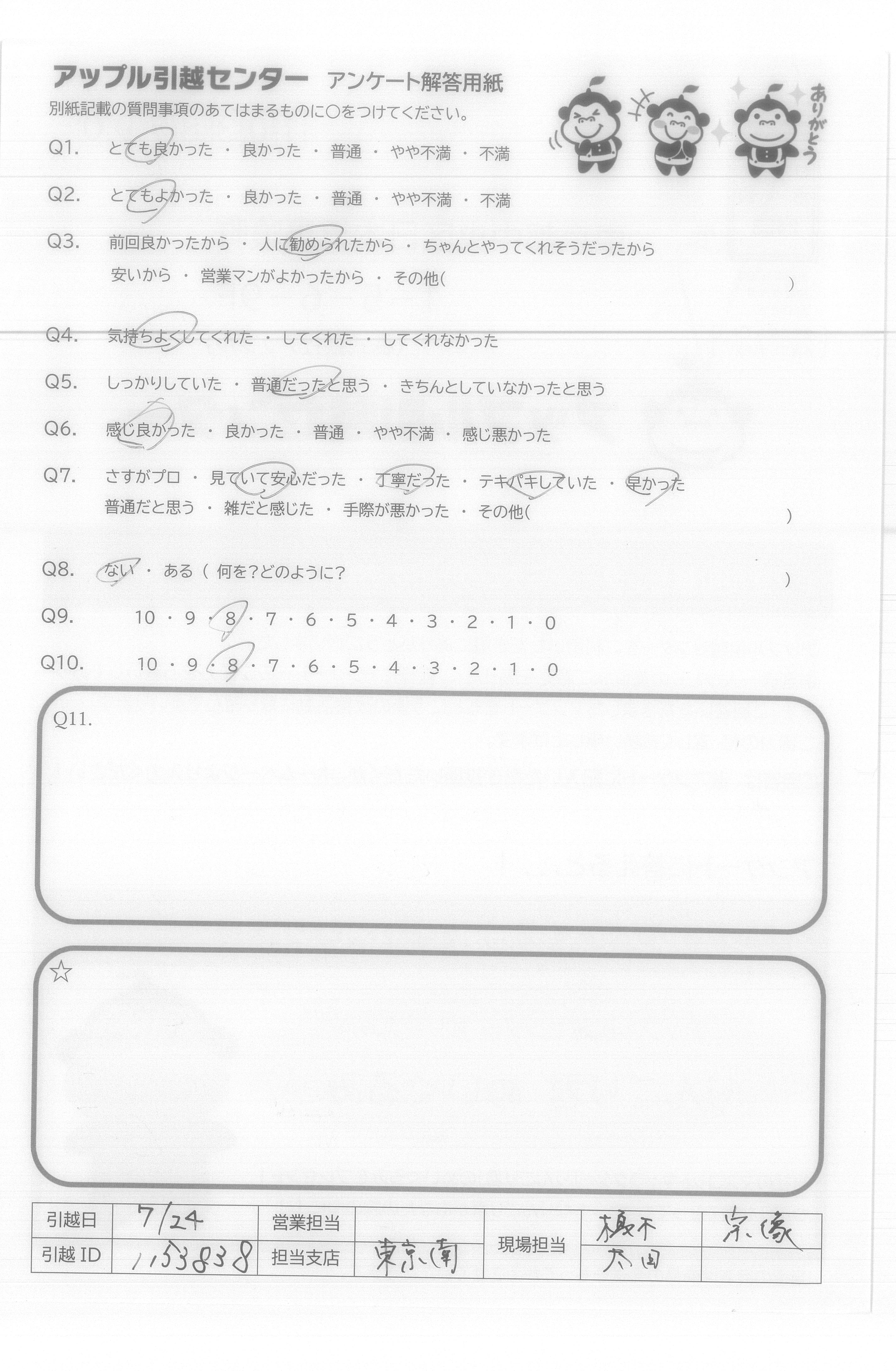 A.Q9.営業担当者の対応が悪かったが、引越しスタッフの対応が良かったから。 Q10.営業担当者はLINE見積り後、LINEで問合わせするも既読にすらならなかった。作業スタッフは、作業がスムーズに進むように声を掛け合い良い雰囲気だった。