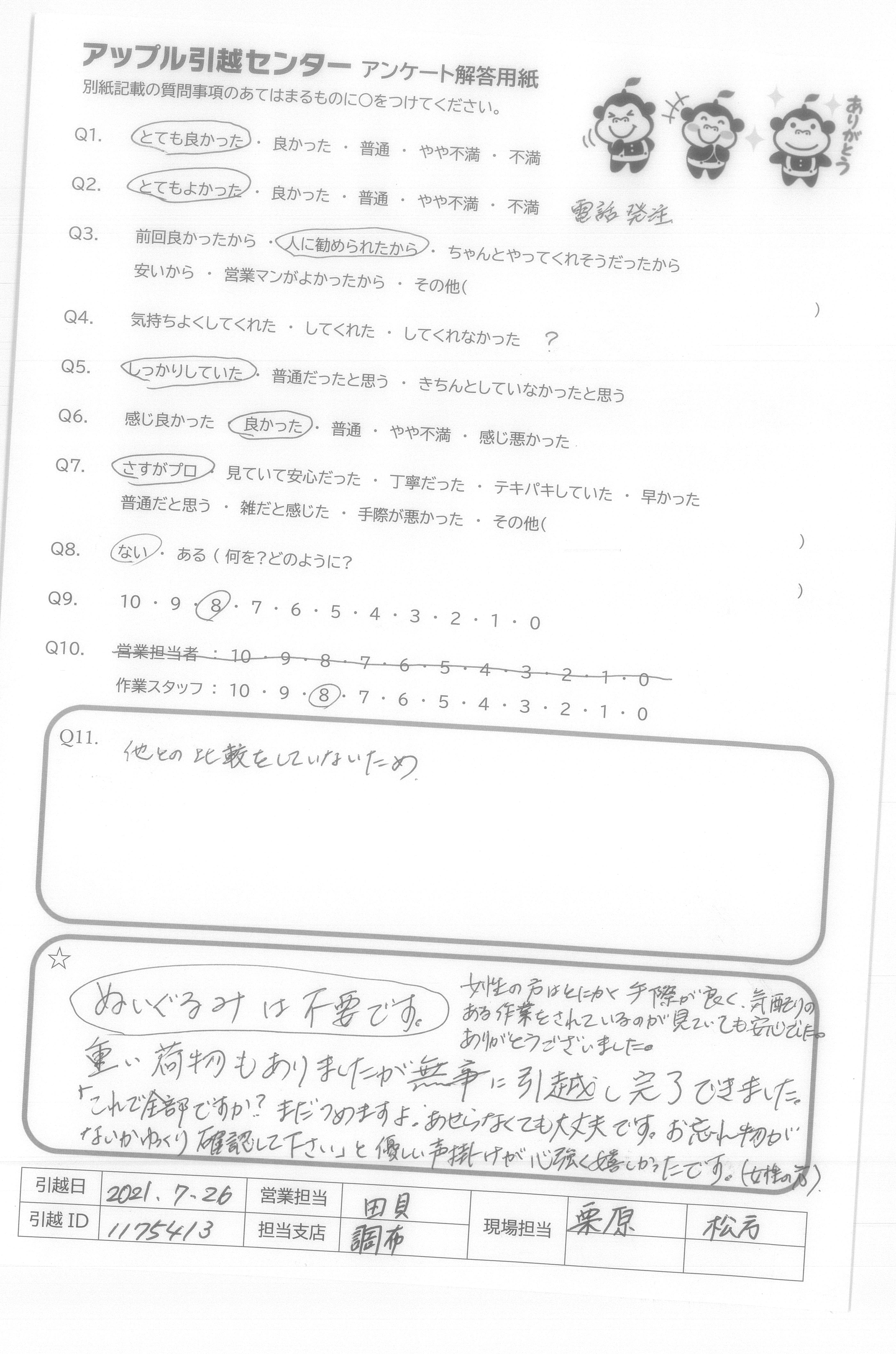 A.洗濯機ラックの足のパーツがなくなった件に関して、お電話を頂いたようなのですが(留守電にメッセージなど残ってなかったので不確かですが)、その後音沙汰なく、その件に関してどうなったのか不明です。 なくなってしまったものは仕方ないと思ってますが、その後の対応が中途半端で少し残念です。 最初に見積りをお願いした際から、搬入完了まで概ね一生懸命やって下さっていて、引っ越し不慣れな為ご迷惑をおかけした部分もあったかと思いますが暑い中頑張って下さり、感謝しております。