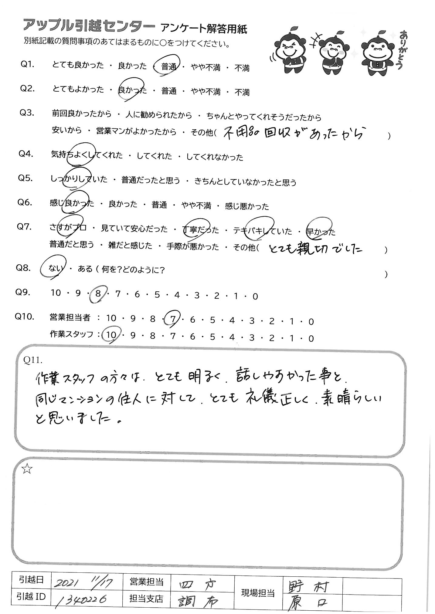 引越し日:2021年11月15日 エリア:神奈川県横浜市港北区