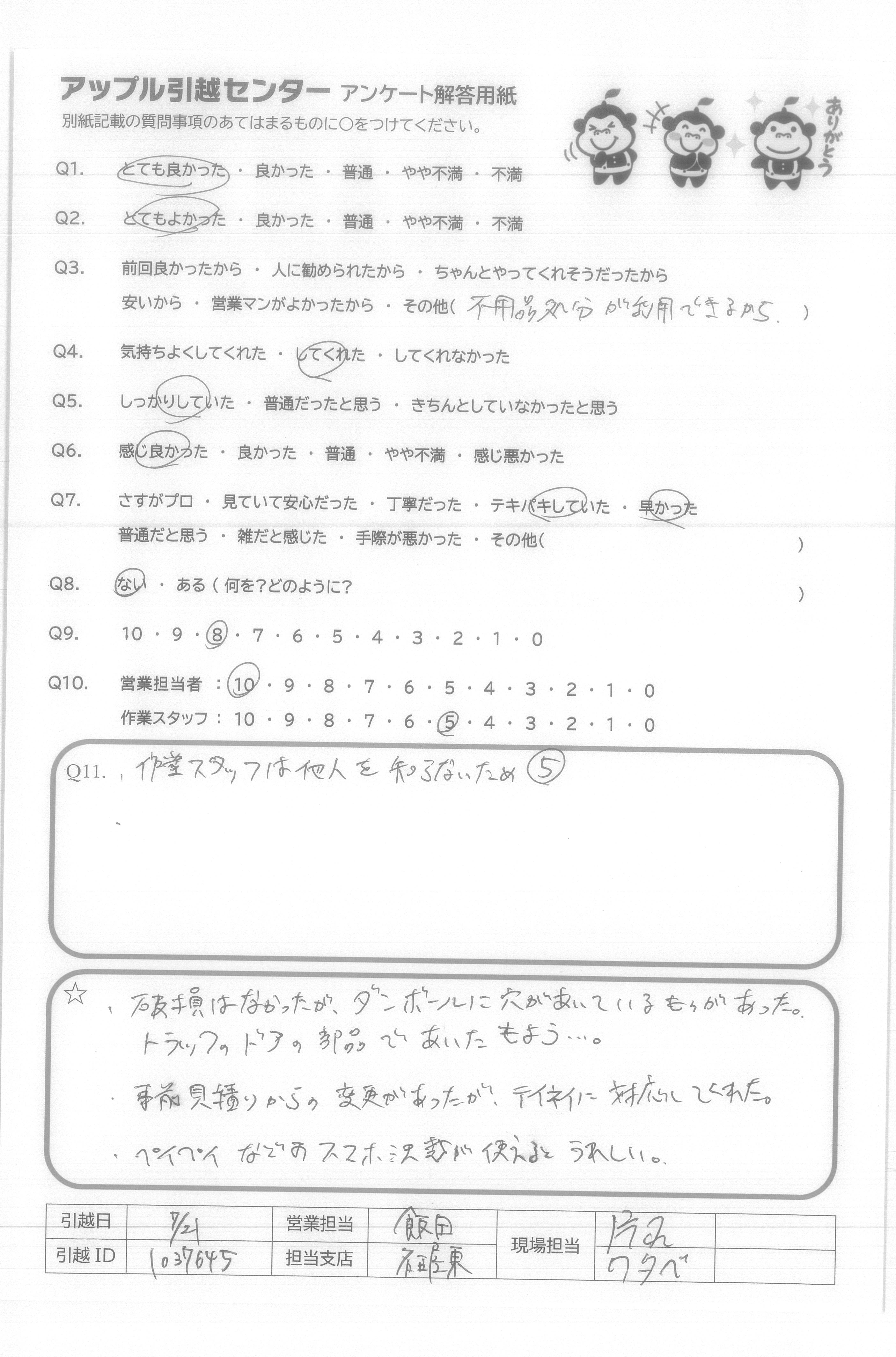 A.・破損はなかったが、ダンボールに穴があいているものがあった。 トラックのドアの部品であいたもよう…。 ・事前見積りからの変更があったが、テイネイに対応してくれた。 ・ペイペイなどスマホ決裁が使えるとうれしい。