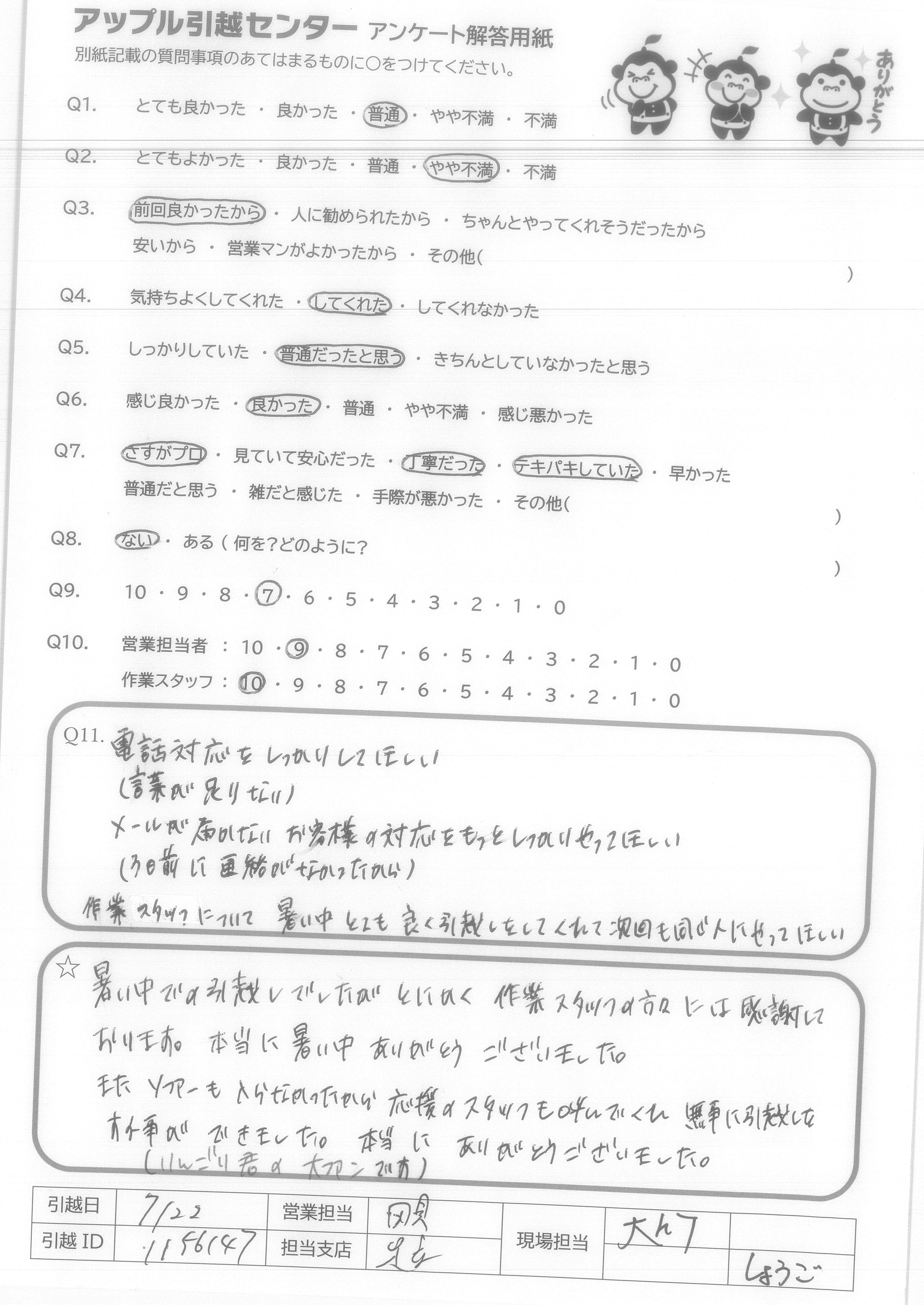 A.暑い中での引越しでしたがとにかく作業スタッフの方々には感謝しております。本当に暑い中ありがとうございました。 またソファーも入らなかったから応援のスタッフも呼んでくれ無事に引越しをする事ができました。本当にありがとうございました。 (りんごり君の大ファンです)