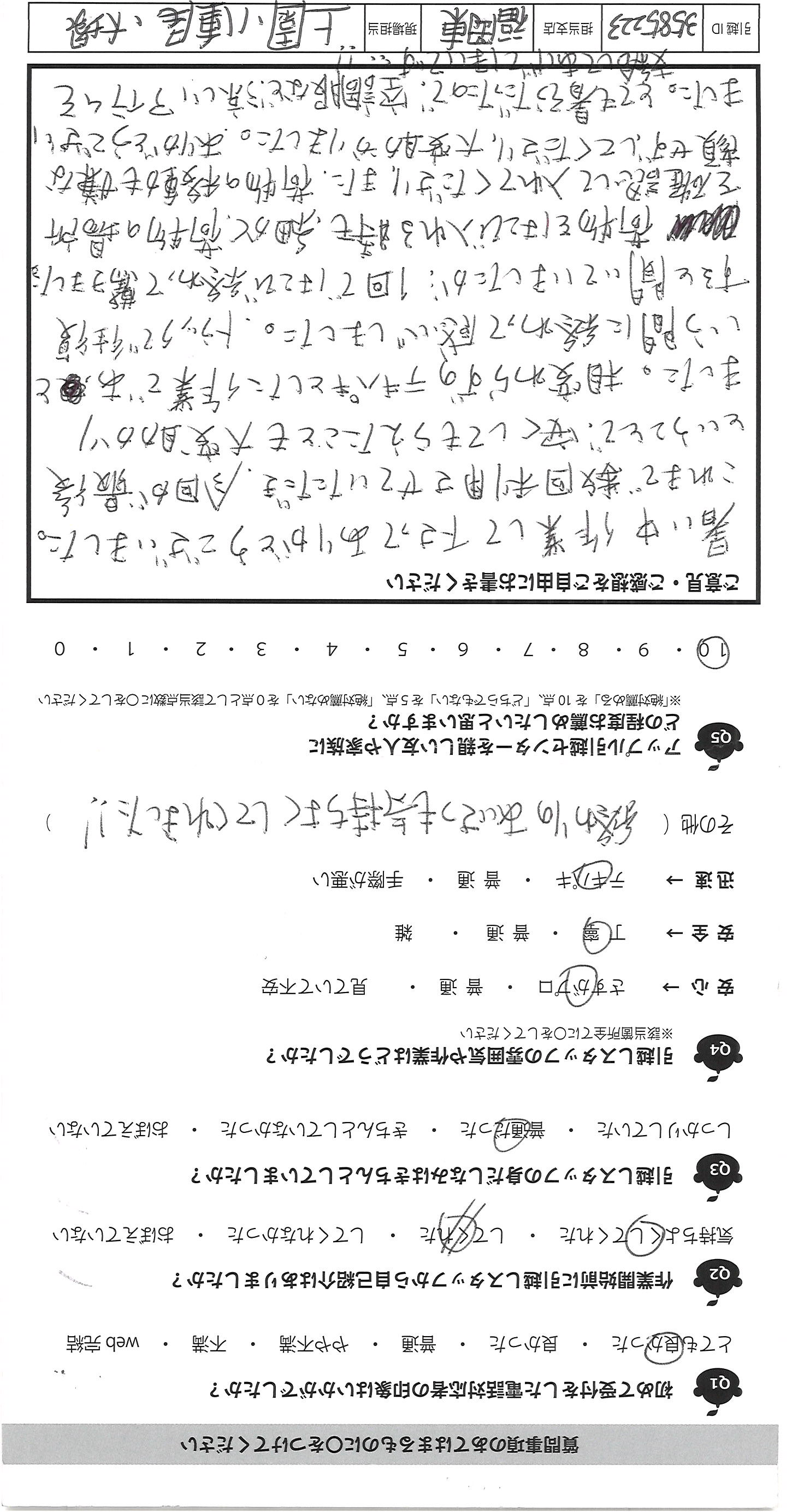 A.暑い中作業して下さってありがとうございました。 これまで数回利用させていただき、今回が最後 ということで、安くしてもらえたことも大変助かり ました。相変わらずのテキパキとした作業であっと いう間に終わって感心しました。トラックで往復 すると聞いていましたが、1回ではこび終わって驚きました。 荷物をはこび入れる時も、細かく、荷物の場所 を確認して入れてくださり、また、荷物の移動も嫌な 顔せず、してくださり、大変助かりました。ありがとうござい ました。とても暑そうだったので、空調服など、涼しいアイテムを 支給してあげてほしいです!!