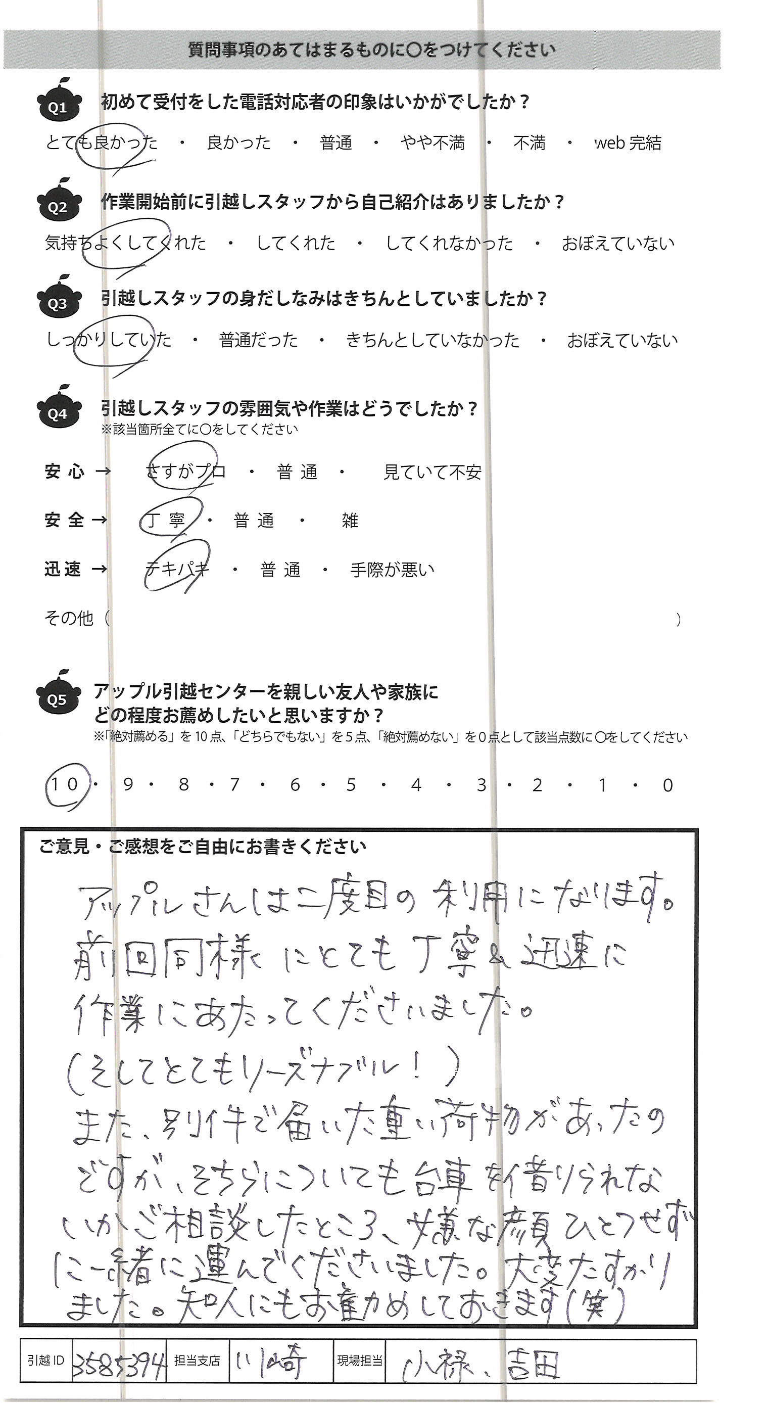 A.今回で3~4回目の利用でしたが、やっぱりアップルさんに お願いをして良かったです。 ちょうど搬出のときにゲリラ豪雨に見舞われてしまい お2人にはご迷惑をおかけしてしまいました。 また、新居でのドラム式洗濯機の取りつけでは 限られたスペースに見事ぴったり設置していただき、 「プロのお仕事だな」と感動しました。 柿本様、荒井様、本当にありがとうございました。 そして、アップルさんの対応はいつも素晴らしいです。 また、機会がございましたら、ぜひよろしくお願いします。