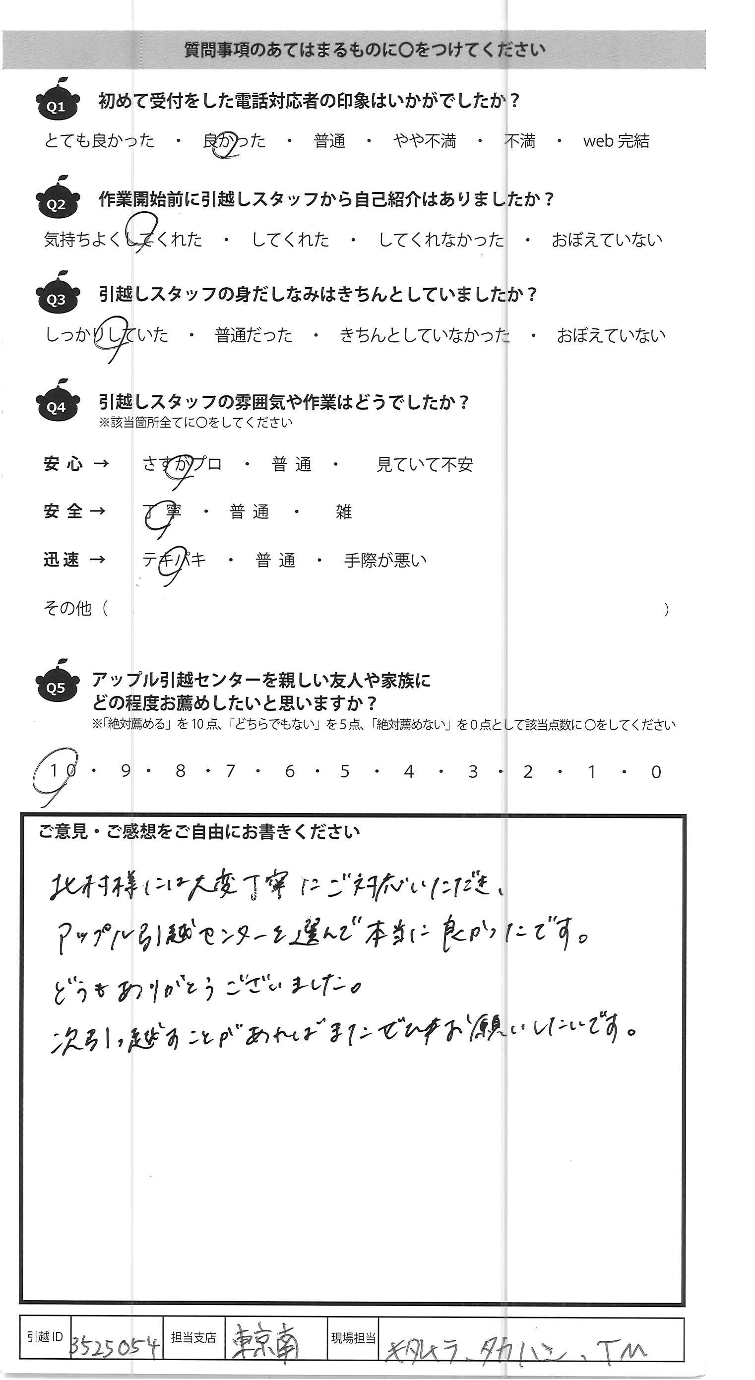 A.北村様には大変丁寧にご対応いただき、 アップル引越センターを選んで本当に良かったです。 どうもありがとうございました。 次引っ越すことがあればまたぜひお願いしたいです。