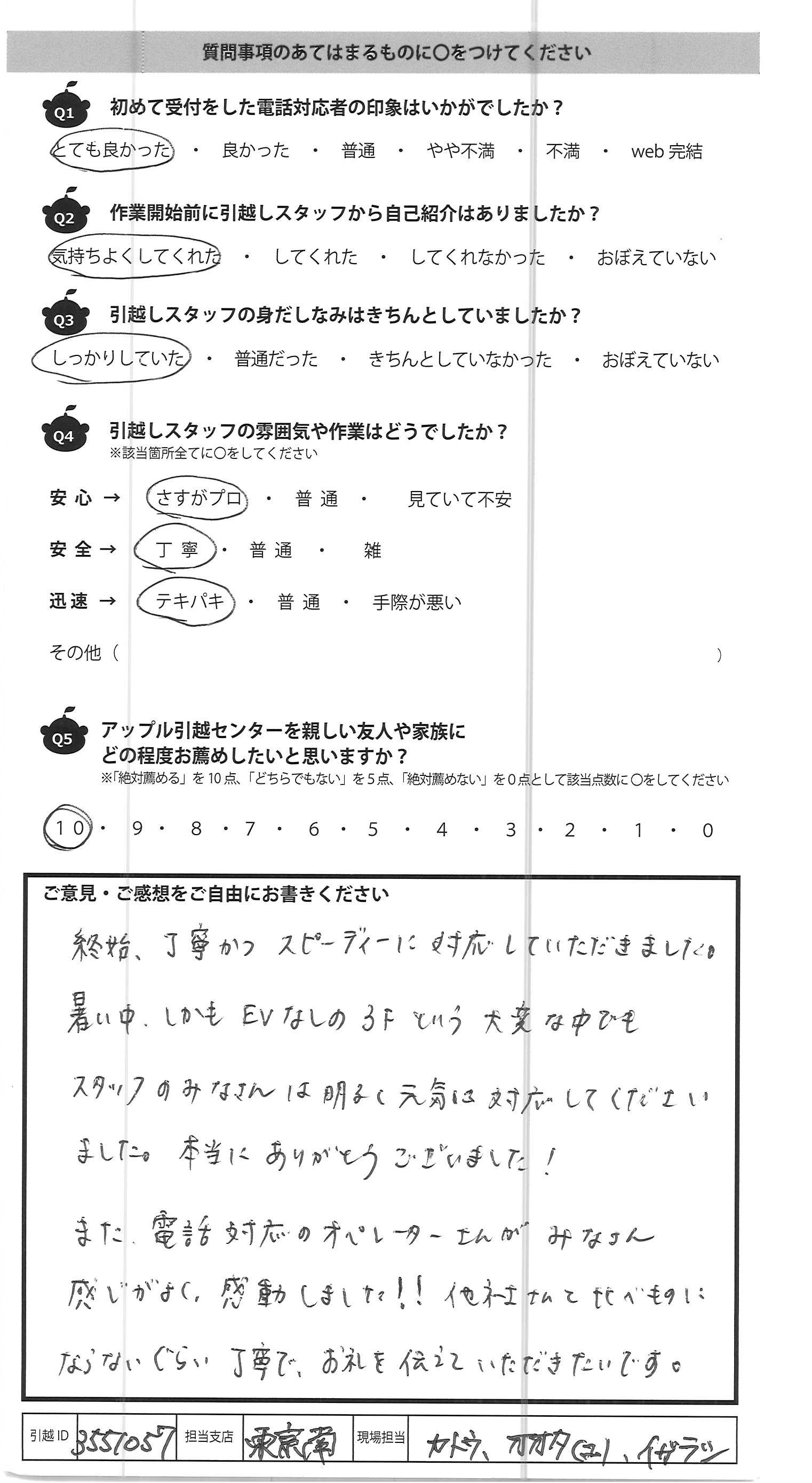 A.終始、丁寧かつスピーディーに対応していただきました。 暑い中、しかもEVなしの3Fという大変な中でも スタッフのみなさんは明るく元気に対応してください ました。本当にありがとうございました! また、電話対応のオペレーターさんがみなさん 感じがよく、感動しました!!他社さんと比べものに ならないぐらい丁寧で、お礼を伝えていただきたいです。