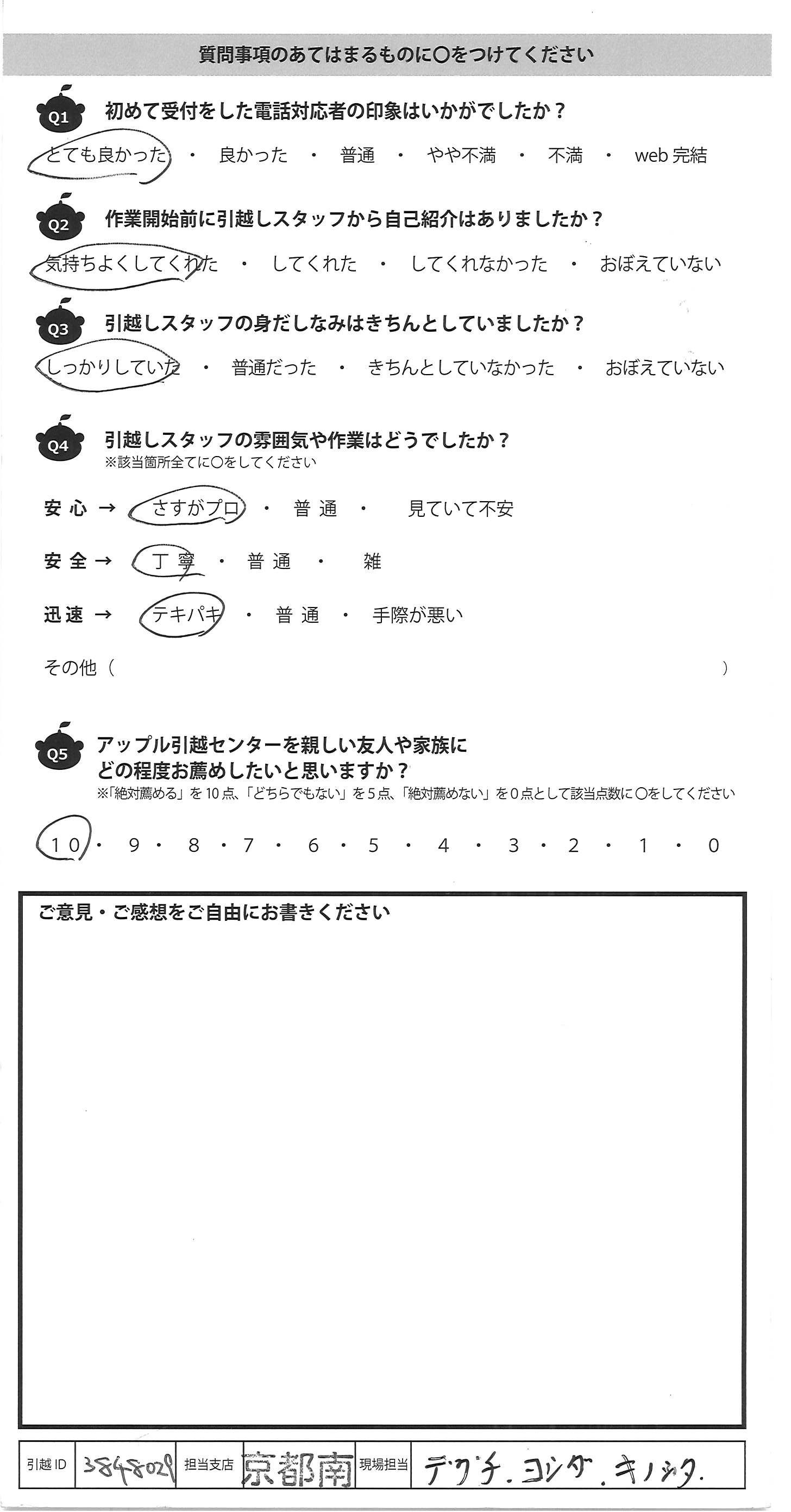 A.声かけもとても丁寧で優しくて、仕事も早くてとても 良かったです。又引越しすることがあったり お友達でも引越しする人がいたら アップルさんをおすすめしたいと思いました。 ありがとうございました。