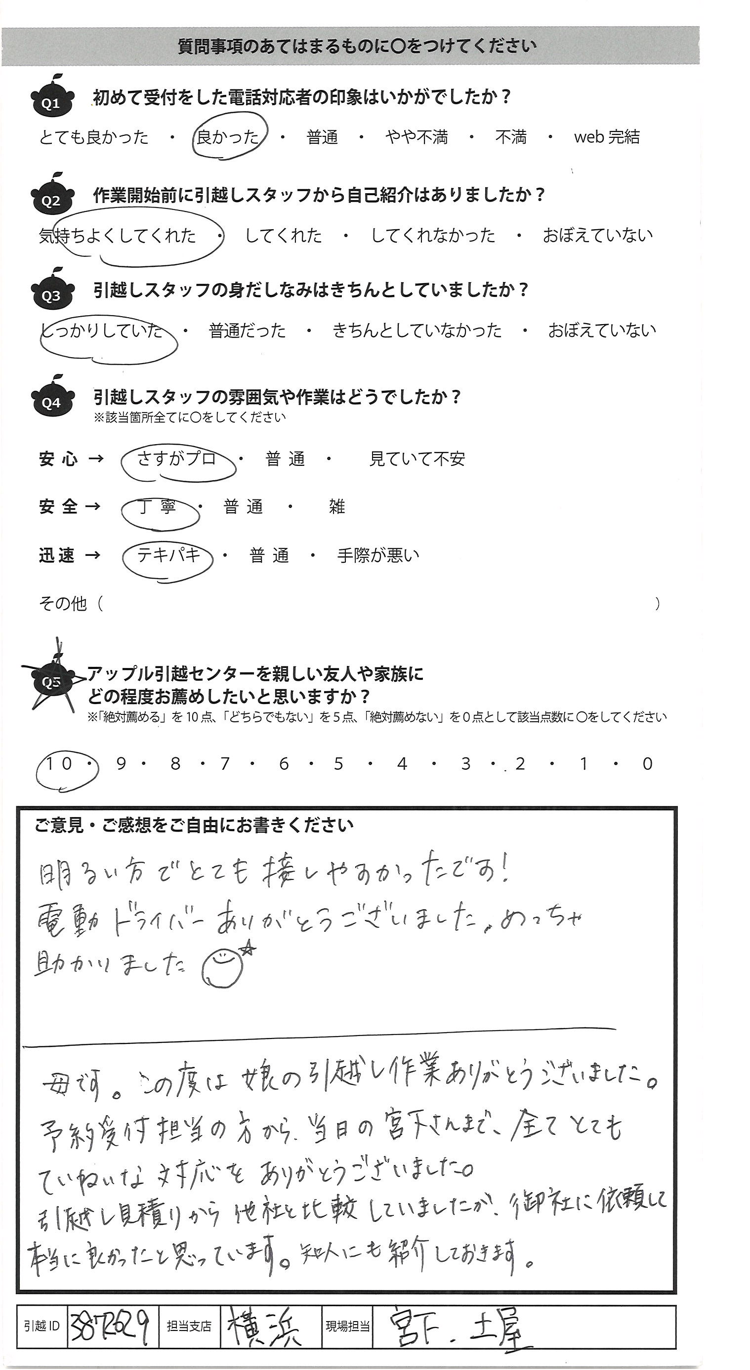 A.明るい方でとても接しやすかったです! 電動ドライバーありがとうございました。めっちゃ 助かりました 母です。この度は娘の引越し作業ありがとうございました。 予約受付担当の方から、当日の宮下さんまで、全てとても ていねいな対応をありがとうございました。 引越し見積りから他社と比較していましたが、御社に依頼して 本当に良かったと思っています。知人にも紹介しておきます。