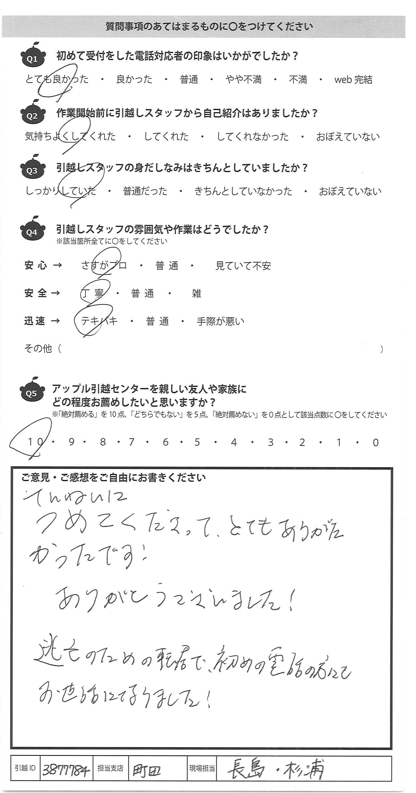 A.みなさんとてもテキパキとていねいにしてくだ さり大変助かりました。 また引越しの際はアップルさんに お願いしたいです。 ありがとうございました!