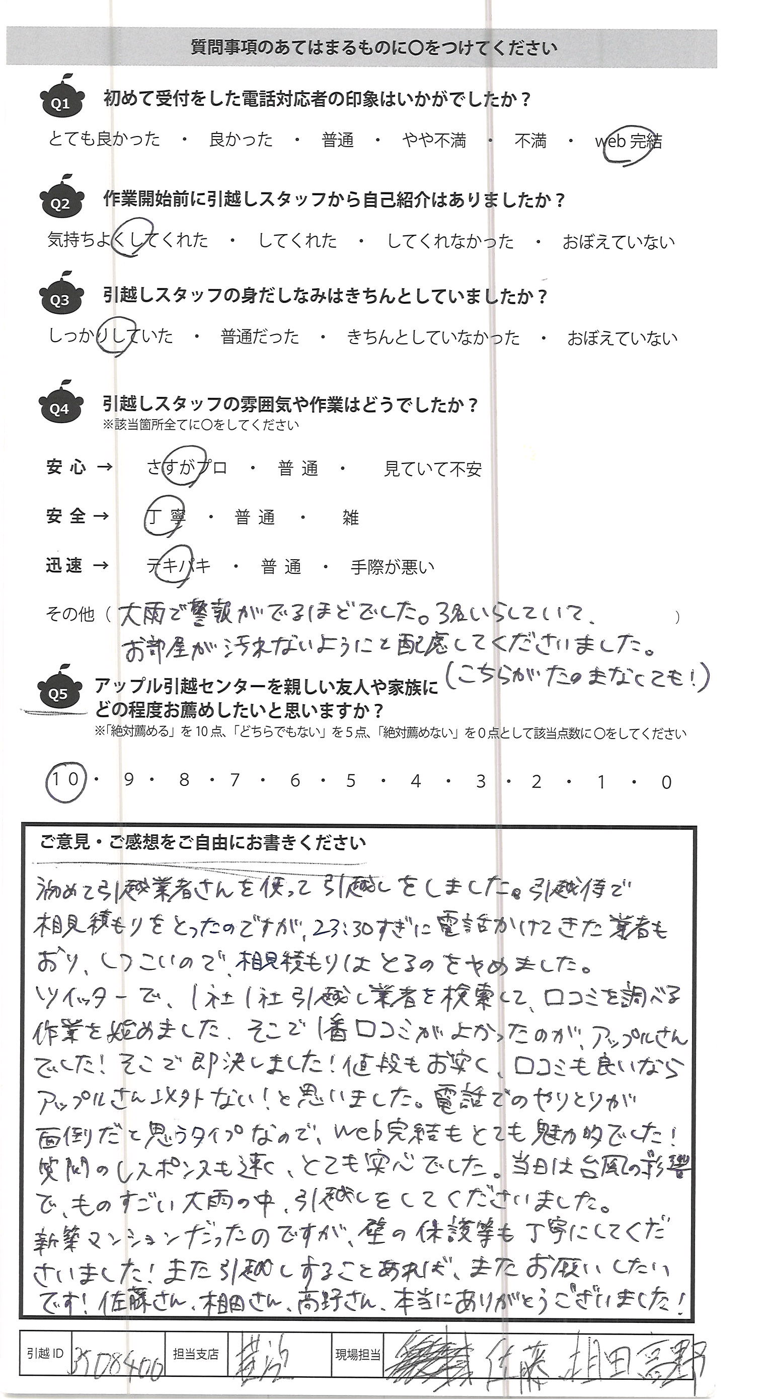 A.初めて引越業者さんを使って引越しをしました。引越待で 相見積もりをとったのですが、23:30すぎに電話かけてきた業者も あり、しつこいので、相見積もりはとるのをやめました。 ツイッターで、1社1社引越し業者を検索して、口コミを調べる 作業を始めました。そこで1番口コミがよかったのが、アップルさん でした!そこで即決しました!値段もお安く、口コミも良いなら アップルさん以外ない!と思いました。電話でのやりとりが 面倒だと思うタイプなので、web完結もとても魅力的でした! 質問のレスポンスも速く、とても安心でした。当日は台風の影響 で、ものすごい大雨の中、引越しをしてくださいました。 新築マンションだったのですが、壁の保護等も丁寧にしてくだ さいました!また引越しすることがあれば、またお願いしたい です!佐藤さん、相田さん、高野さん、本当にありがとうございました!