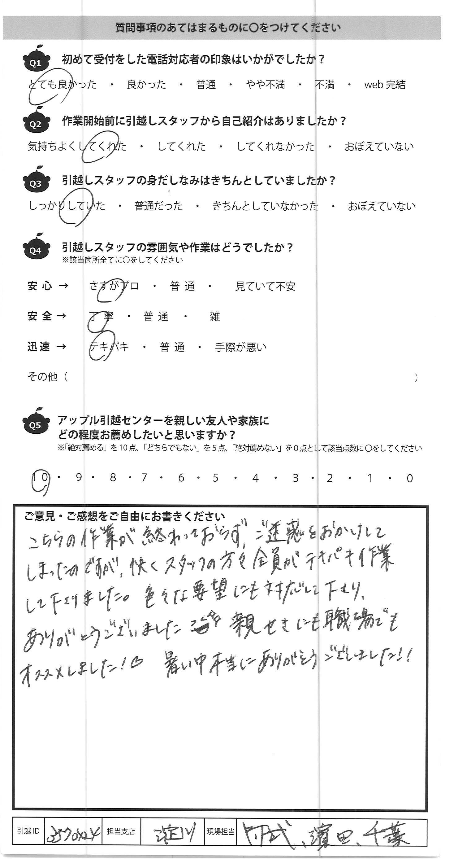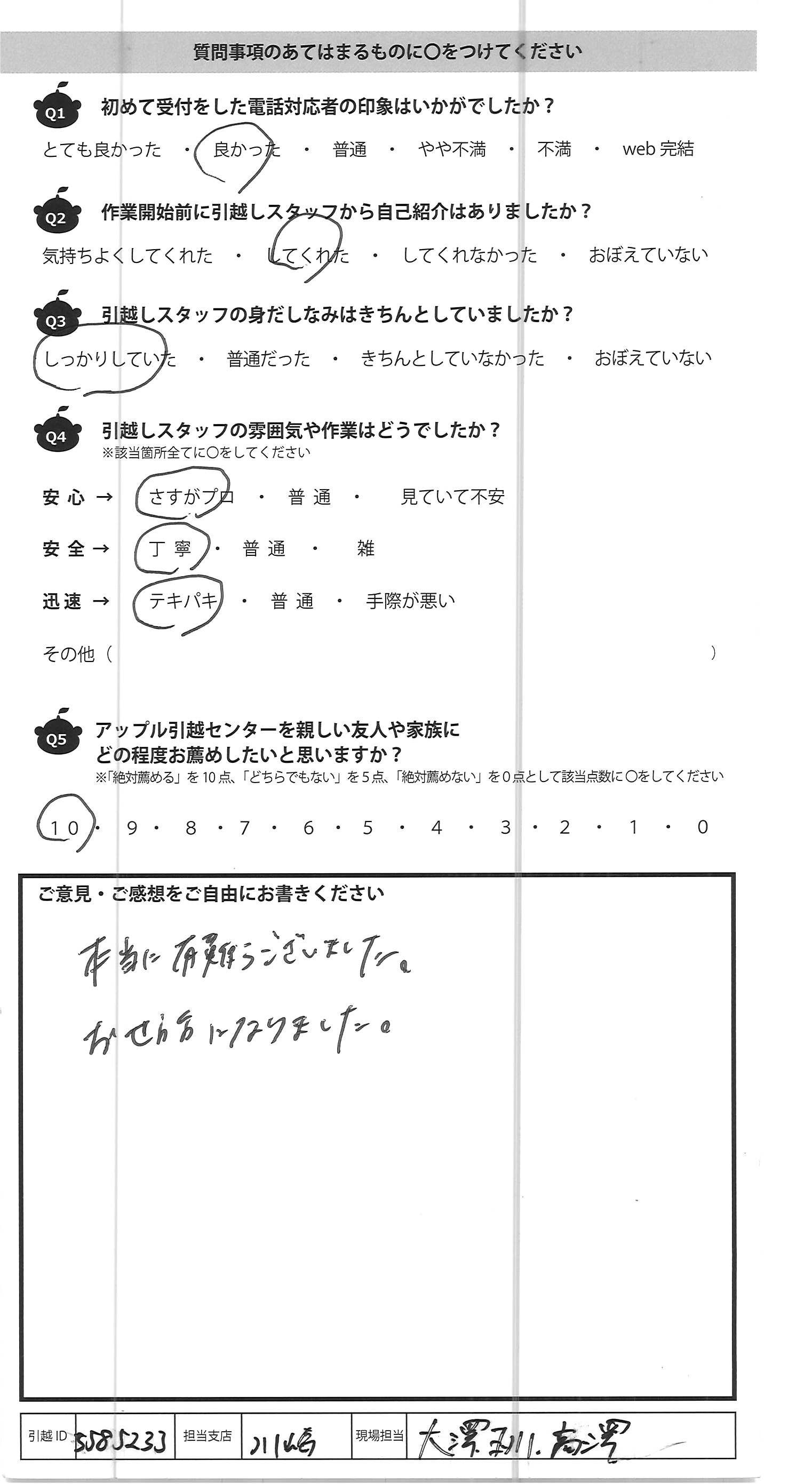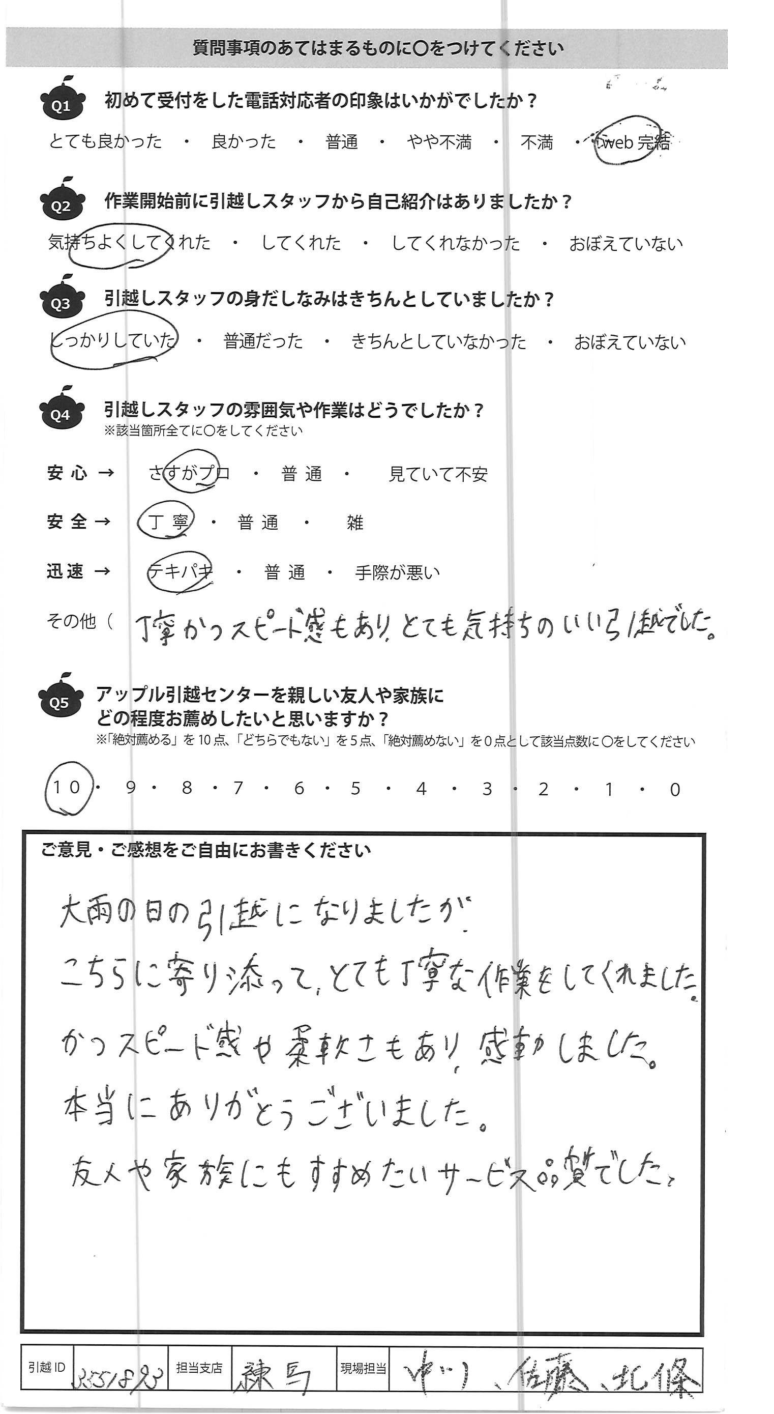 A.引越しが始まってから終わるまで 速すぎてびっくりしました。 荷物を包装する際も、丁寧に1つ1つ 声をかけて下さりました。 申し出していなかった荷物もこころよく引き受けて 下さりありがとうございました。 次回もアップルさんにお願いしたいと思います。