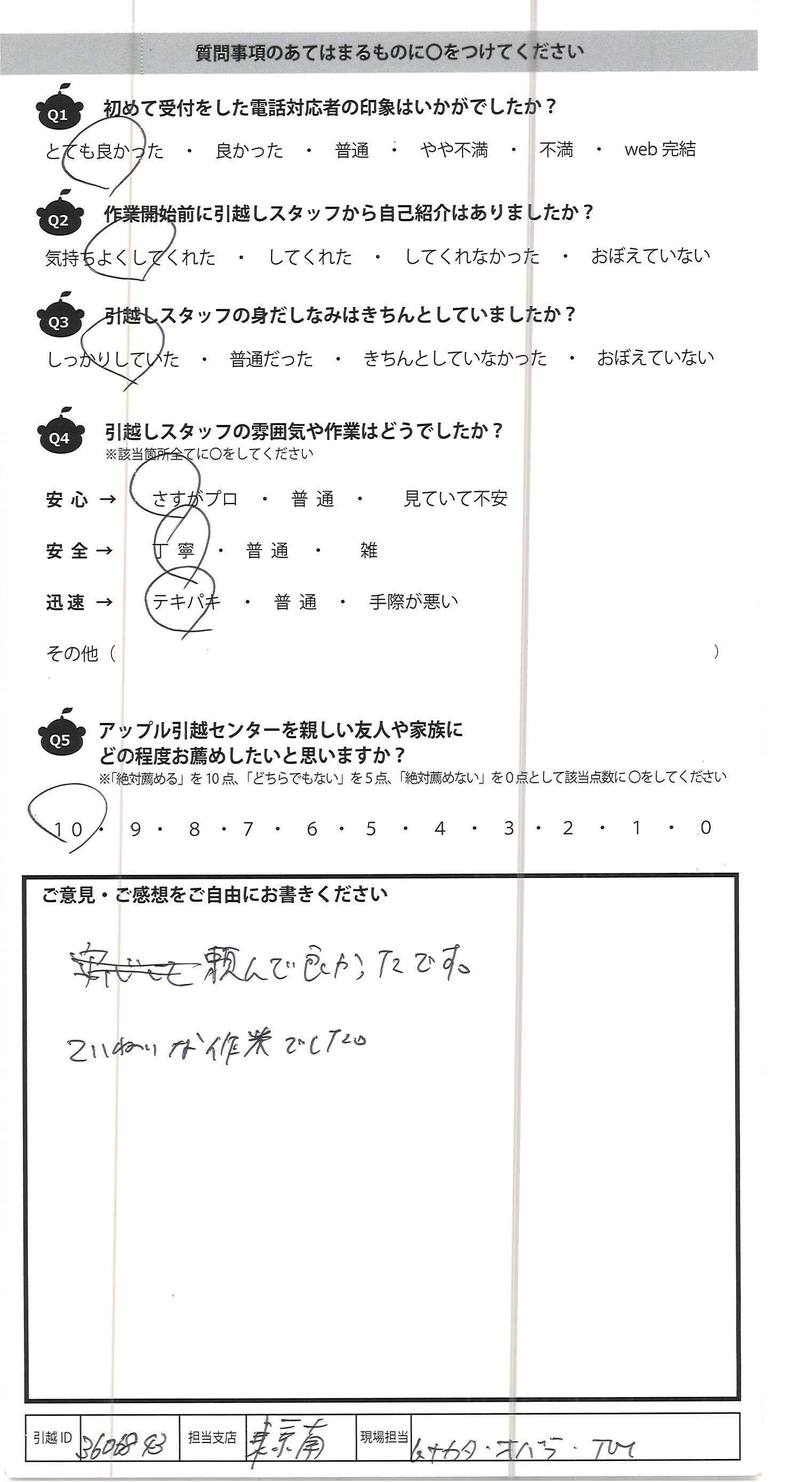 A.電話応対、チャット応対の方は丁寧に対応していただき、 引っ越し担当の方に素早く作業していただきました。 ありがとうございました。