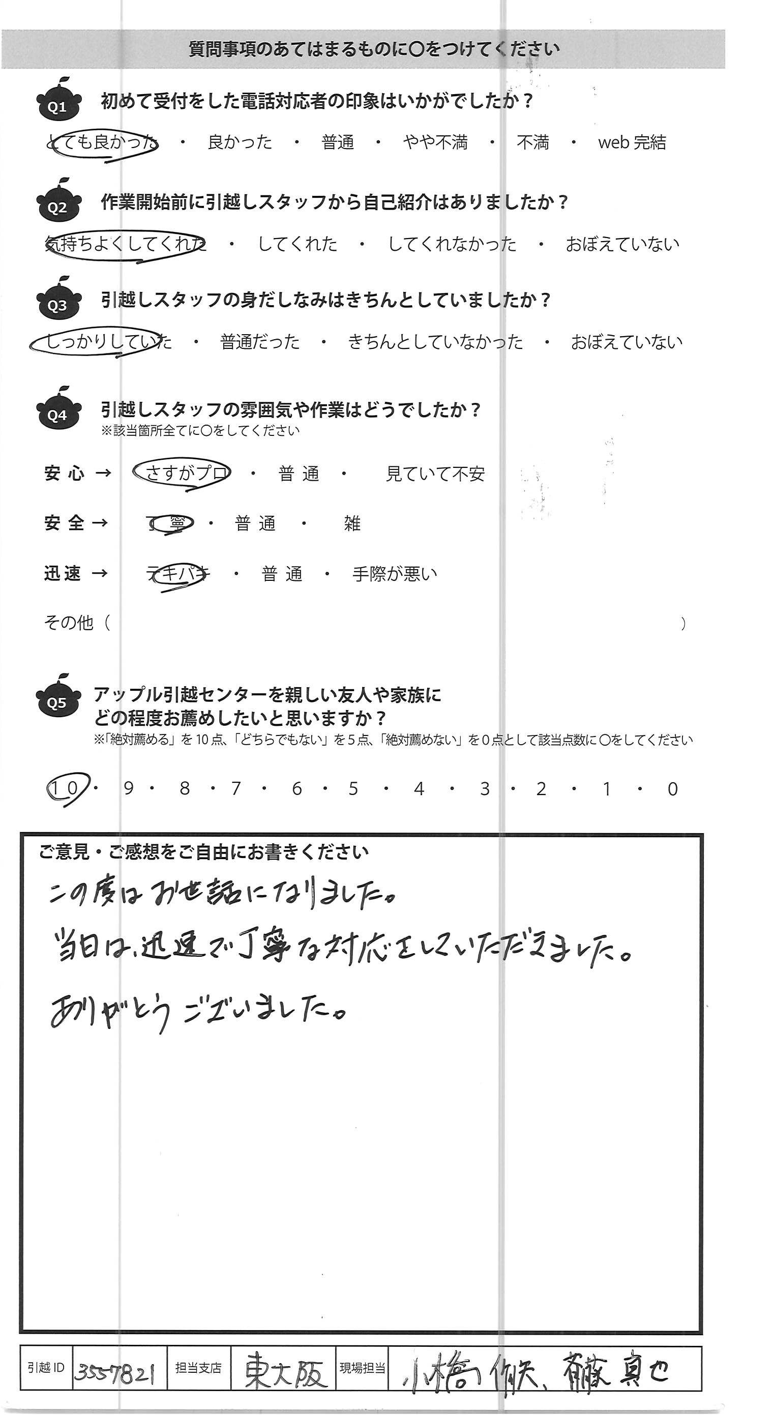 A.速すぎて、自分が本当に引越しをしているのか 忘れてしまうくらいスピーディーでした。 こちらの不手際で面倒をかけてしまったが、 不用品(ダンボール)を回収してくれたりと、 サービス精神に感動した! 今後引越しをする際も、是非利用したいです! 本当にありがとうございました!! お世話になりました!