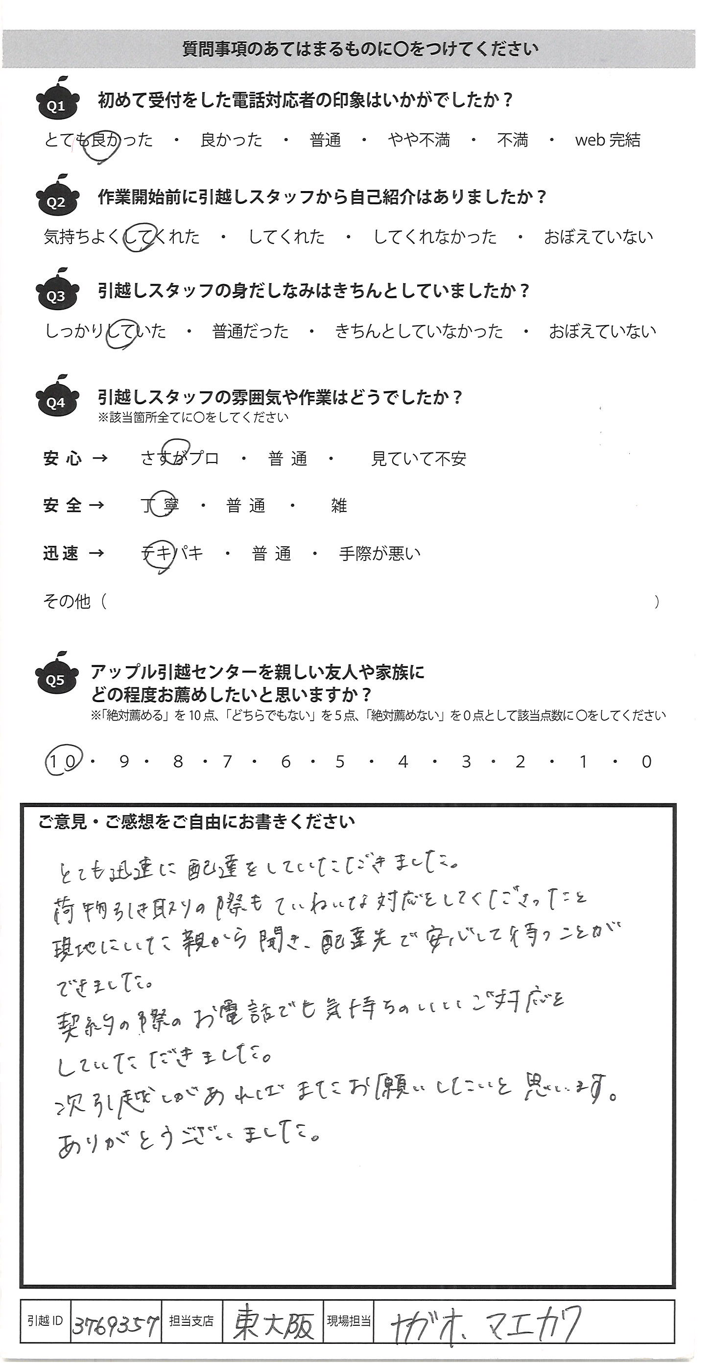 A.とても迅速に配達をしていただきました。 荷物引き取りの際もていねいな対応をしてくださったこと 現地にいた親から聞き、配達先で安心して待つことが できました。 契約の際のお電話でも気持ちのいいご対応を していただきました。 次引越しがあればまたお願いしたいと思います。 ありがとうございました。
