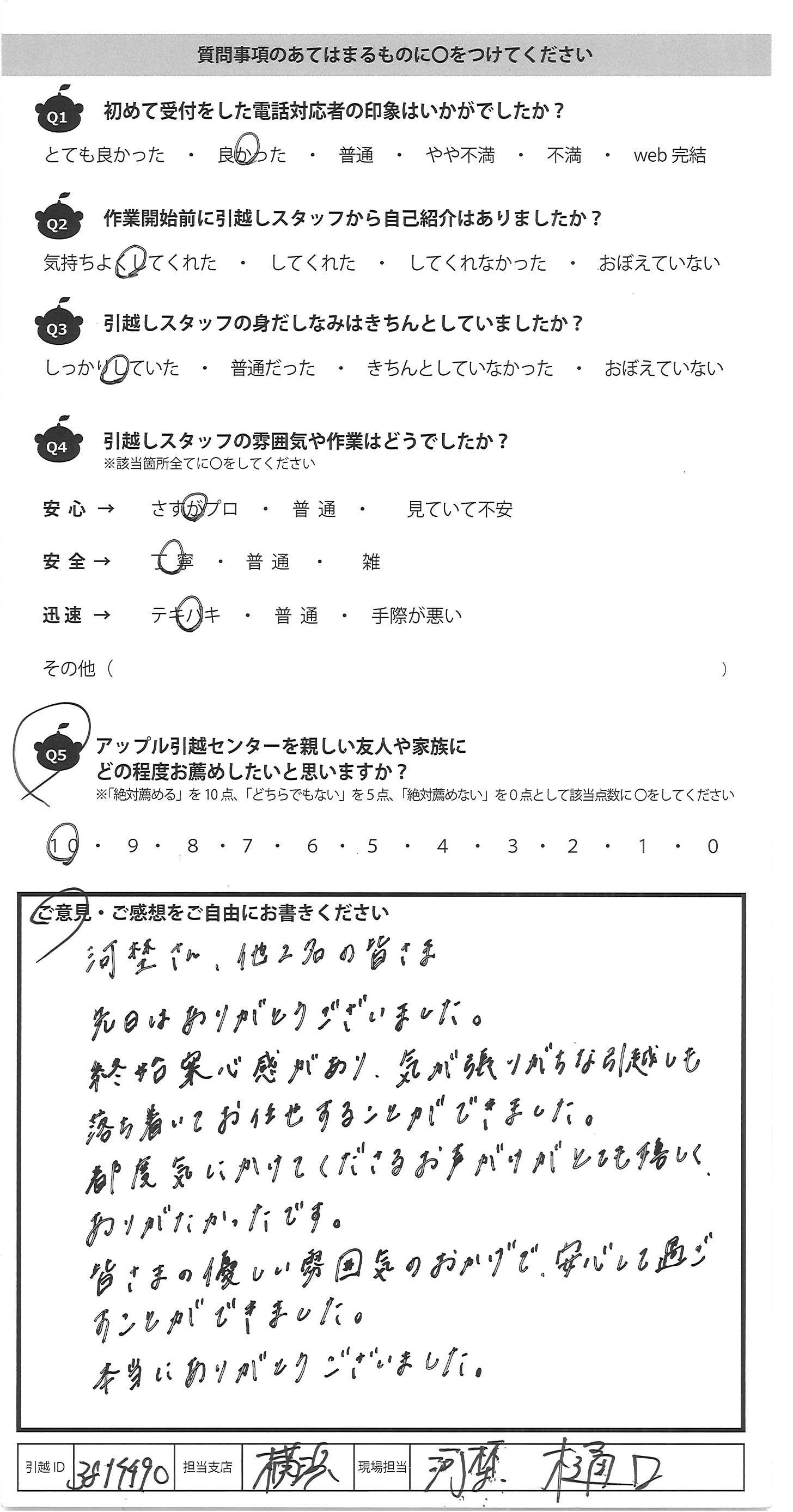 A.河埜さん、他2名の皆さま 先日はありがとうございました。 終始安心感があり、気が張りがちな引越しも 落ち着いてお任せすることができました。 都度気にかけてくださるお声がけがとても嬉しく、 ありがたかったです。 皆さまの優しい雰囲気のおかげで、安心して過ご すことができました。 本当にありがとうございました。