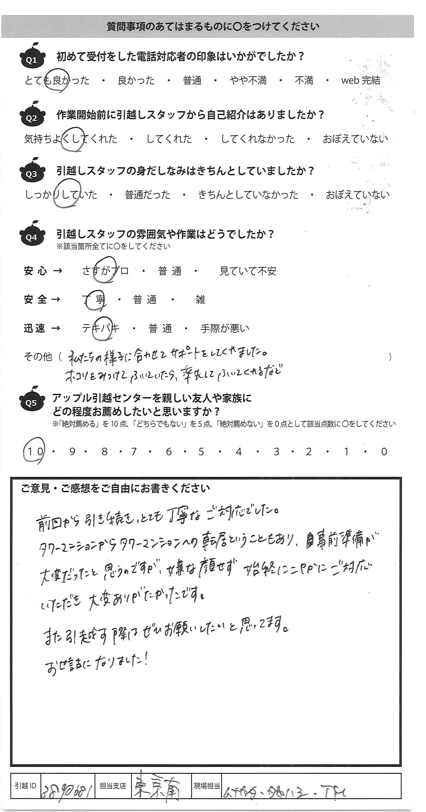 A.前回から引き続き、とても丁寧なご対応でした。 タワーマンションからタワーマンションの転居ということもあり、事前準備が 大変だったと思うのですが、嫌な顔せず終始にこやかにご対応 いただき大変ありがたかったです。 また引越す際はぜひお願いしたいと思ってます。 お世話になりました!