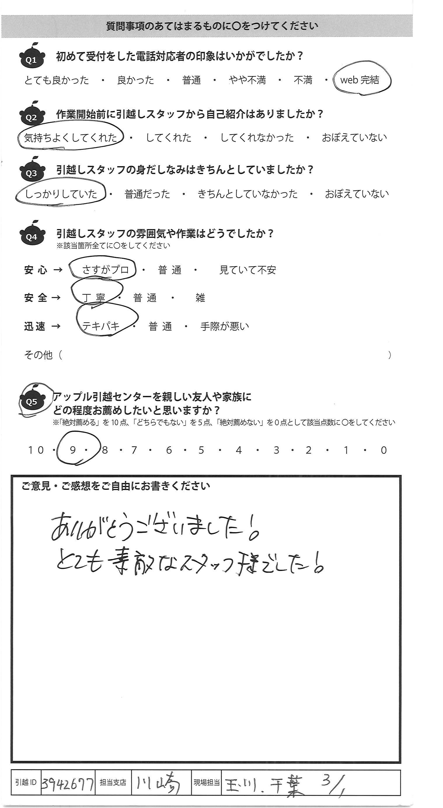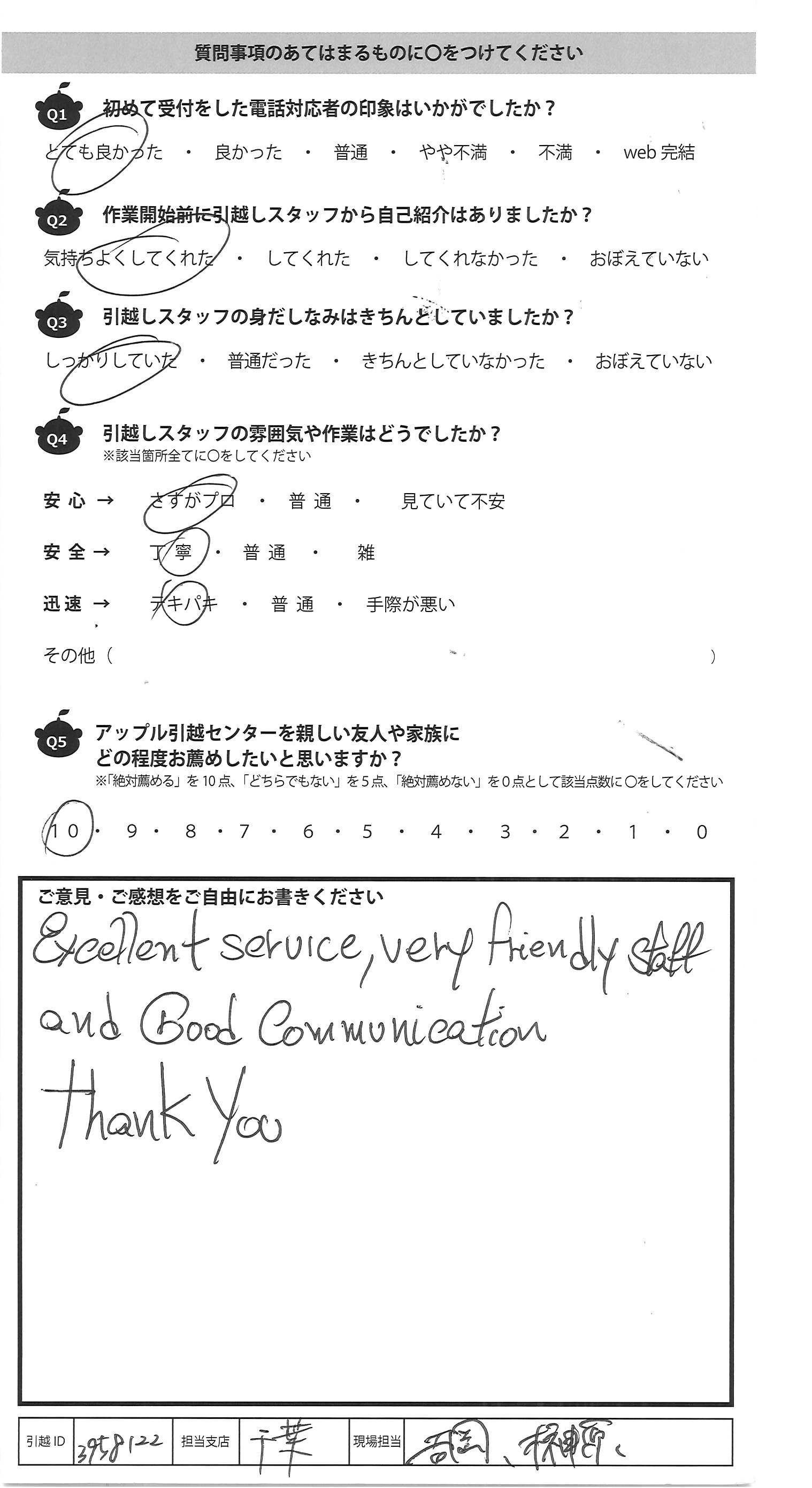 A.また引越しをする際は、絶対にアップルさんにお願 いしようと思います。 親切なご対応ありがとうございました。