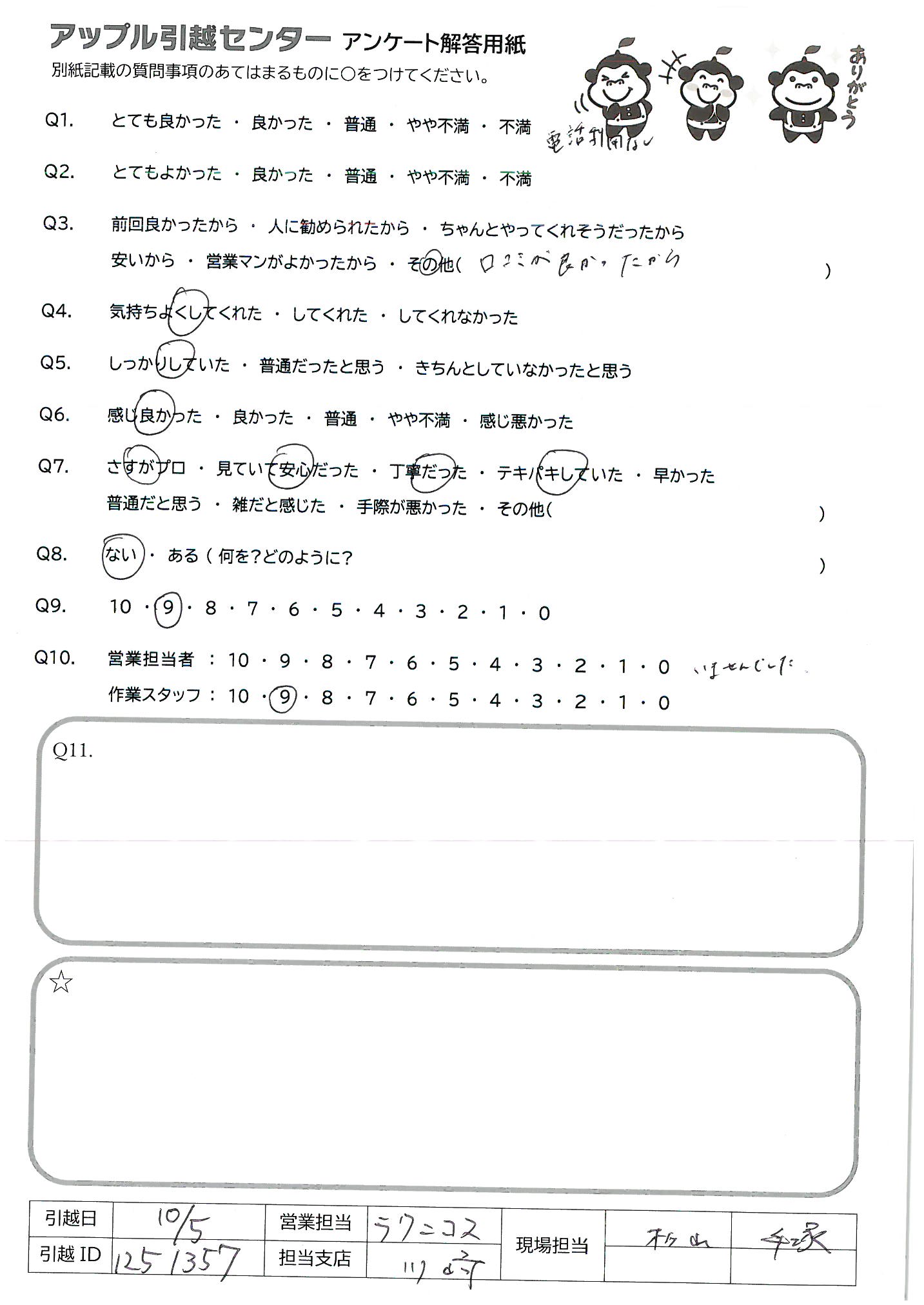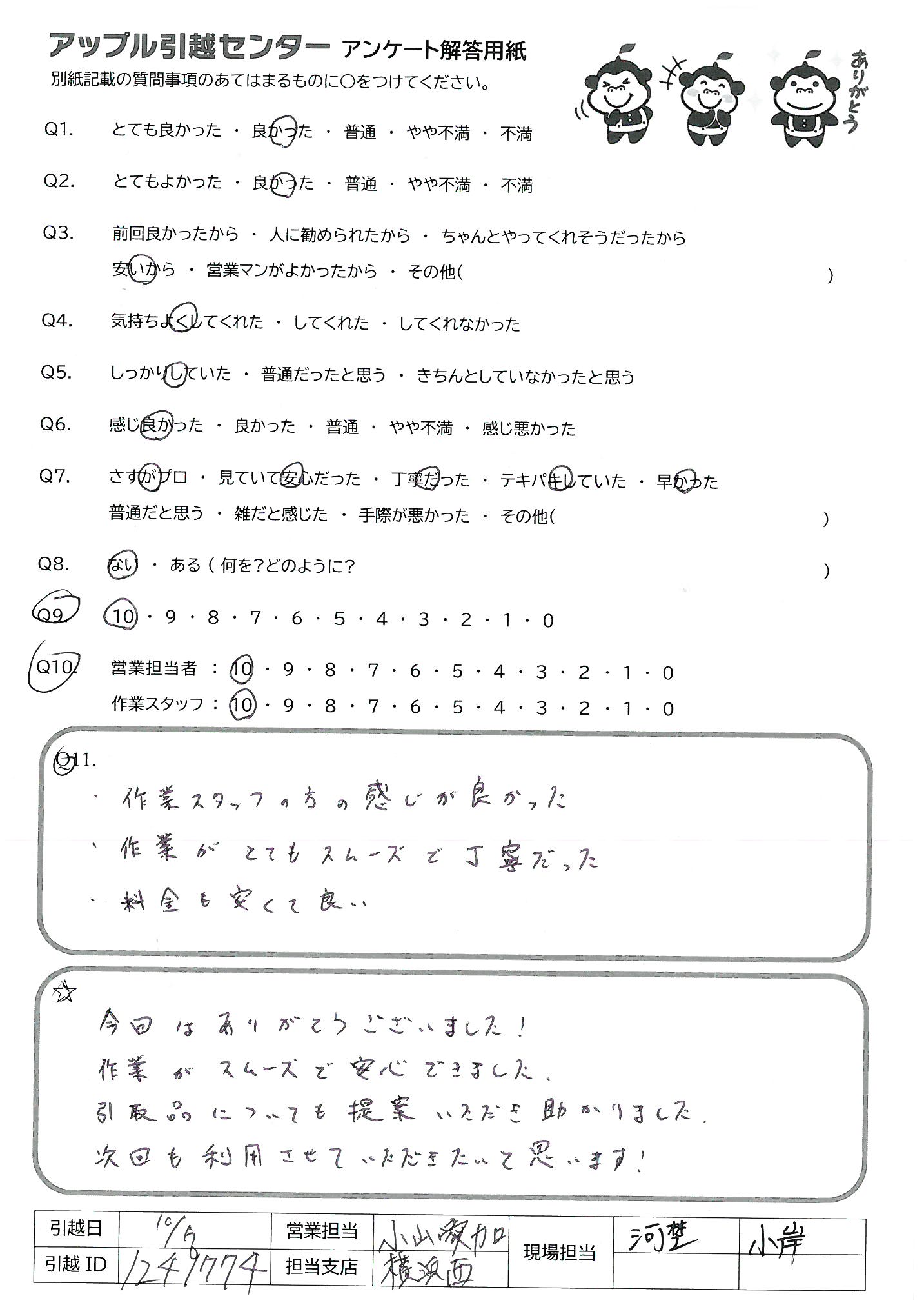 A.特に良く、テキパキしていて親切であった 見積りが一括だったので他社から色々いわれたがゴミ屋しきからの引越しだったのでまいったと思ったが、 これなら新居への大事な引越しもできると思った とくに現場担当の方感謝は