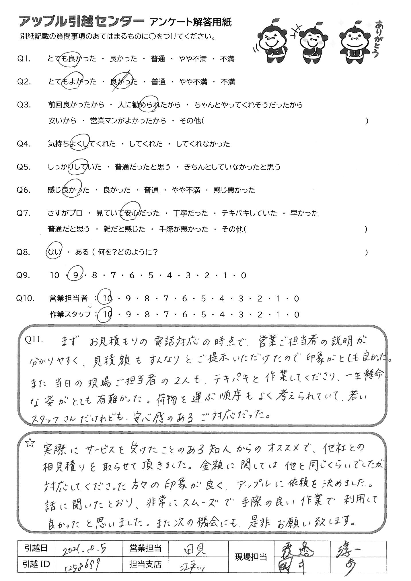 A.まずお見積もりの電話対応の時点で、営業ご担当者の説明が分かりやすく、見積額もすんなりとご提示いただけたので印象がとても良かった。 また当日の現場ご担当者の2人もテキパキと作業してくださり、一生懸命な姿がとても有難かった。荷物を運ぶ順序も良く考えられていて、若いスタッフさんだけれども、安心感のあるご対応だった。