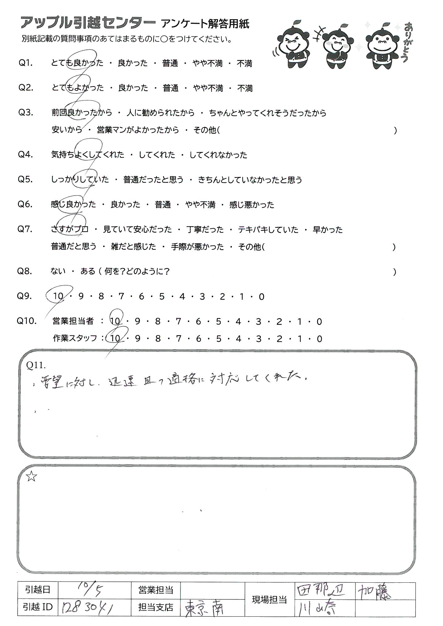 引越し日:2021年10月05日 エリア:神奈川県川崎市中原区