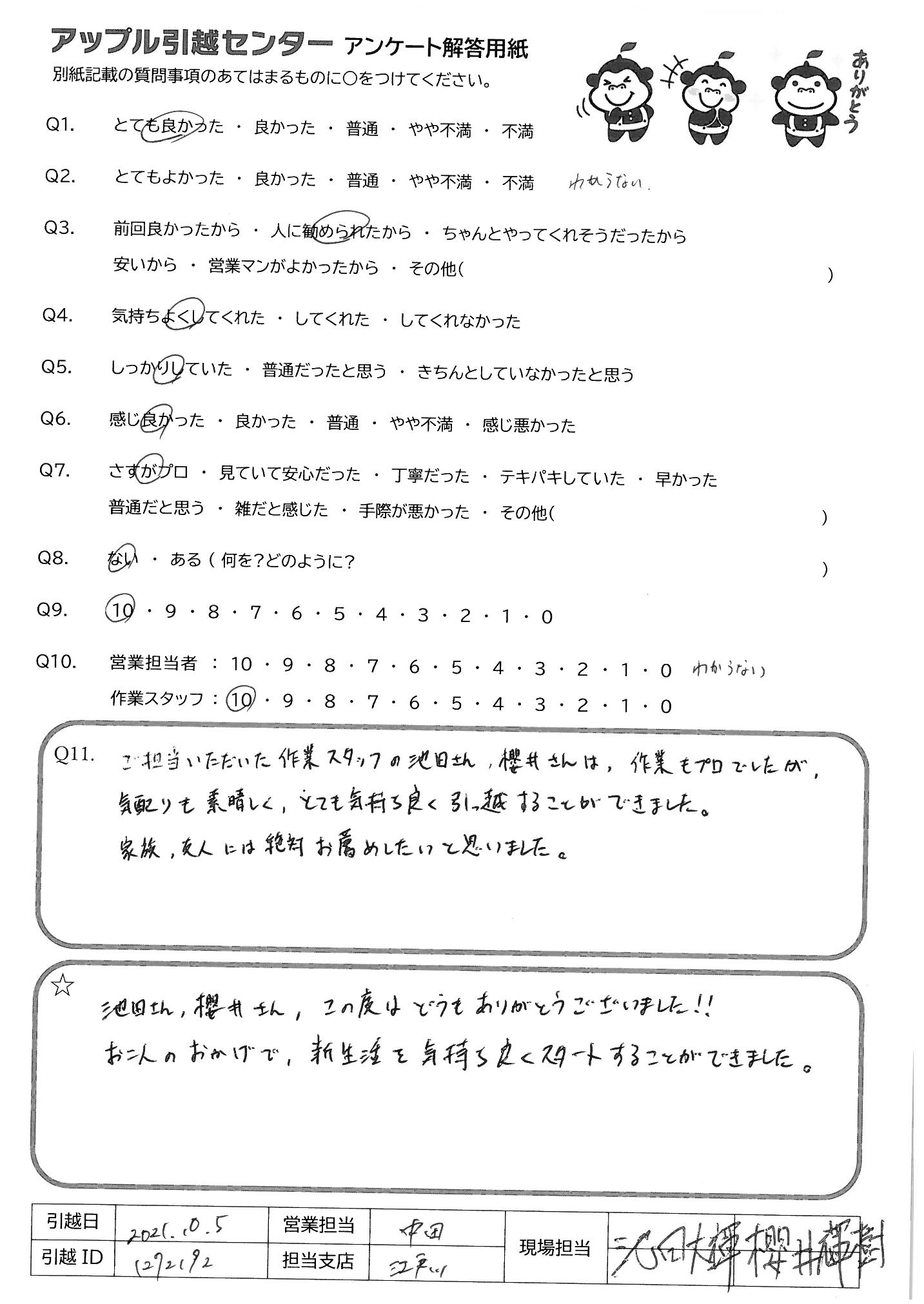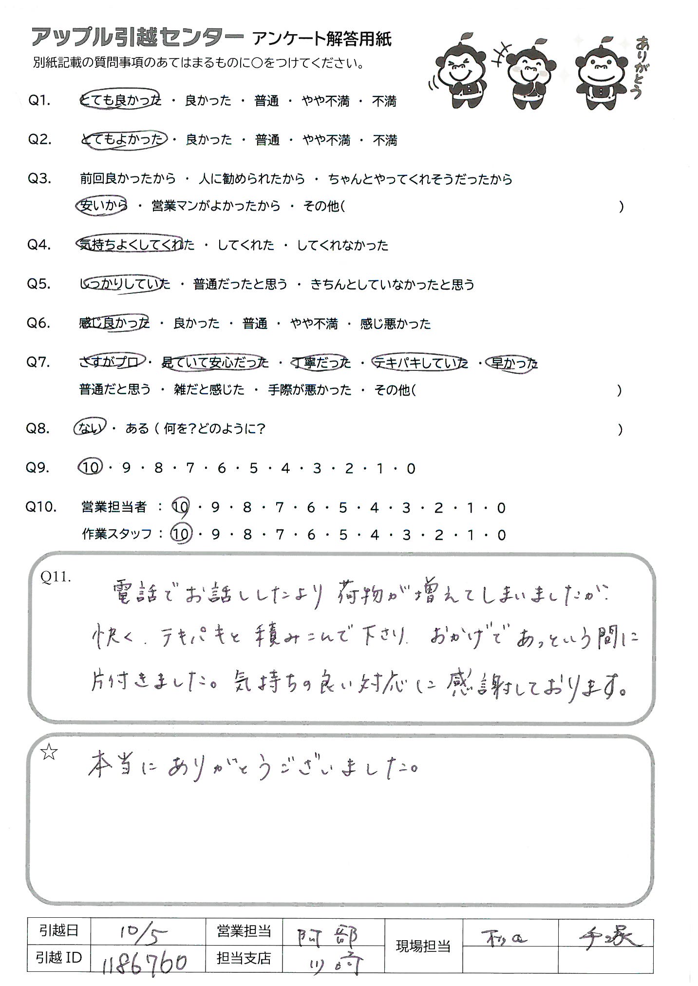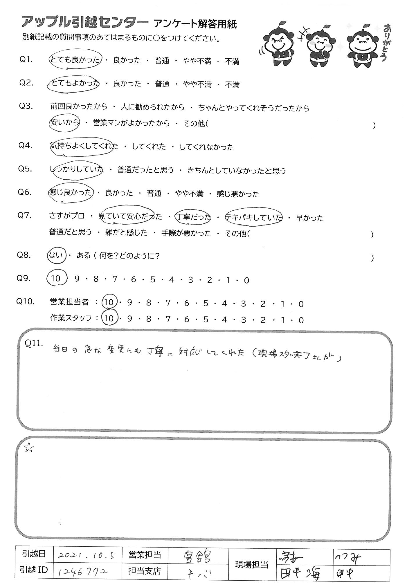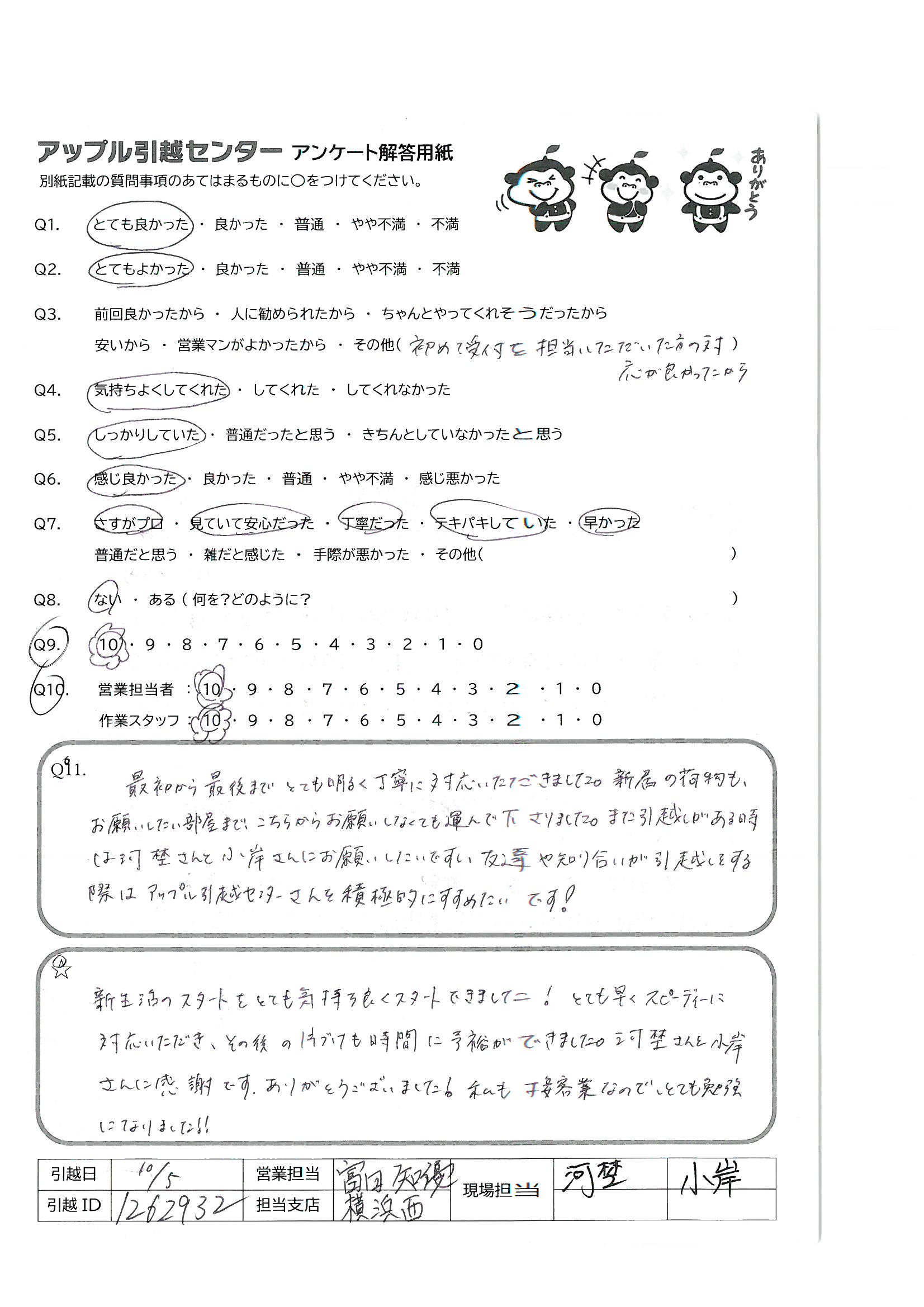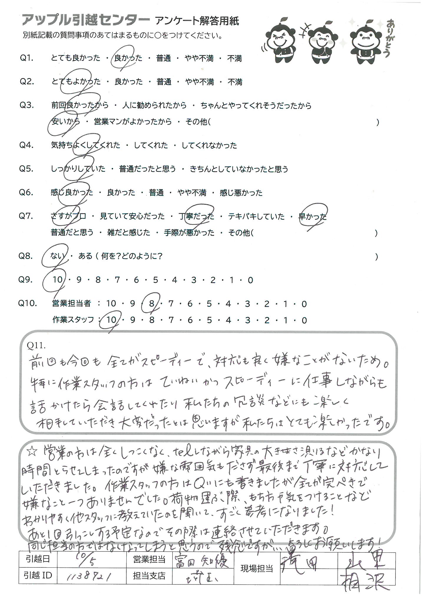 A.今後も引越しをする際はアップル引越しセンター様にお願いしたいです。 本当にありがとうございました。 今後ともよろしくお願い致します。