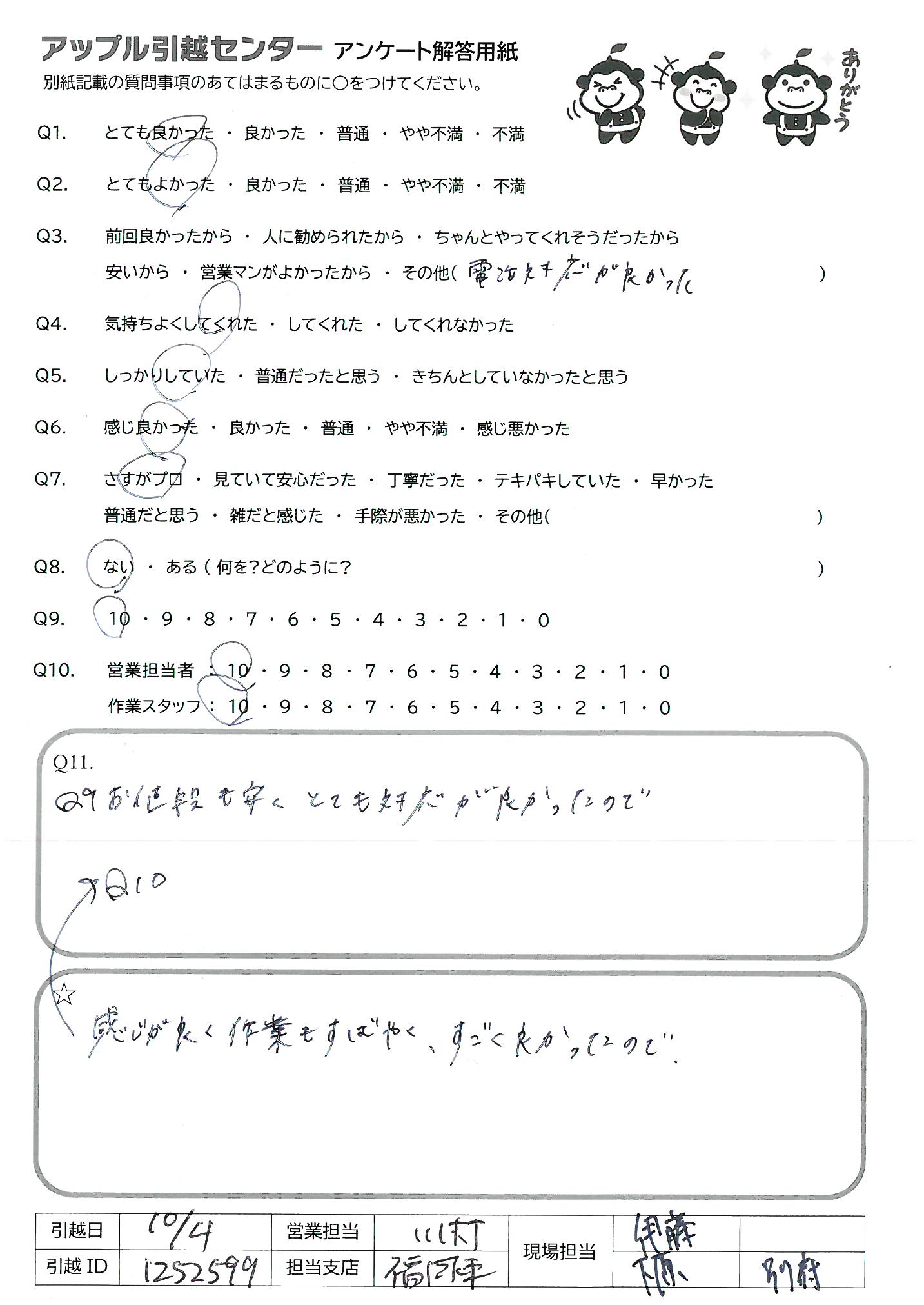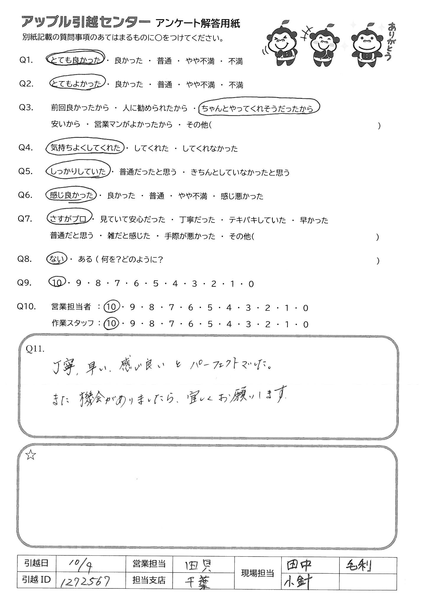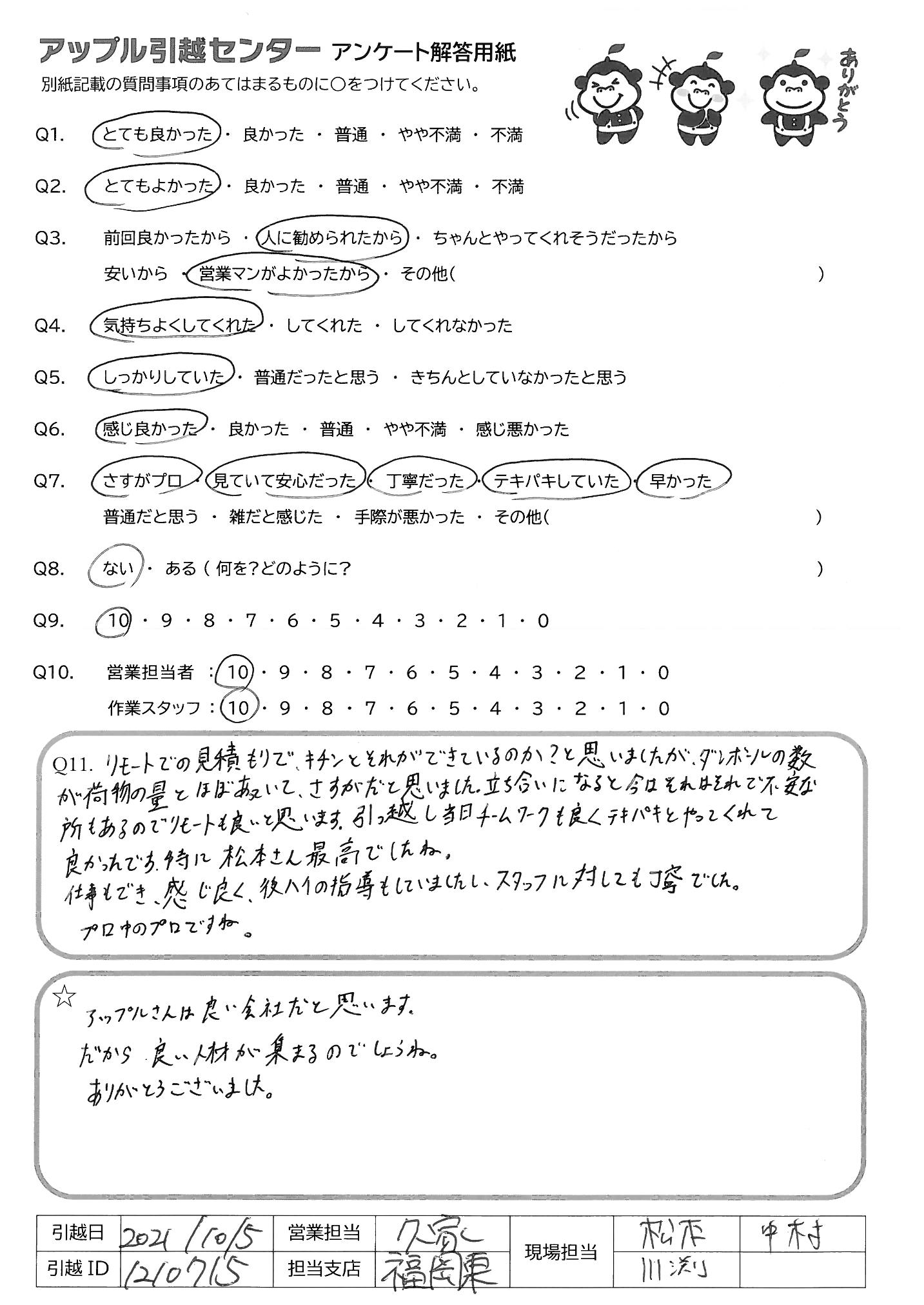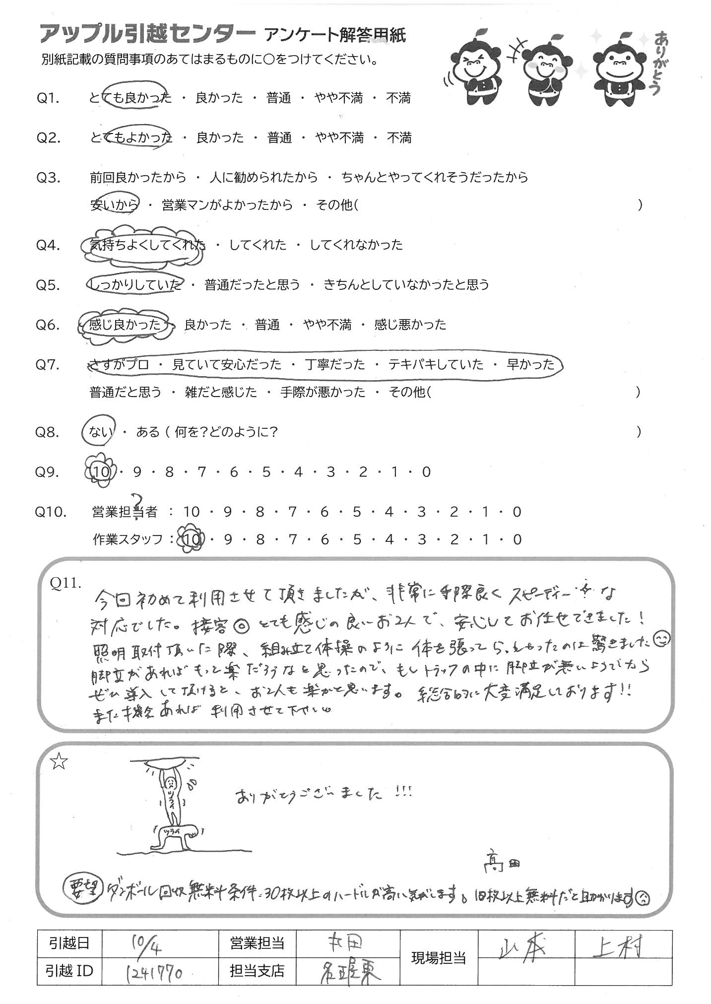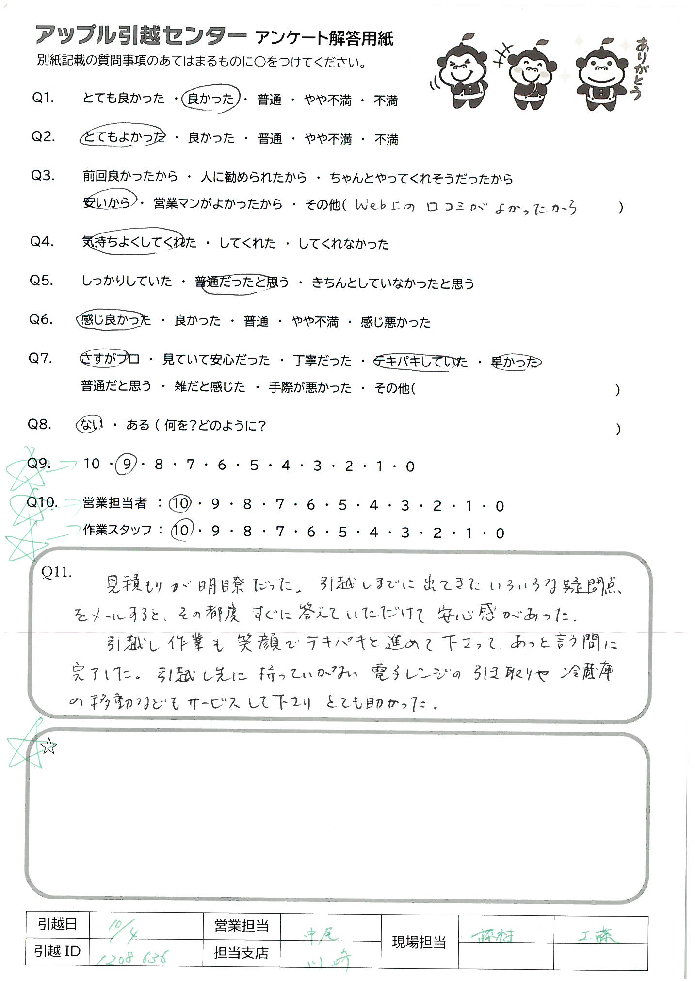 A.今後も引越しをする際はアップル引越しセンター様にお願いしたいです。 本当にありがとうございました。 今後ともよろしくお願い致します。