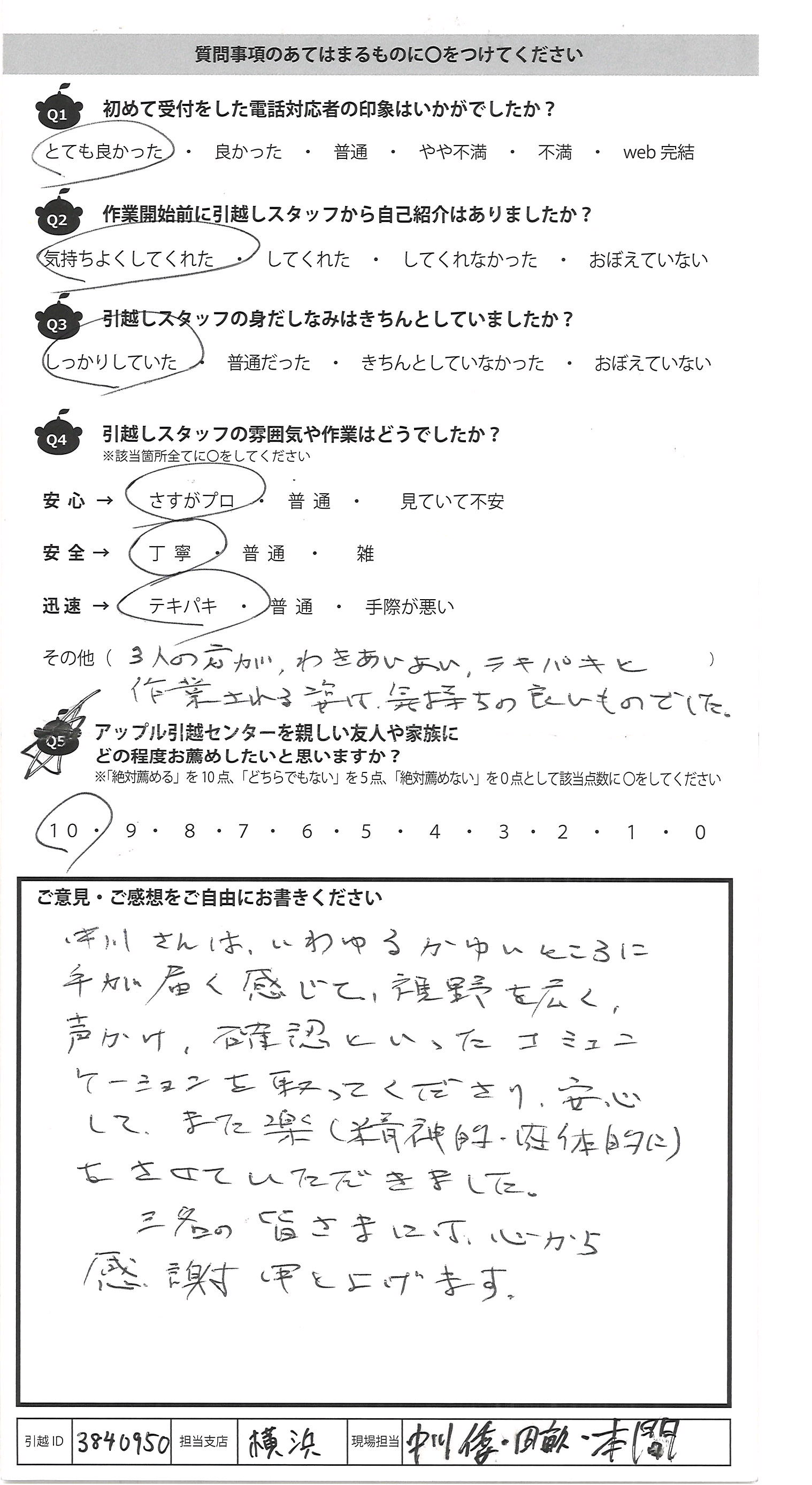 アップル引越センターでは、面映いお褒めの言葉も、胸に突き刺さるお叱りのコメントも、