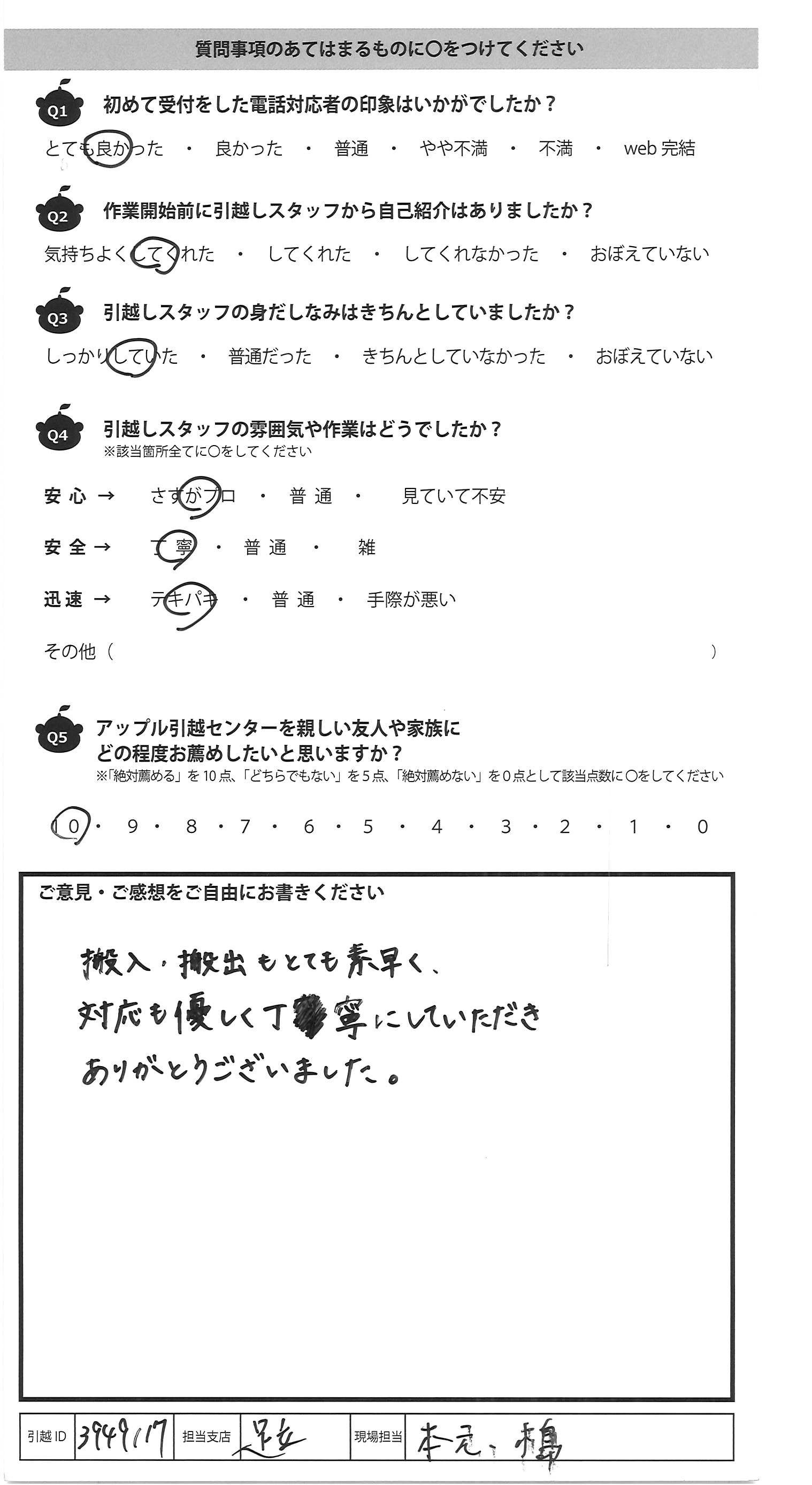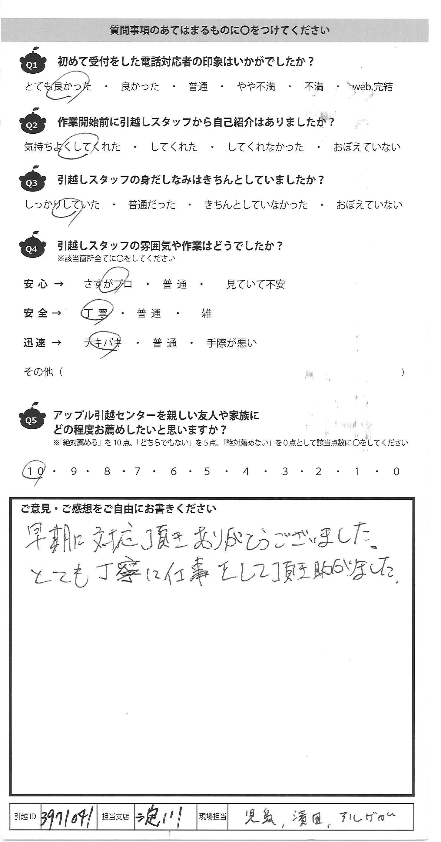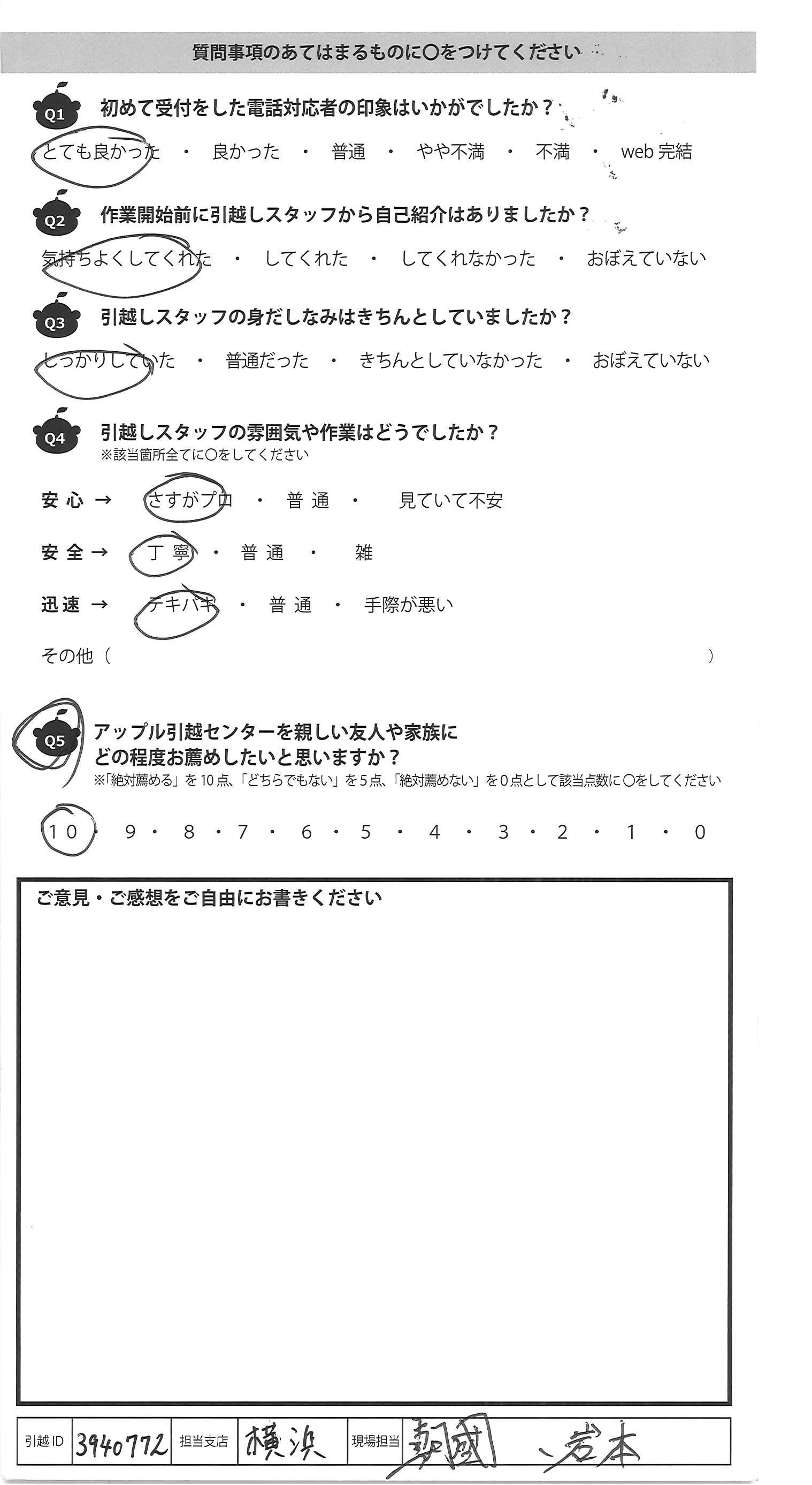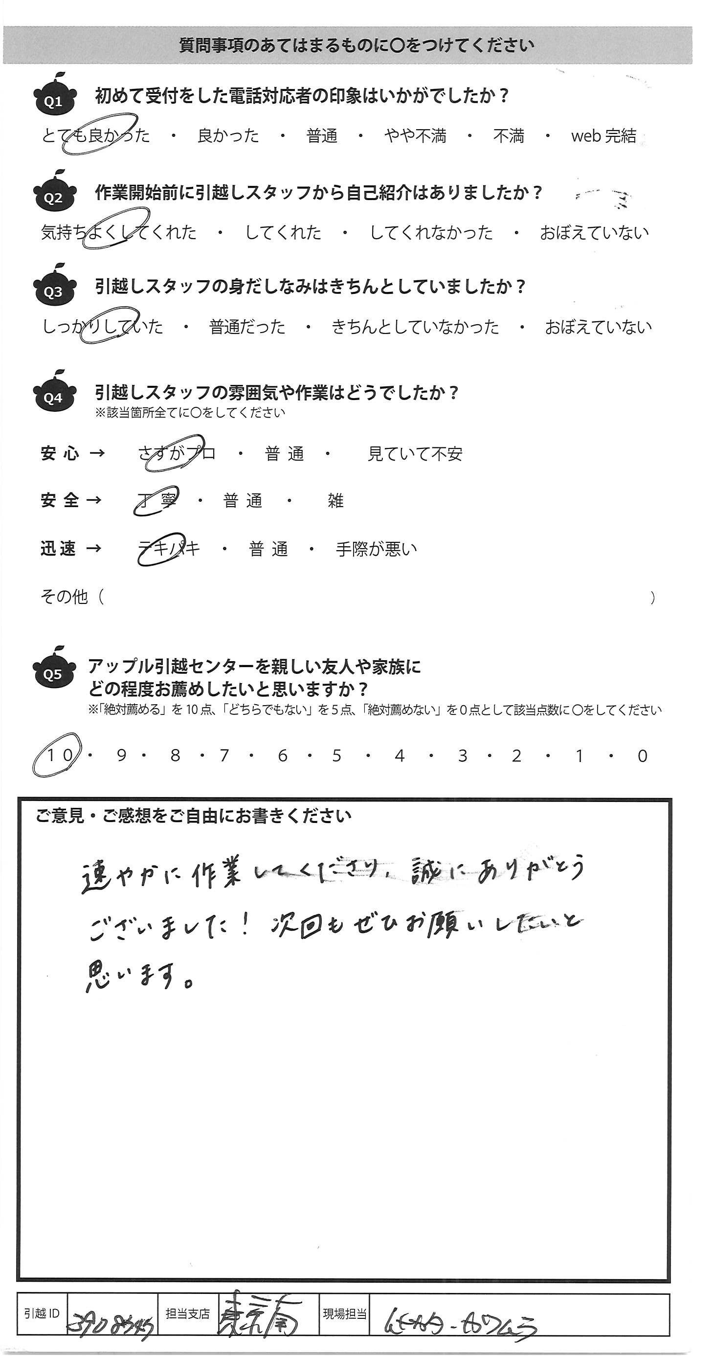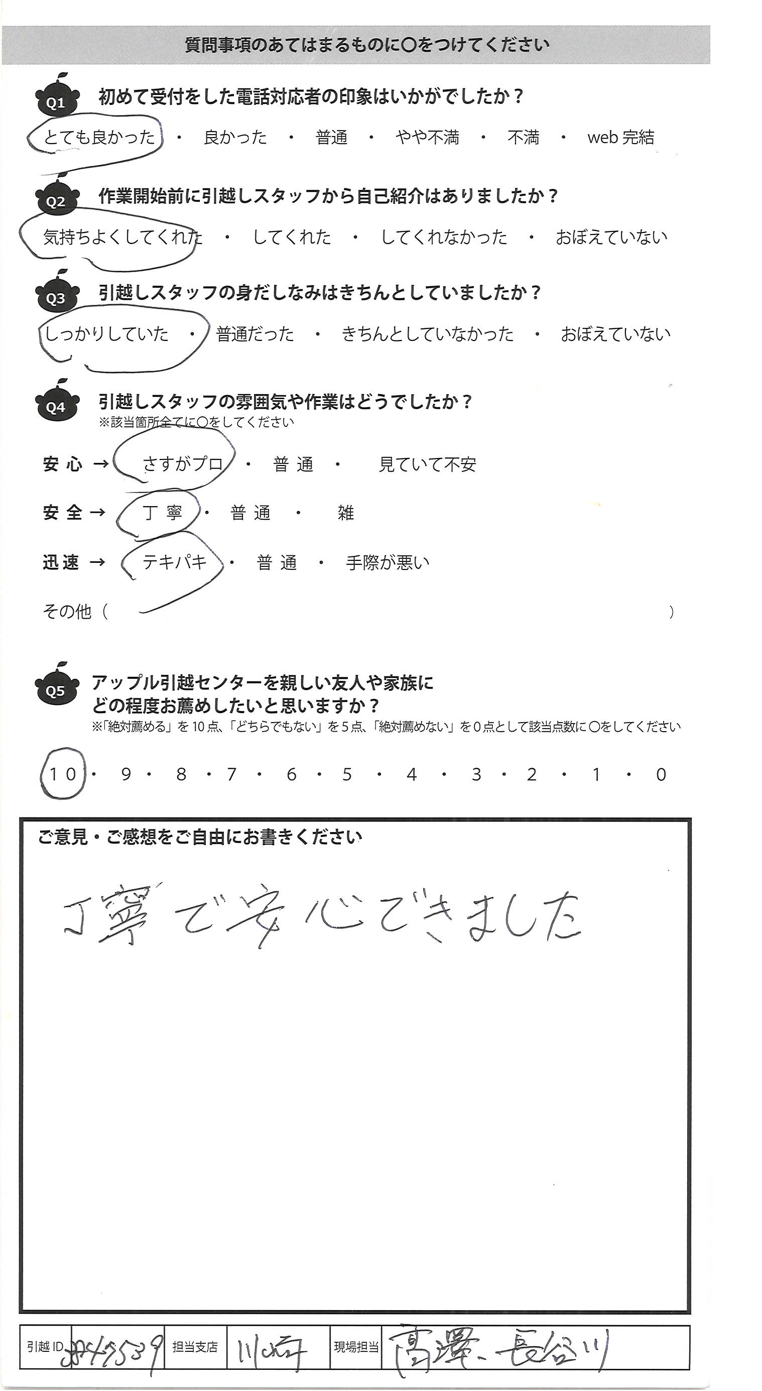 A.見積もり時から丁寧に対応していただき、引っ越し中も 明るく丁寧に対応していただきました。ありがとう ございました。