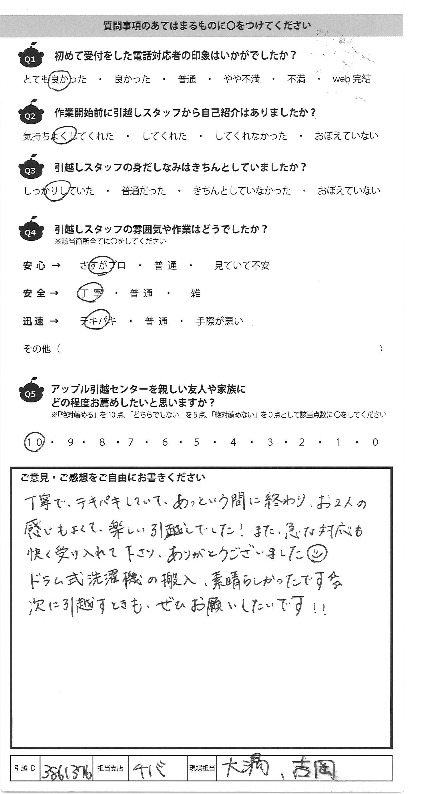 A.丁寧で、テキパキしていて、あっという間に終わり、お2人の 感じもよくて、楽しい引越しでした!また、急な対応も 快く受け入れて下さり、ありがとうございました ドラム式洗濯機の搬入、素晴らしかったです 次に引越すときも、ぜひお願いしたいです!!