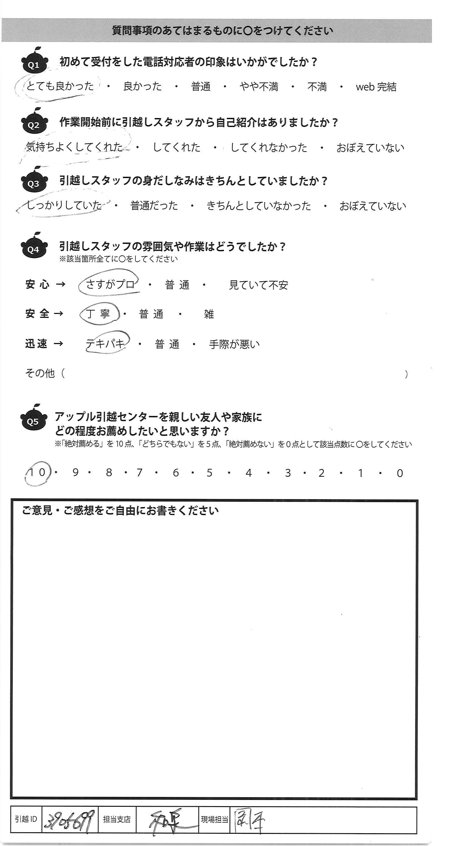 A.今回アップルさんを利用させていただくのは 2回目でしたが、前回同様、担当スタッフさんの 感じがとてもよくて、てきぱきと運んでいただきました。 また次回もアップルさんにお願いしたいと 思いました。 ありがとうございました。