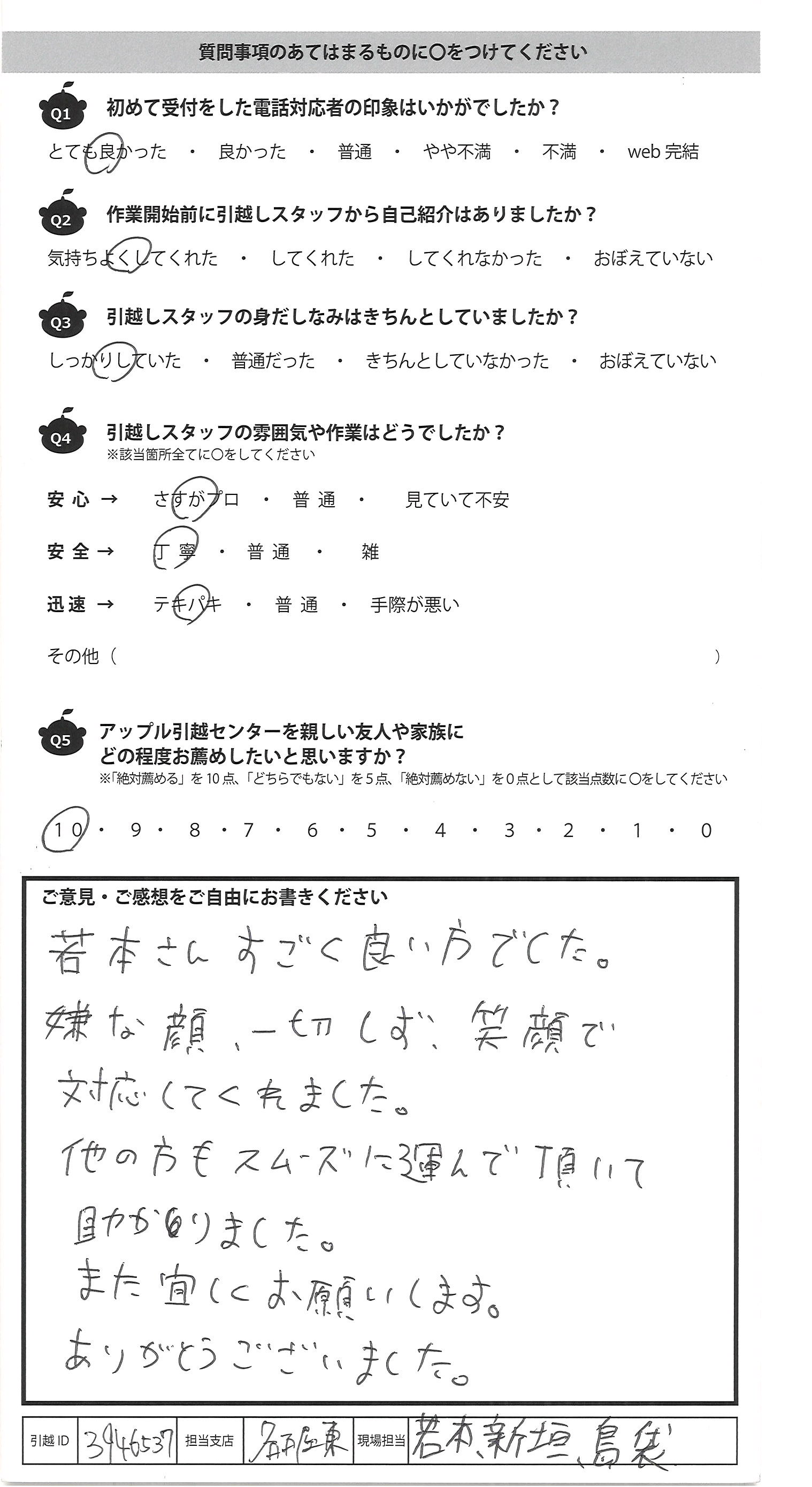 A.若本さんすごく良い方でした。 嫌な顔、一切しず、笑顔で 対応してくれました。 他の方もスムーズに運んで頂いて 助かりました。 また宜しくお願いします。 ありがとうございました。