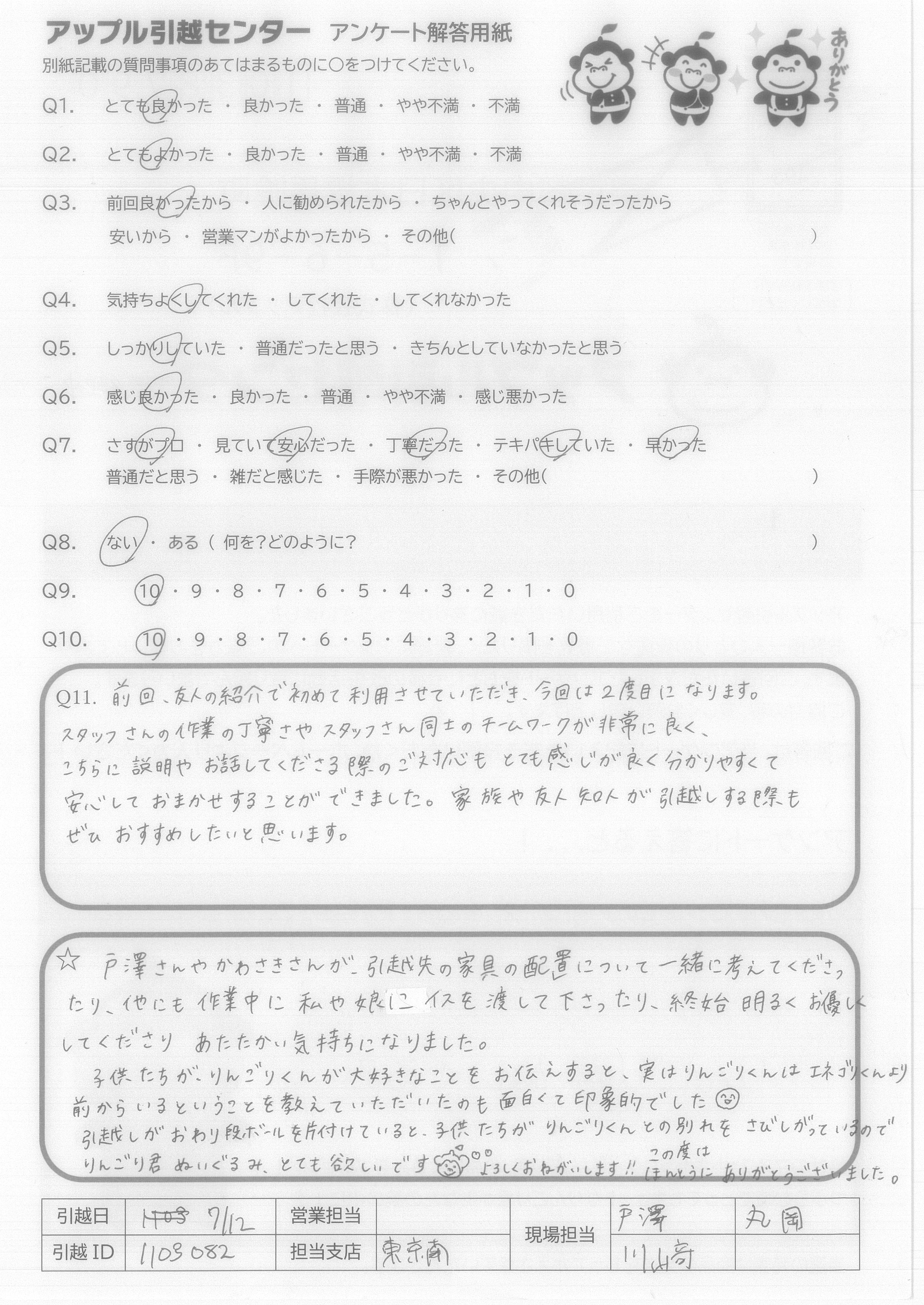 A.戸澤さんやかわさきさんが、引越先の家具の配置について一緒に考えてくださったり、他にも作業中に私や娘にイスを渡して下さったり、終始明るくお優しくしてくださりあたたかい気持ちになりました。 子供たちが、りんごりくんが大好きなことをお伝えすると、実はりんごりくんはエネゴリくんより前からいるということを教えていただいたものも面白くて印象的でした 引越しがおわり段ボールを片付けていると、子供たちがりんごりくんとの別れをさびしがっているのでりんごり君ぬいぐるみ、とても欲しいです。よろしくおねがいします!!この度はほんとうにありがとうございました。