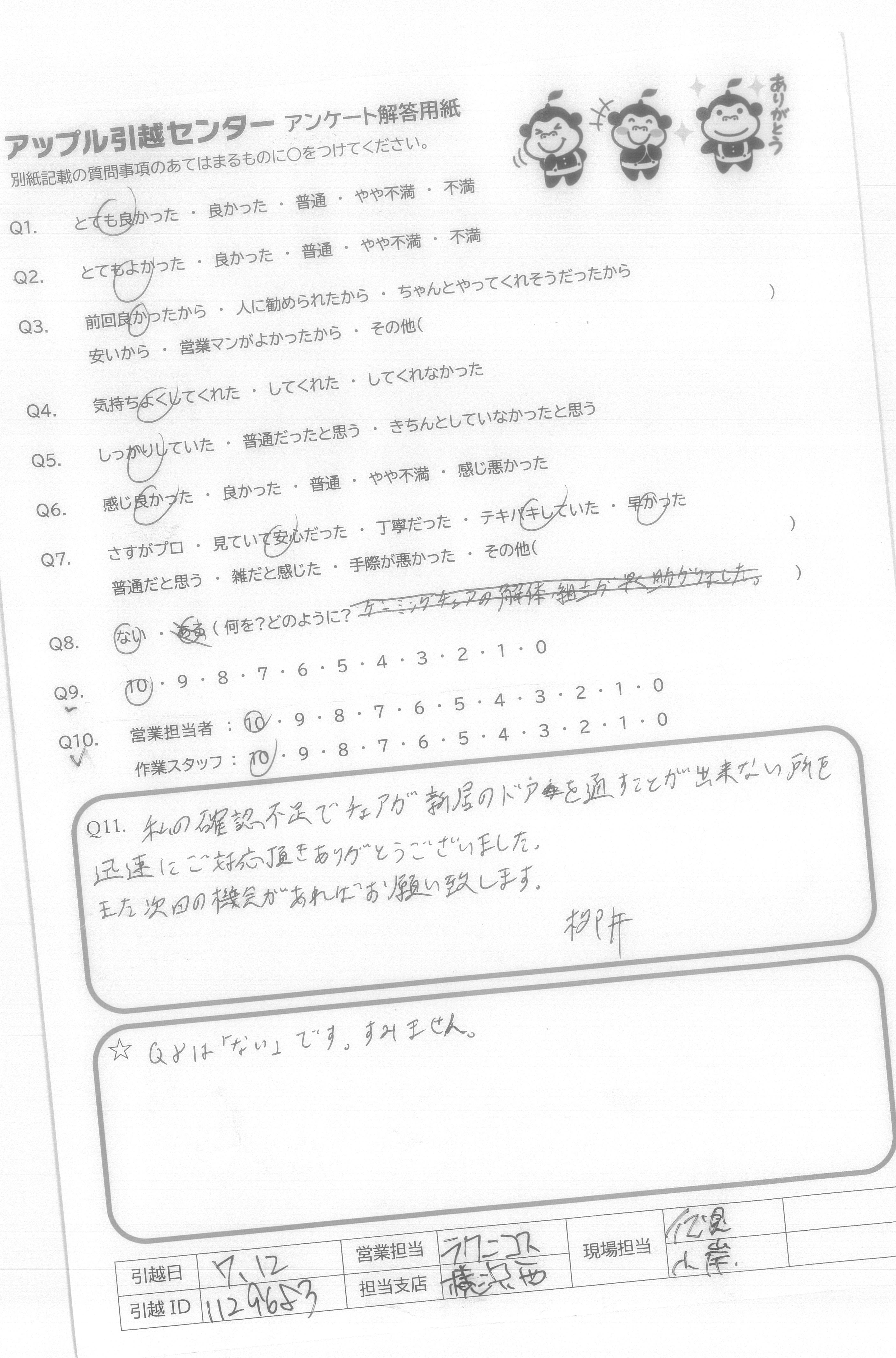 A.私の確認不足でしたが新居のドアを通すことが出来ない所を迅速にご対応頂きありがとうございました。 また次回の機会があればお願い致します。柳井