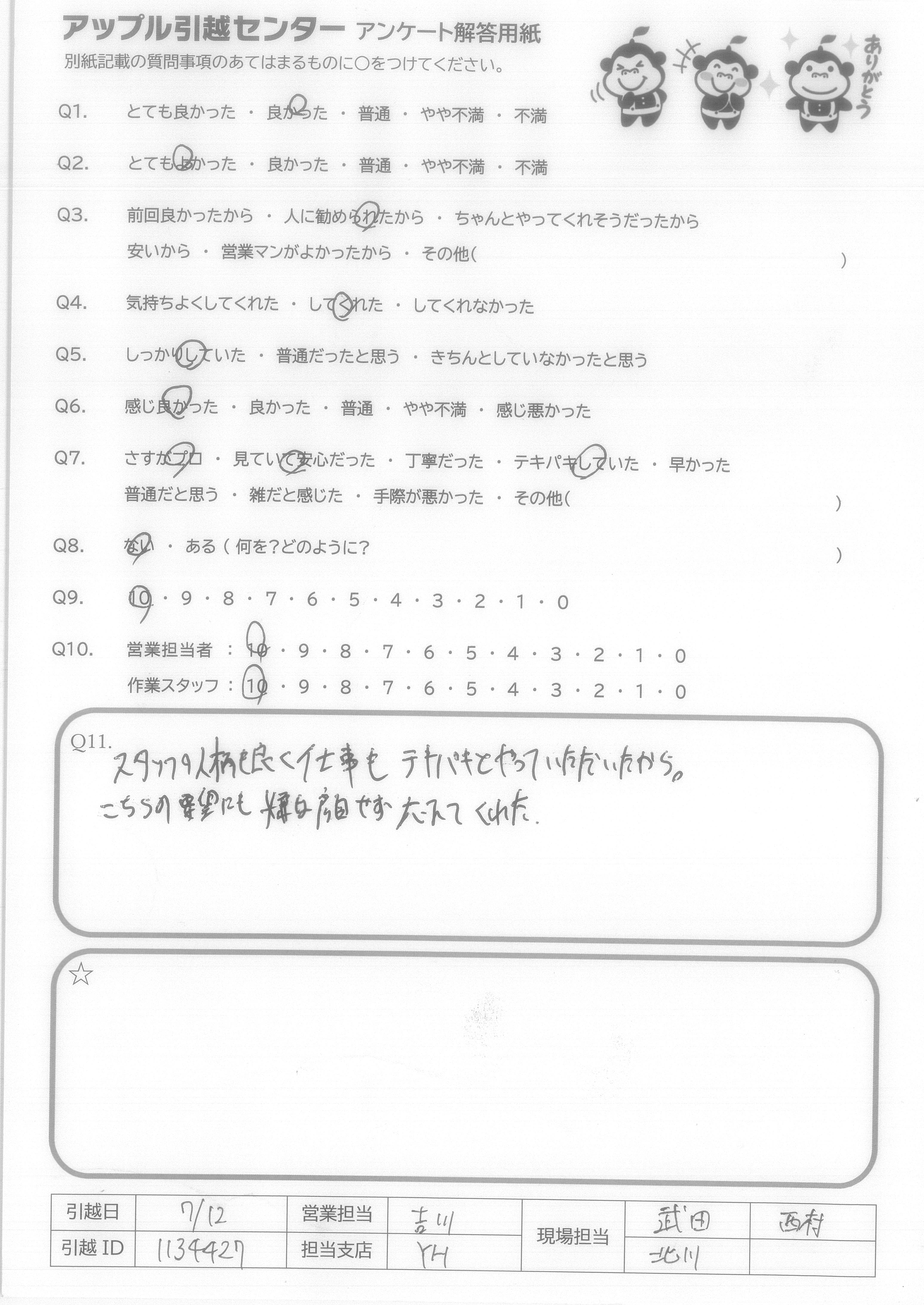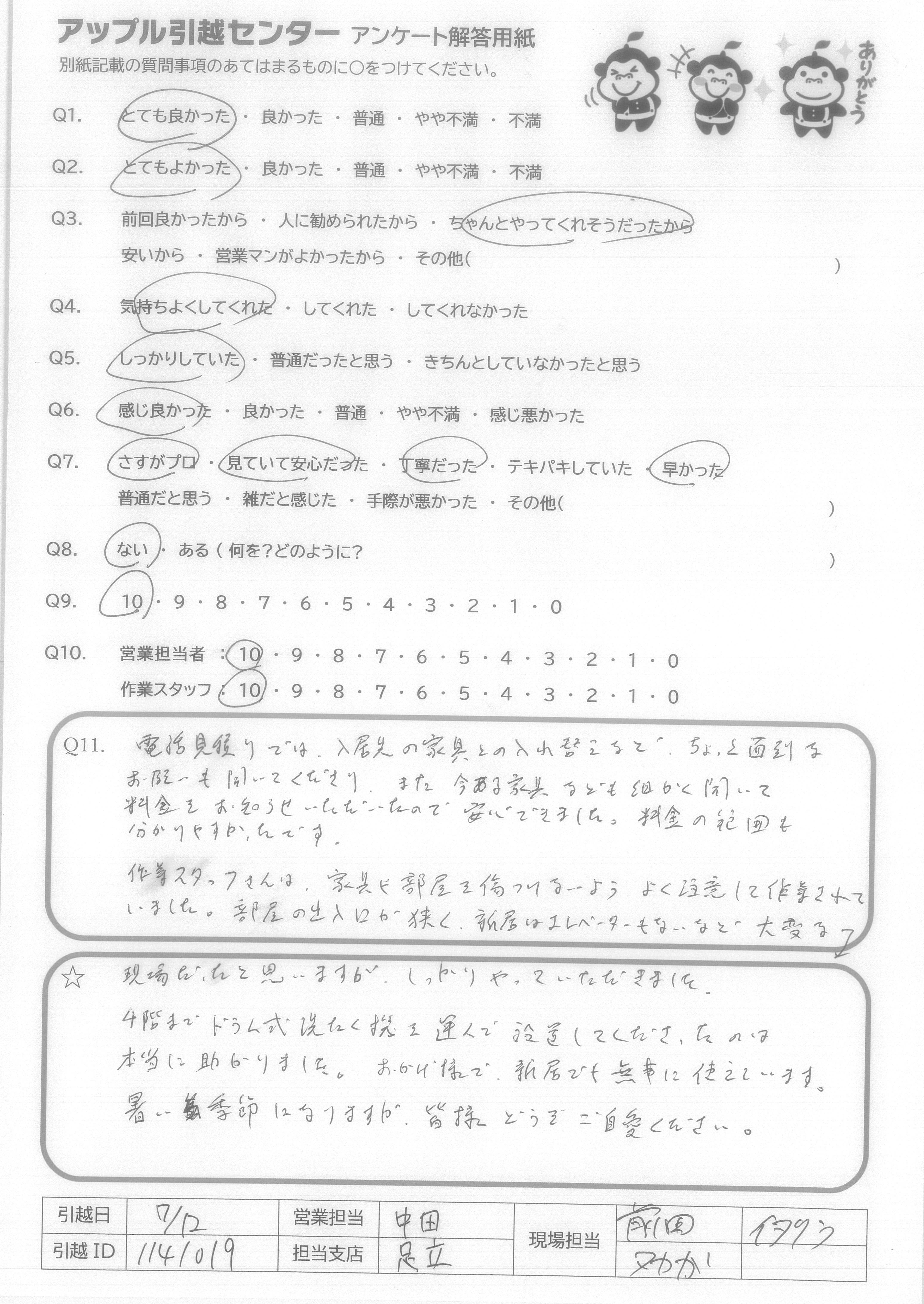A.はじめての単身での引っ越しで少し不安でしたが、担当して下さった方みなさん丁寧で感じが良く、安心してお願いすることができました。 暑い中、テキパキと荷物を運んで、冷蔵庫の足のゴムまでつけて下さり本当に感謝です。 ありがとうございました。 またよろしくお願いします。