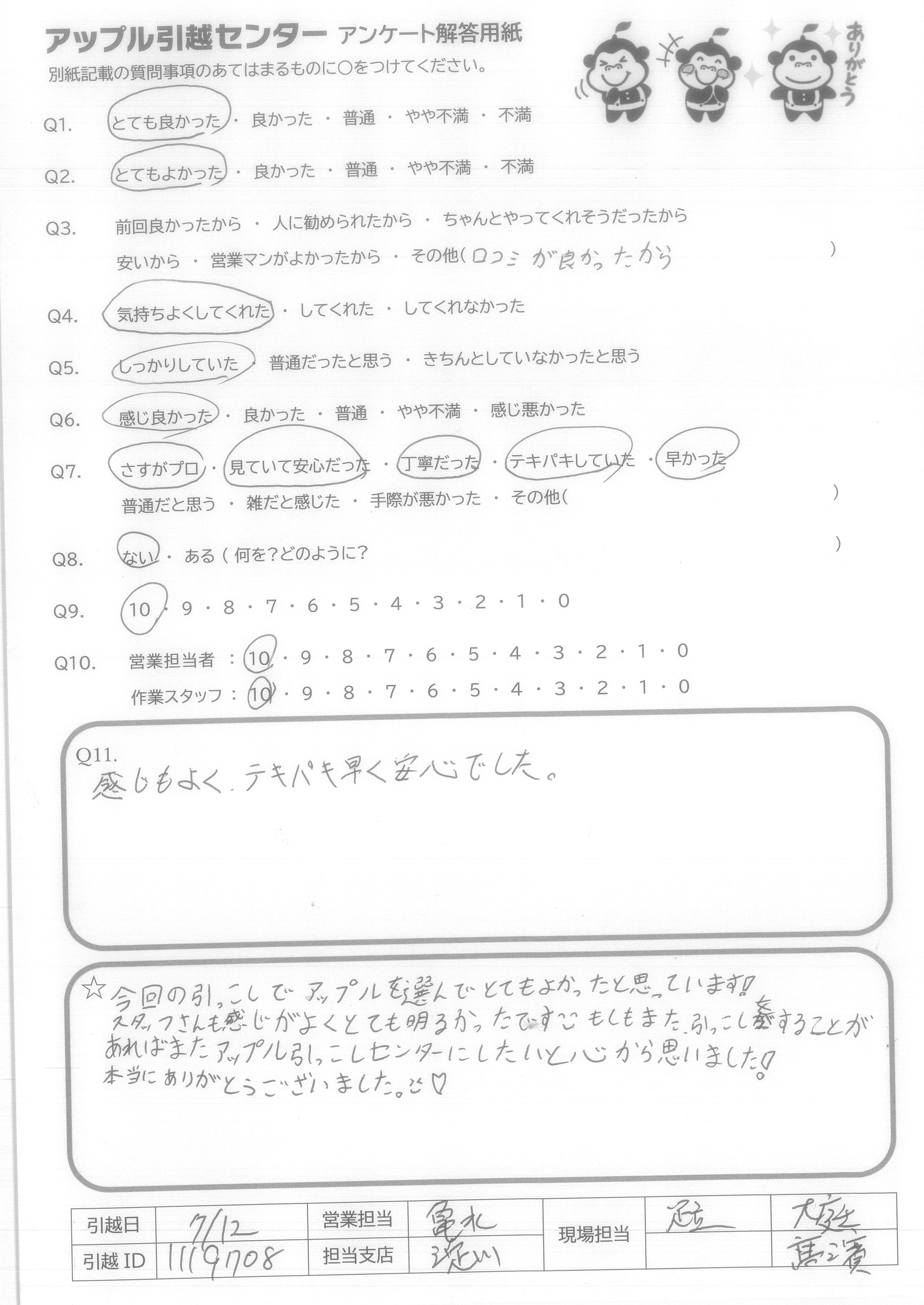 A.次回もし引越すことがあれば今回同様の営業さん、引越しスタッフさんなら安心だと思いました。過去に5社程、引越し業者さんに依頼した事があり、今回初めてアップルさんにお願いしましたが、良い引越しができて母共々大変満足しています。ありがとうございました。