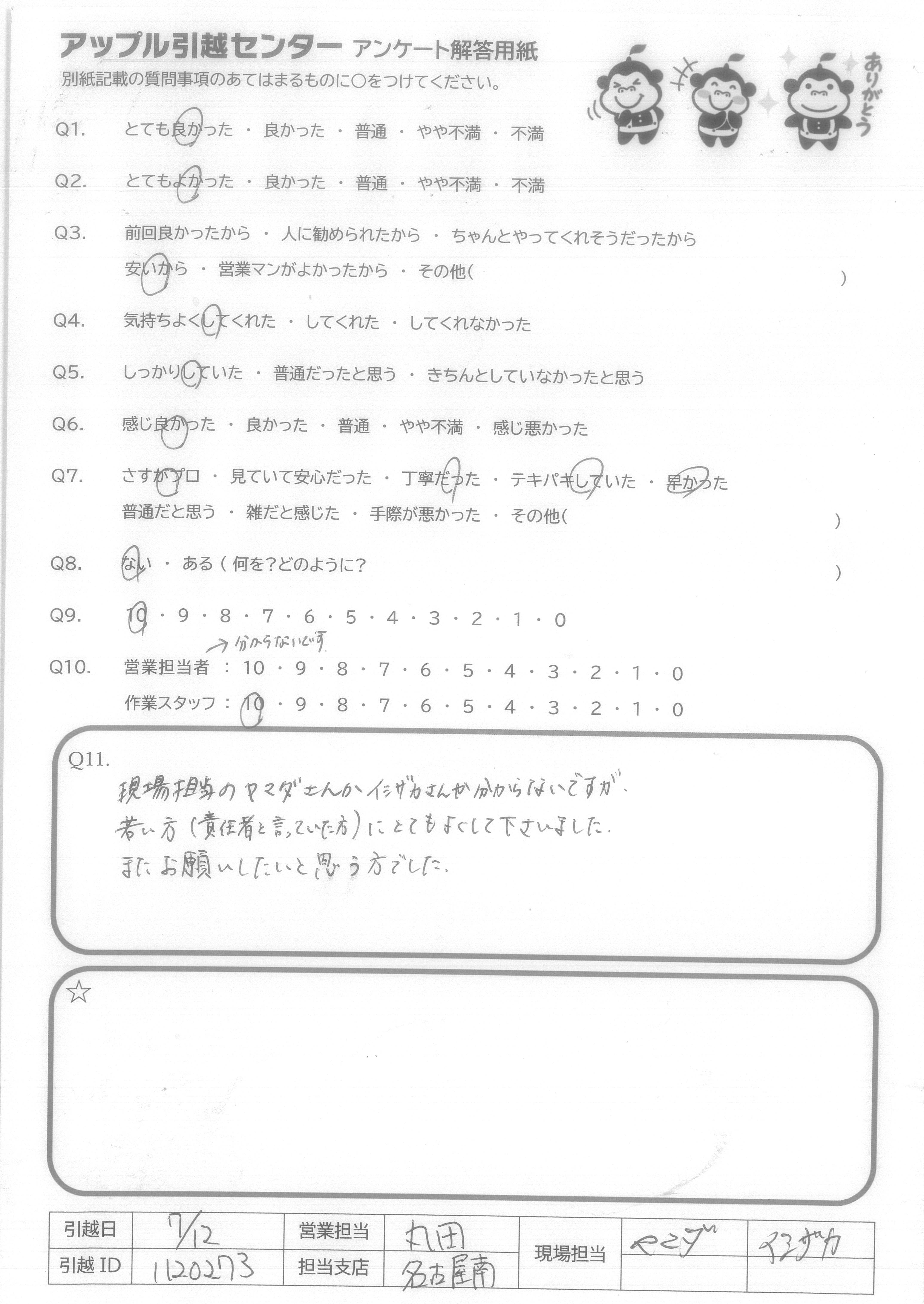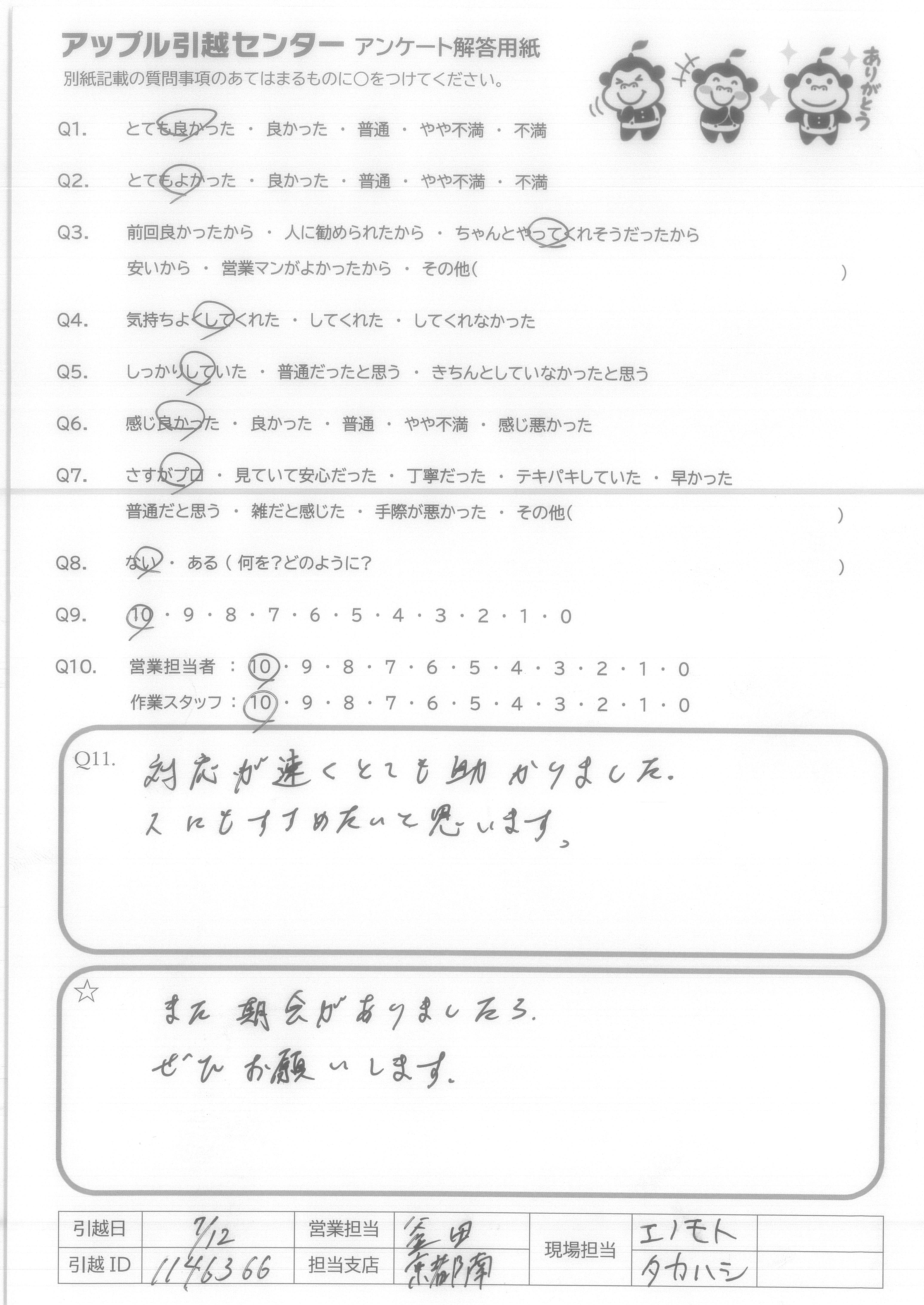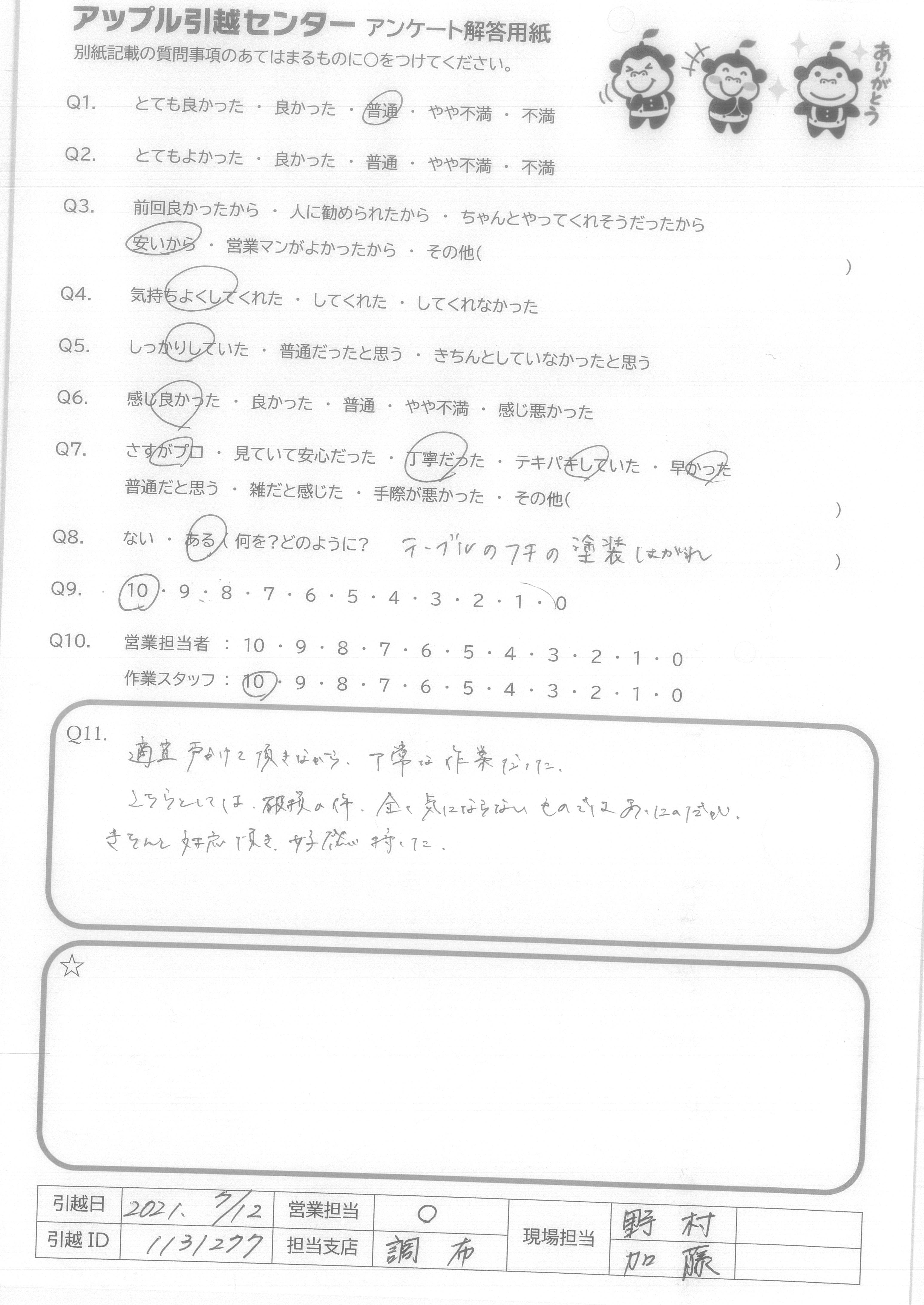 A.家の建て替えで6年以内に、母の家と私の家の引越しが3回あります。来年の6月7月には1回目の引越しがあるので、現場担当の西島さんと別府さんが来て頂くとうれしいです!!(ご指名しま~す。)アンケート用紙が汚れててすいません。