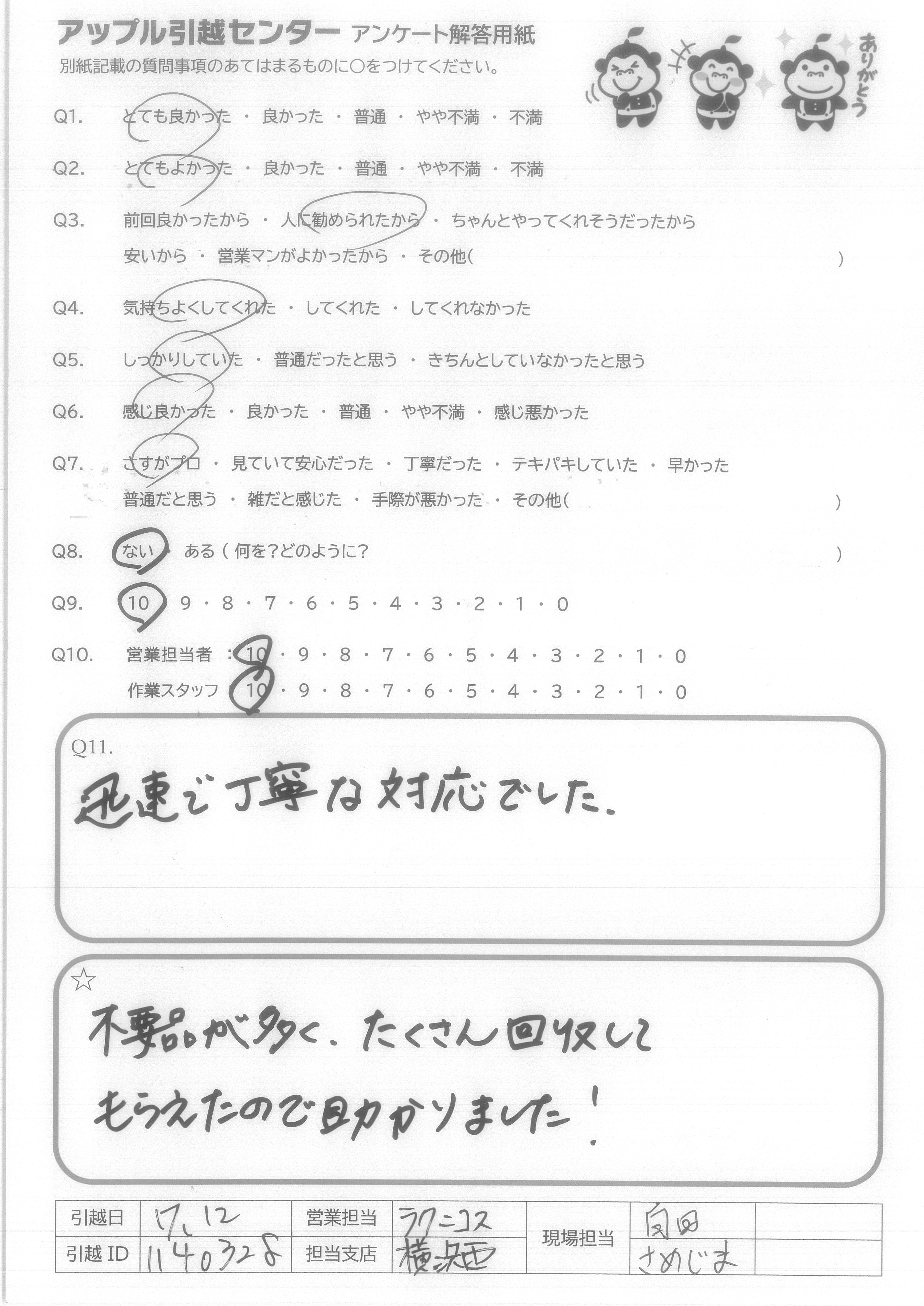 A.不要品が多く、たくさん回収してもらえたので助かりました!