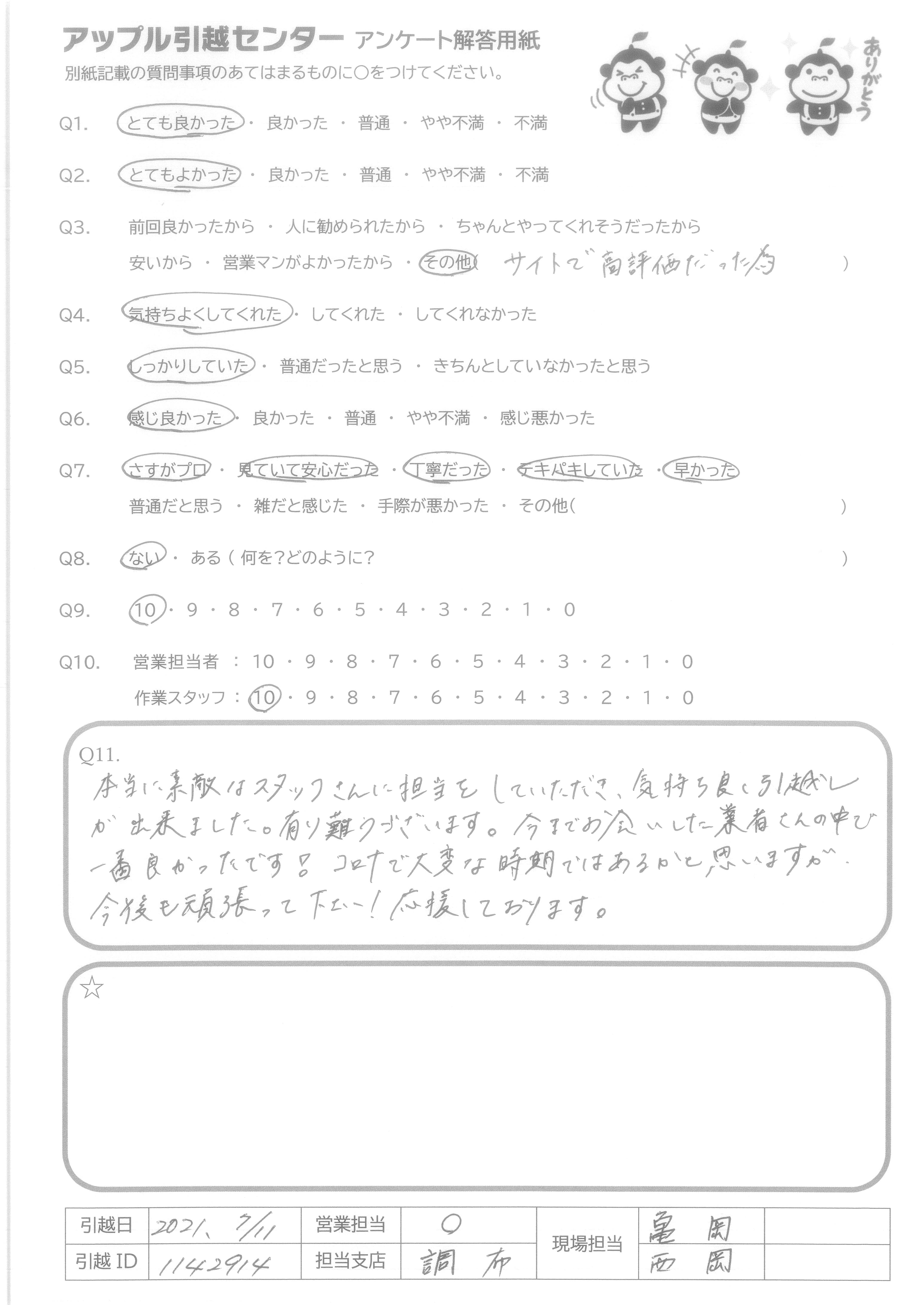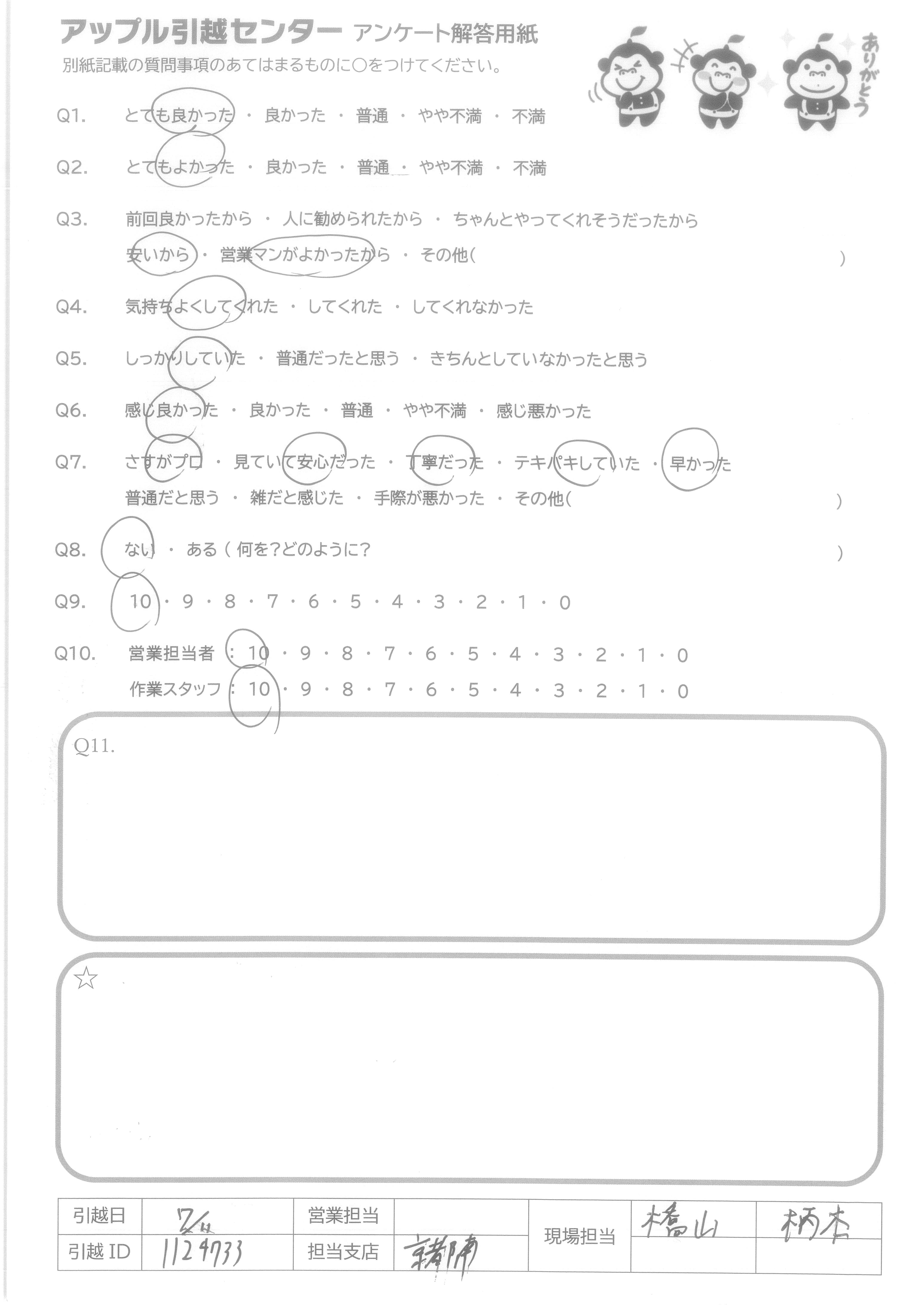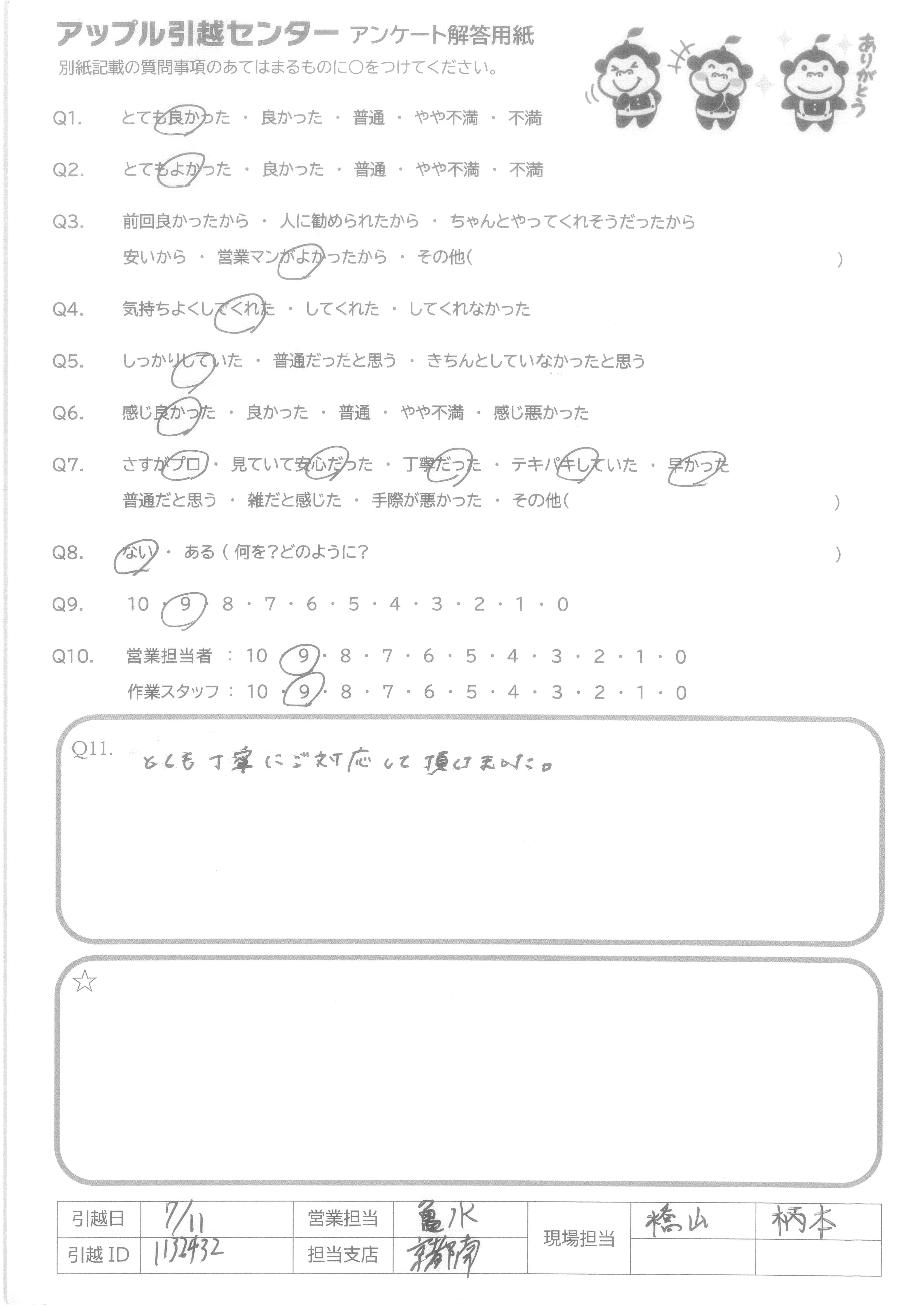 A.当日の応対が非常によく、養生もしっかりして頂き、安心して引越しできました。 ありがとうございました!