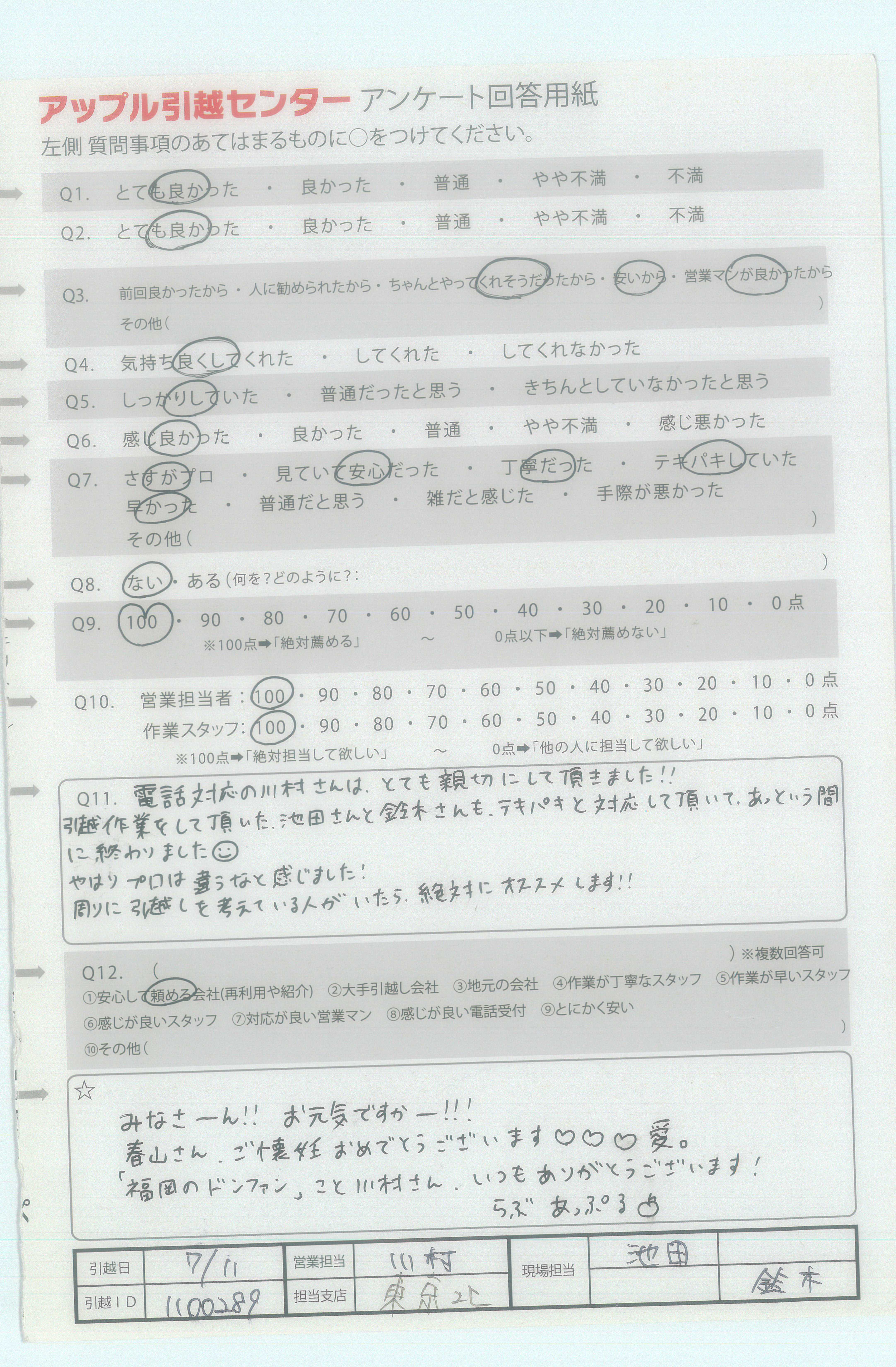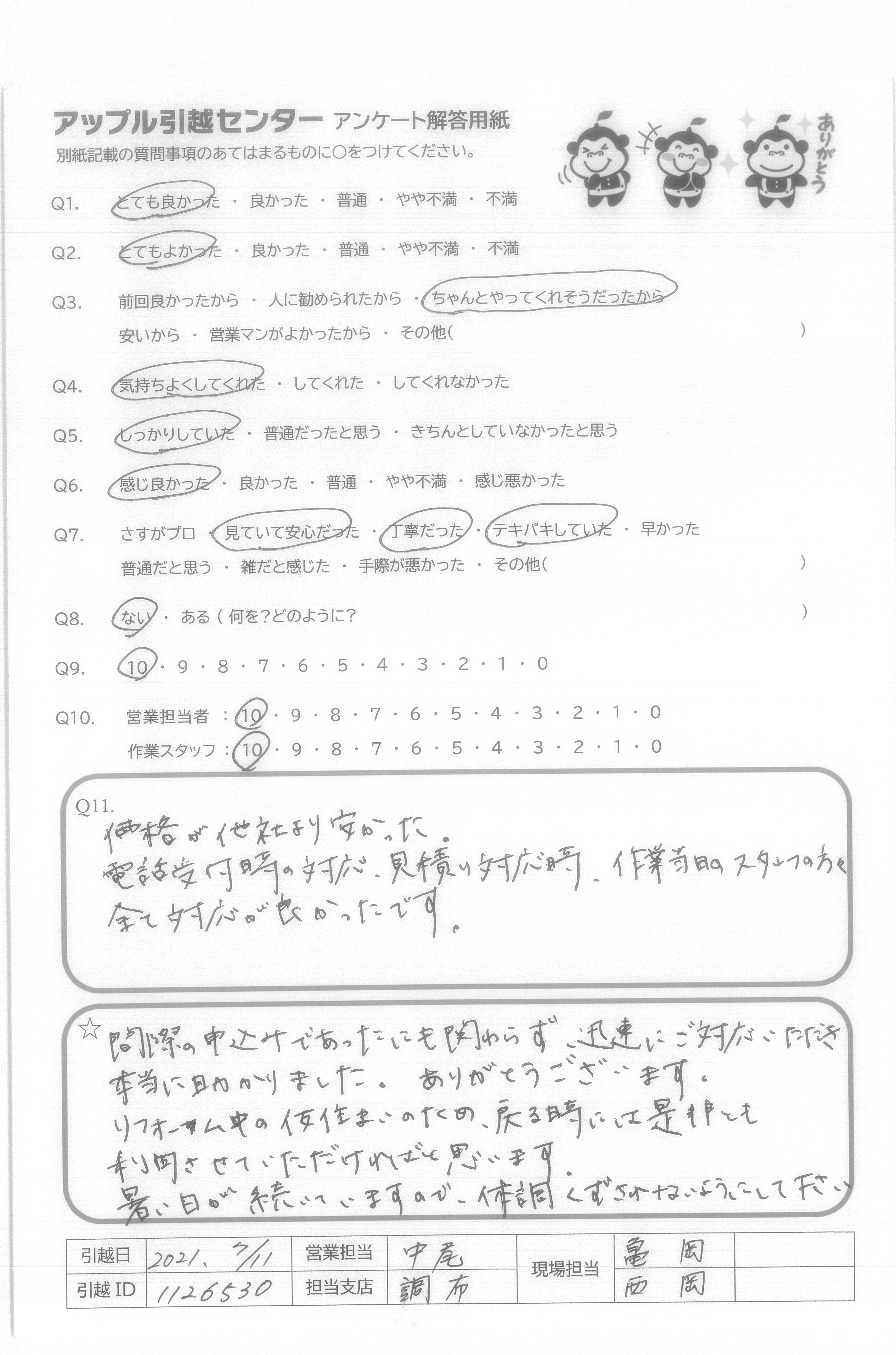 A.今迄の中で最も親切でしっかりと仕事をして下さる会社と出会えて今後も引越の際はお願いしたい。 本当にありがとうございました。