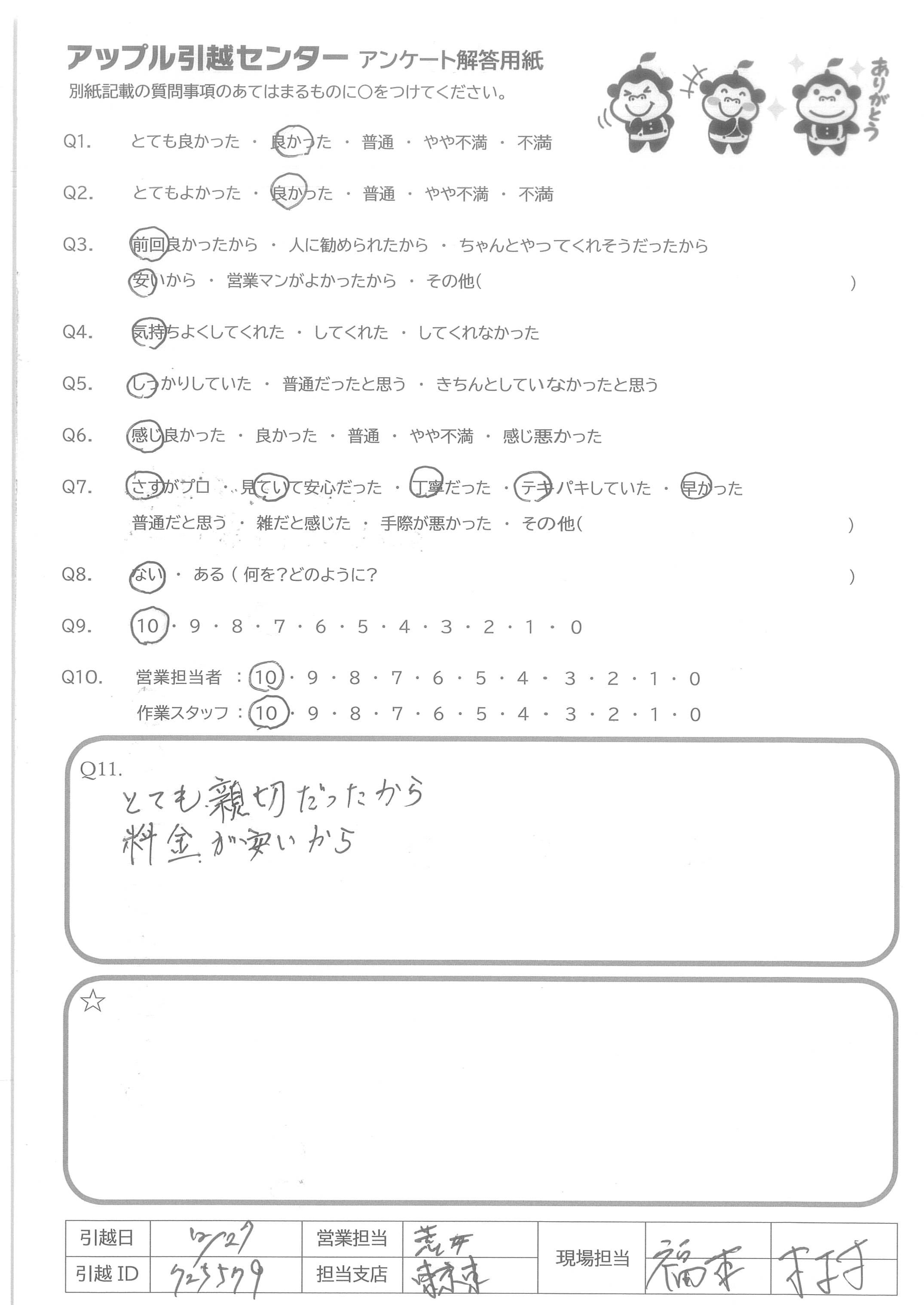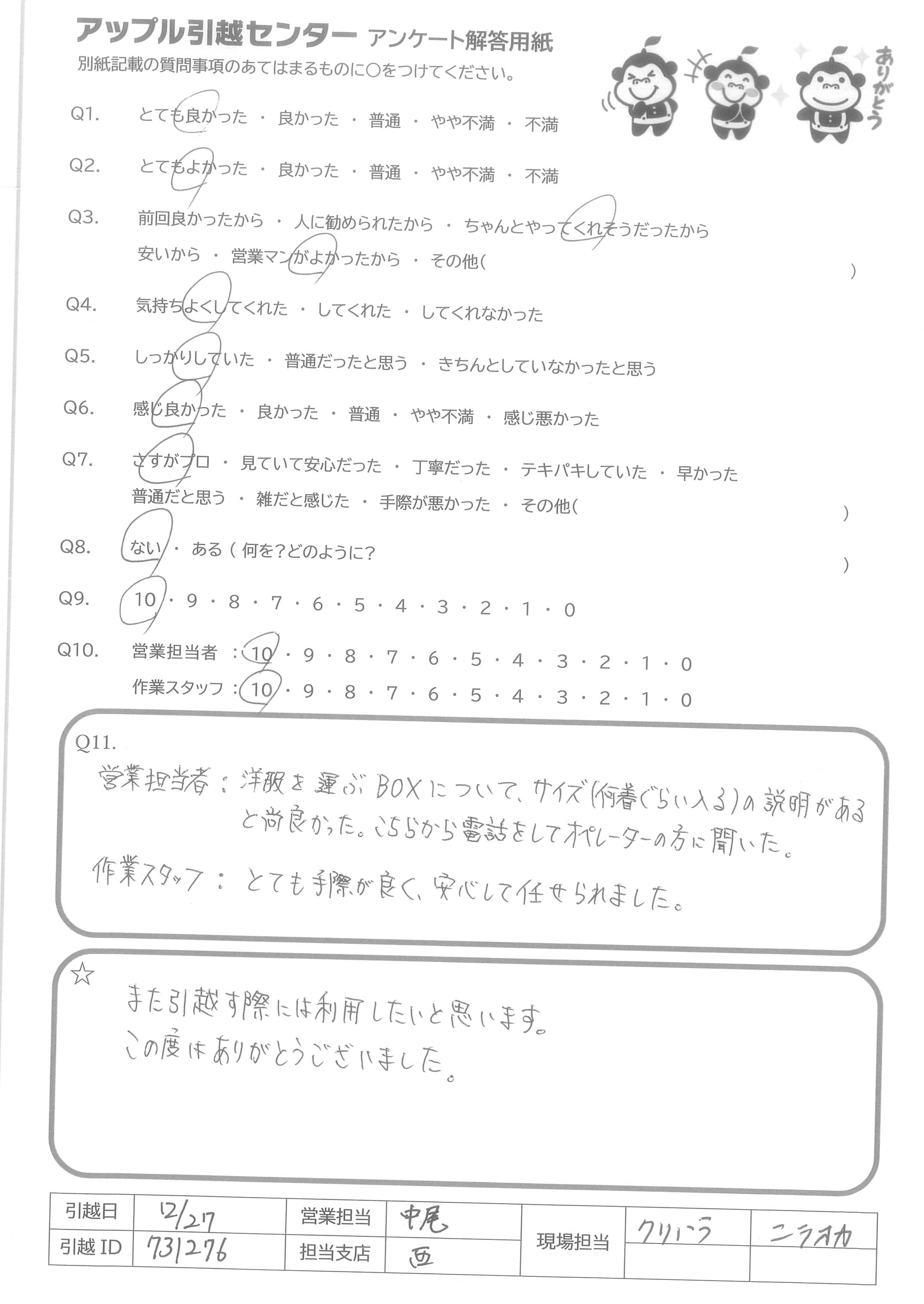 A.移動するのに家具をふいてくれたら良かった。 せっかく移動したのにホコリのついたままの家具がおいてかれて少し残念。 他はとても良かった!出口さんもとても感じがよく安心してまかせられました。サービスはすごい!