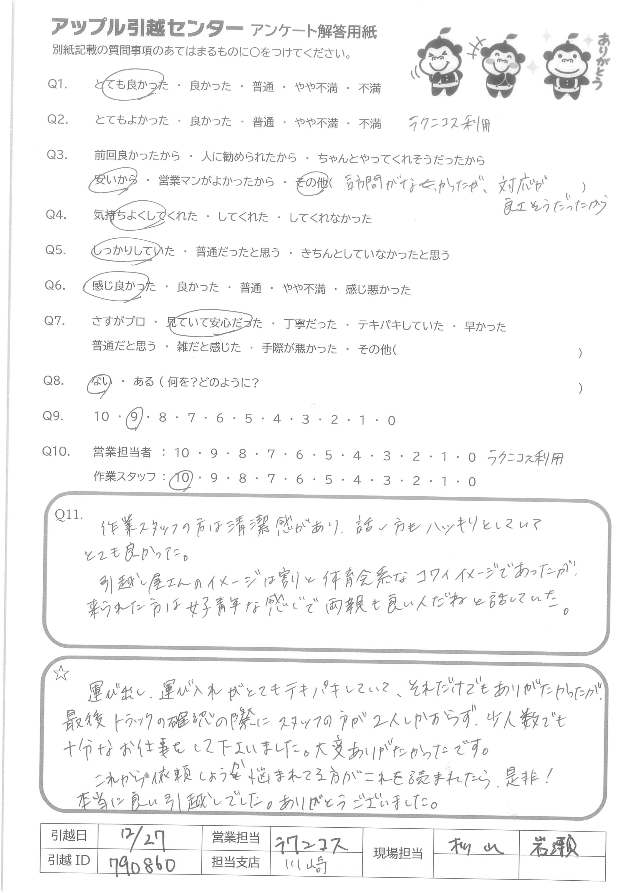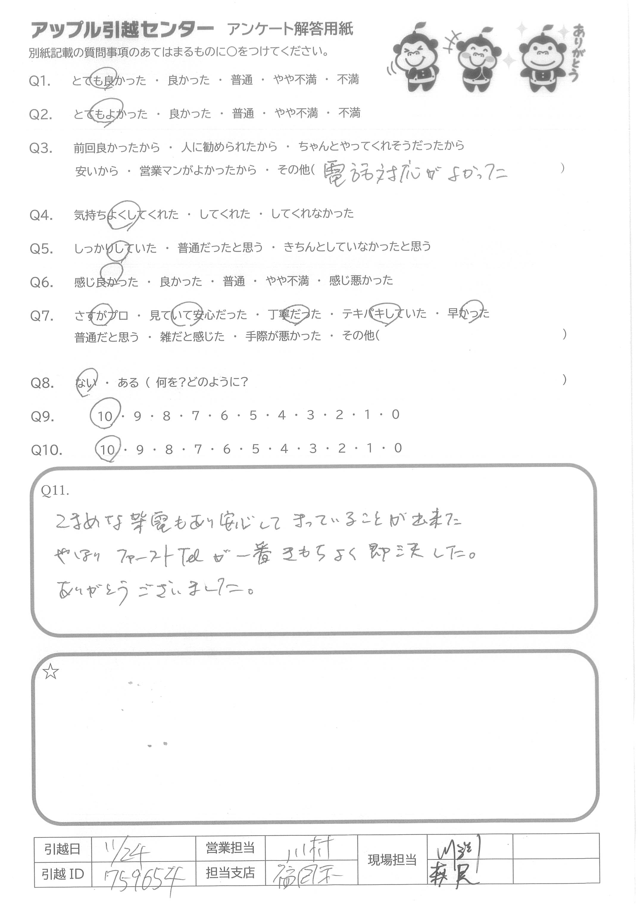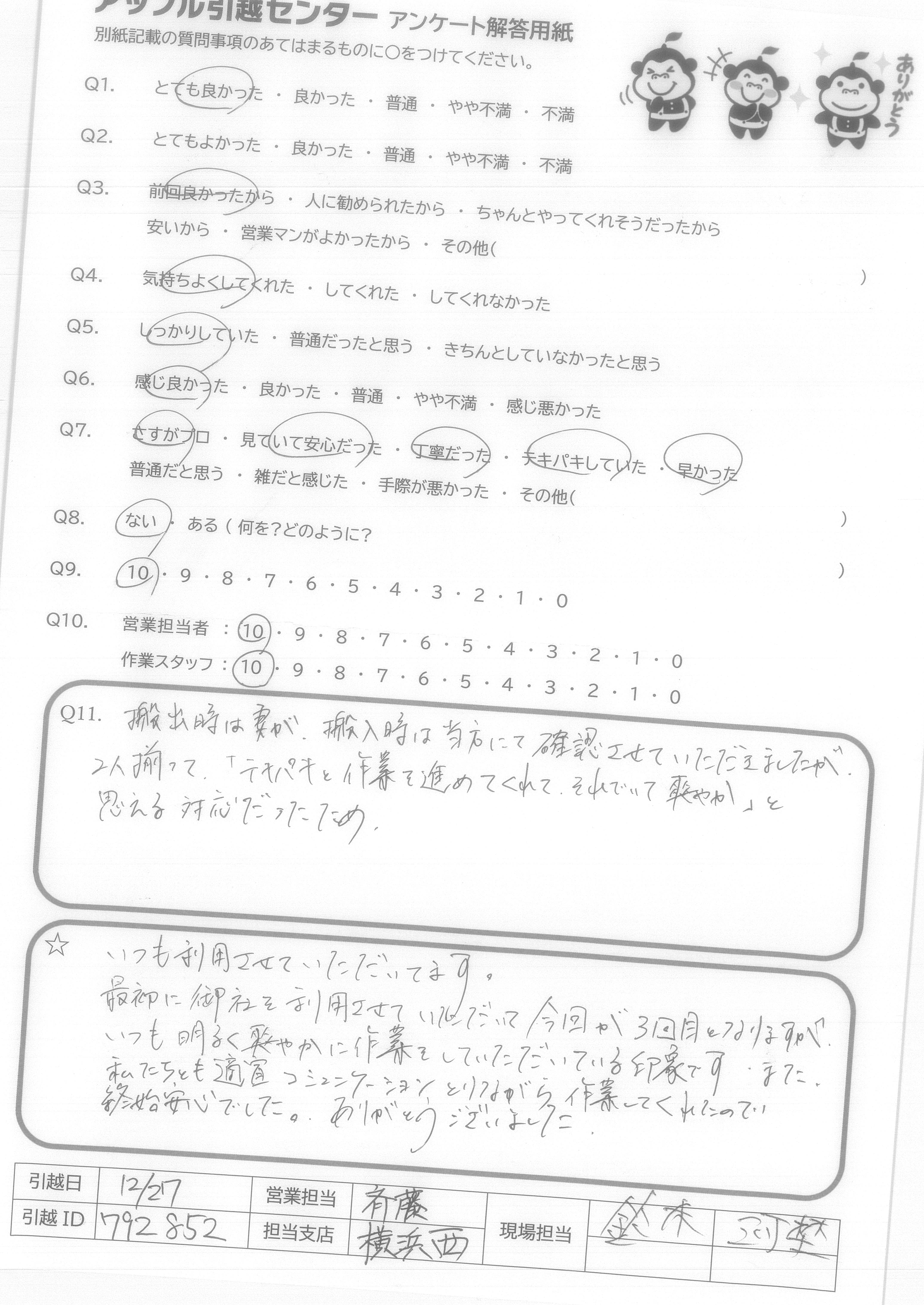 A.前回の引越しを担当して下さった横浜の西村さんが大変対応も作業も素晴らしく感激でしたので、今回も利用させて頂きました。前回と比べると笑顔や爽やかさが無かったかなとは思いますが、最後まで要望も聞いて下さりご親切で感じが良かったです。アルバイトの方が社員の方へ気が利くフォローが足りなかったかなと見ていて感じました。あとあえて指摘するとしたら、ベットフレームの梱包をせずにそのまま運んでいたのが気になりました。あとは本当に長い時間ご対応頂きました事感謝致します。次回の引越しもアップルさんにお願いしたいです。ありがとうございました。