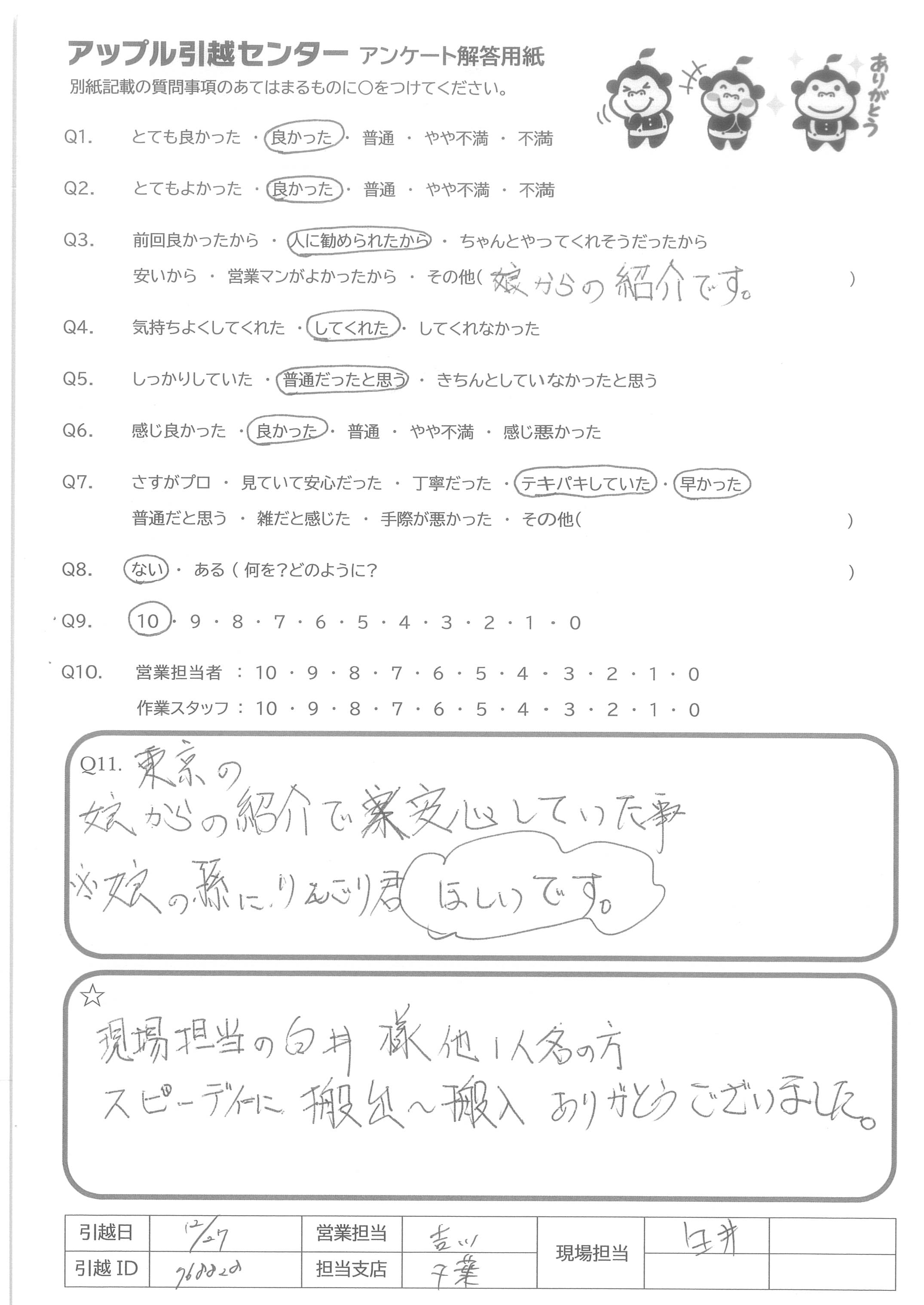 A.東京での引っ越しは全て御社に依頼し、友人にも同僚にもすすめています!お値段以上のクオリティで大満足です!ありがとうございました!
