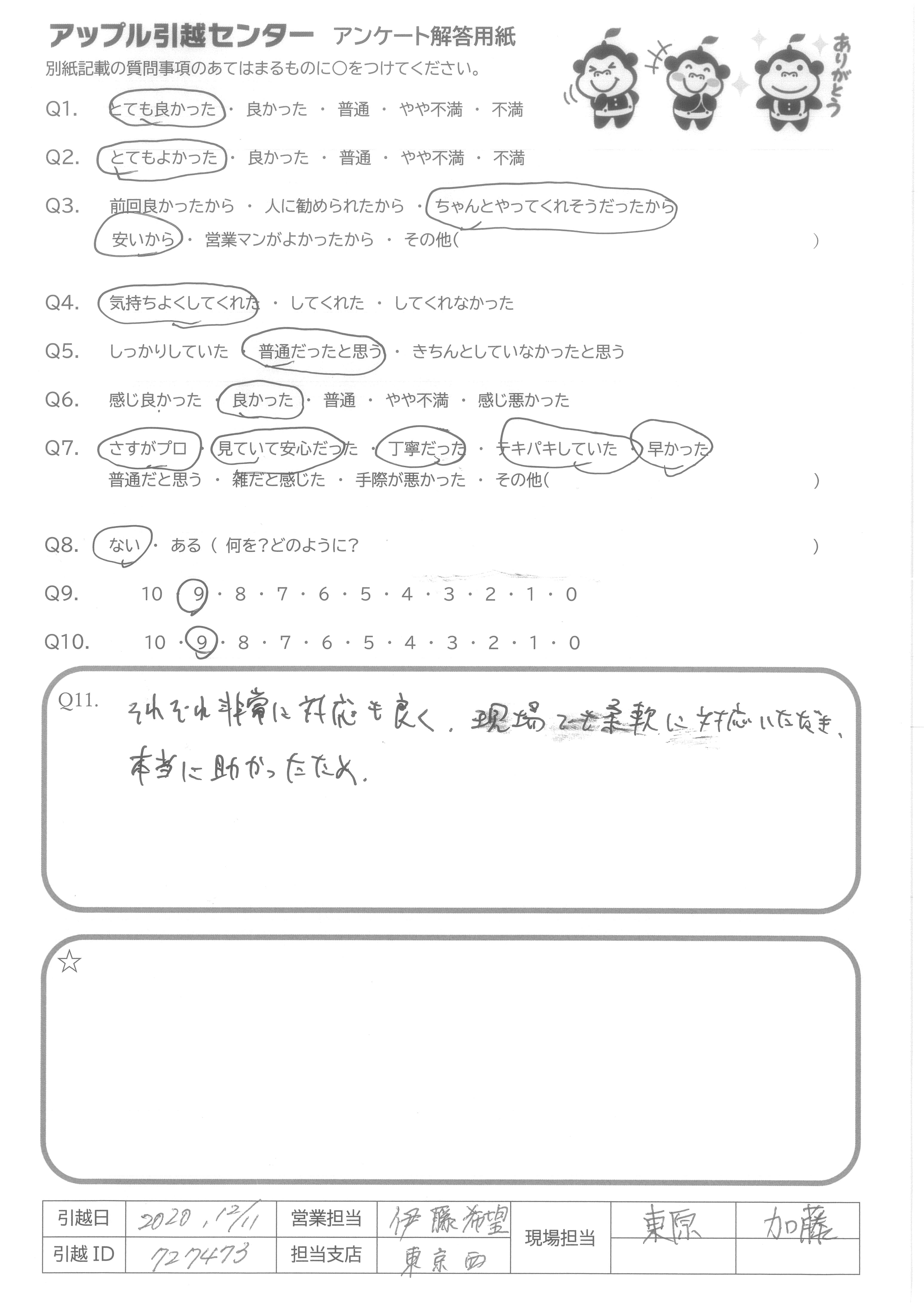 A.この度はお世話になりましてありがとうございました。諸事情により色々なご不便ご迷惑をおかけした内容にも関わらず、見積もりの段階から親身に聞いて下さいました。下見が出来ない事で電話対応となっていましたが何度も確認やこちらの不安を解消させてくれて、また管理会社等への迅速な対応もして頂きました。前日ダンボール受け取りの際も、当日の搬出作業の合間も細心の注意や荷物の確認と説明、ご配慮も有難く、すごく丁寧に扱って頂けたと思います。荷物も多かったのですが、時間を気にして頂いたり、また、少しの雑談をして頂いたり傍に居る私に『お手伝いはありませんか?』『何か気になる事はありませんか?』と迅速な作業の中で手を止める事無く何度もお気遣い頂きました。とても感動致しました。大変な作業だったと思いますが皆様が笑顔で快く引き受けて作業して下さった事、本当に感謝しています。最後の写真撮影やトラックが出るまでこれから新生活をする私達へのお言葉、とても楽しく嬉しく思いました。引越しに伴う不安は処分し、期待と希望と笑顔を一緒に新居に運び入れて下さった"お引越しのプロ"の皆様に出会えた事を本当に感謝し大切にしたいです。ありがとうございました。今年はコロナが流行りました。りんごり君含め皆様くれぐれもお体ご自愛ください。