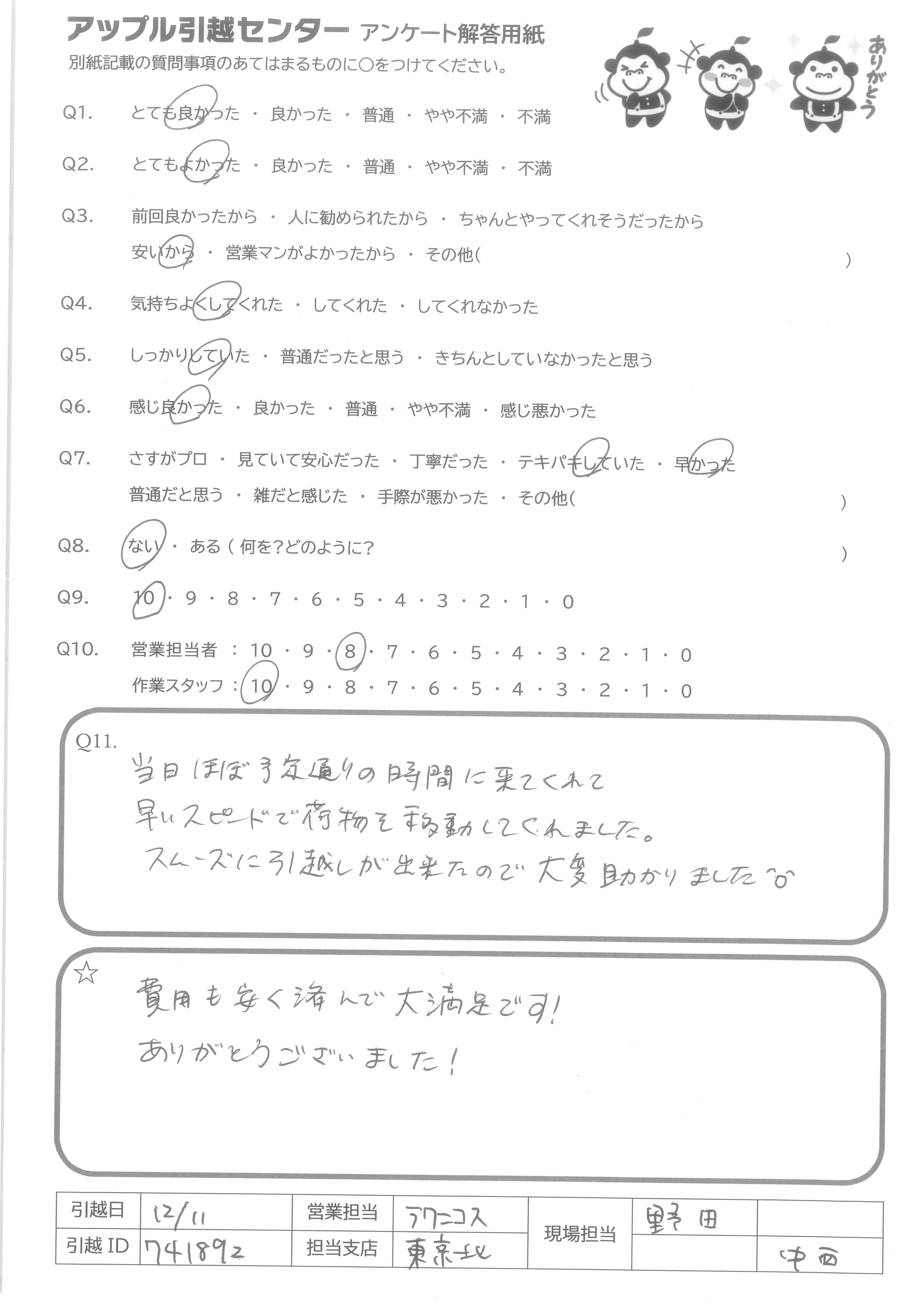 引越し日:2020年12月11日 エリア:東京都江東区