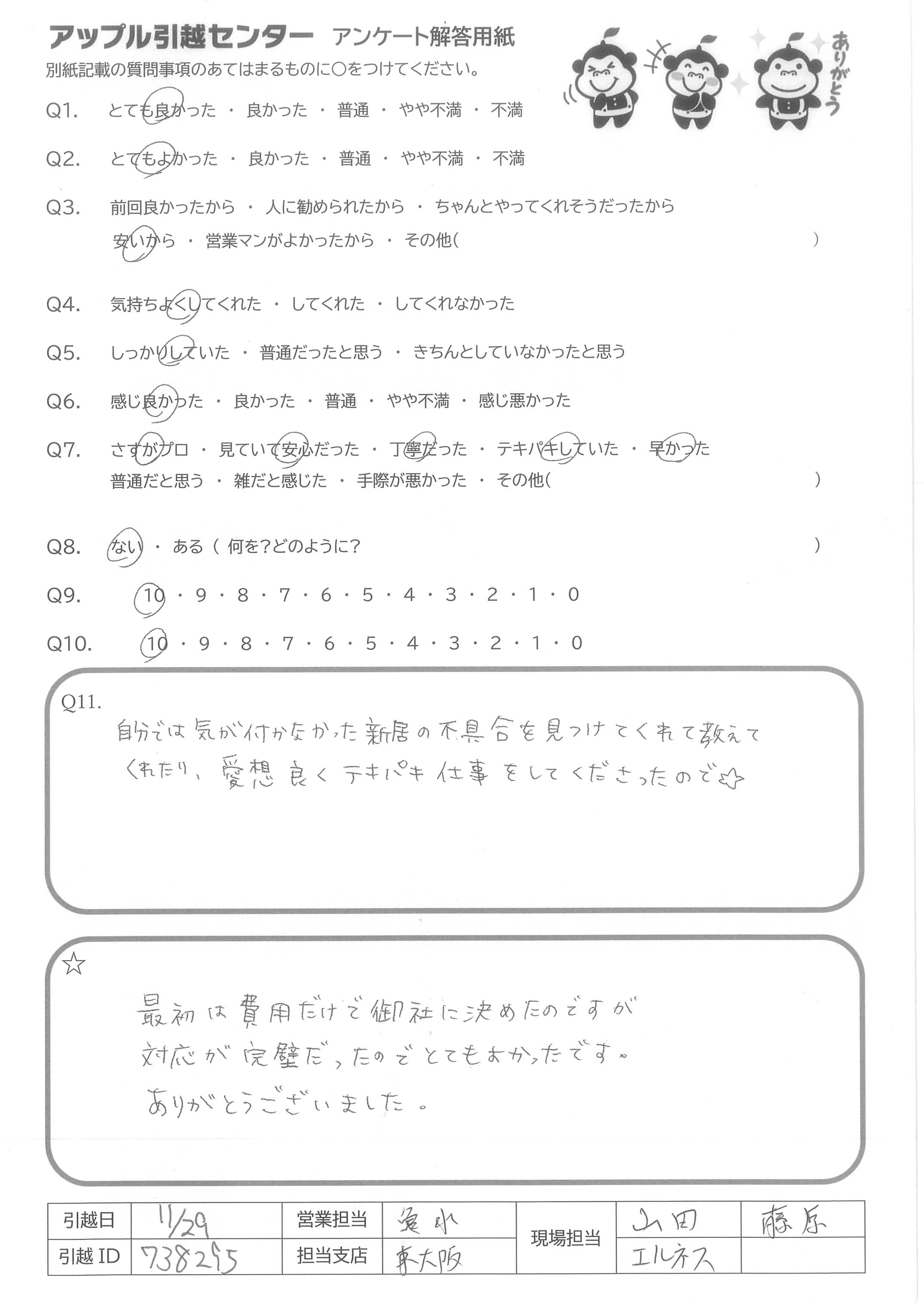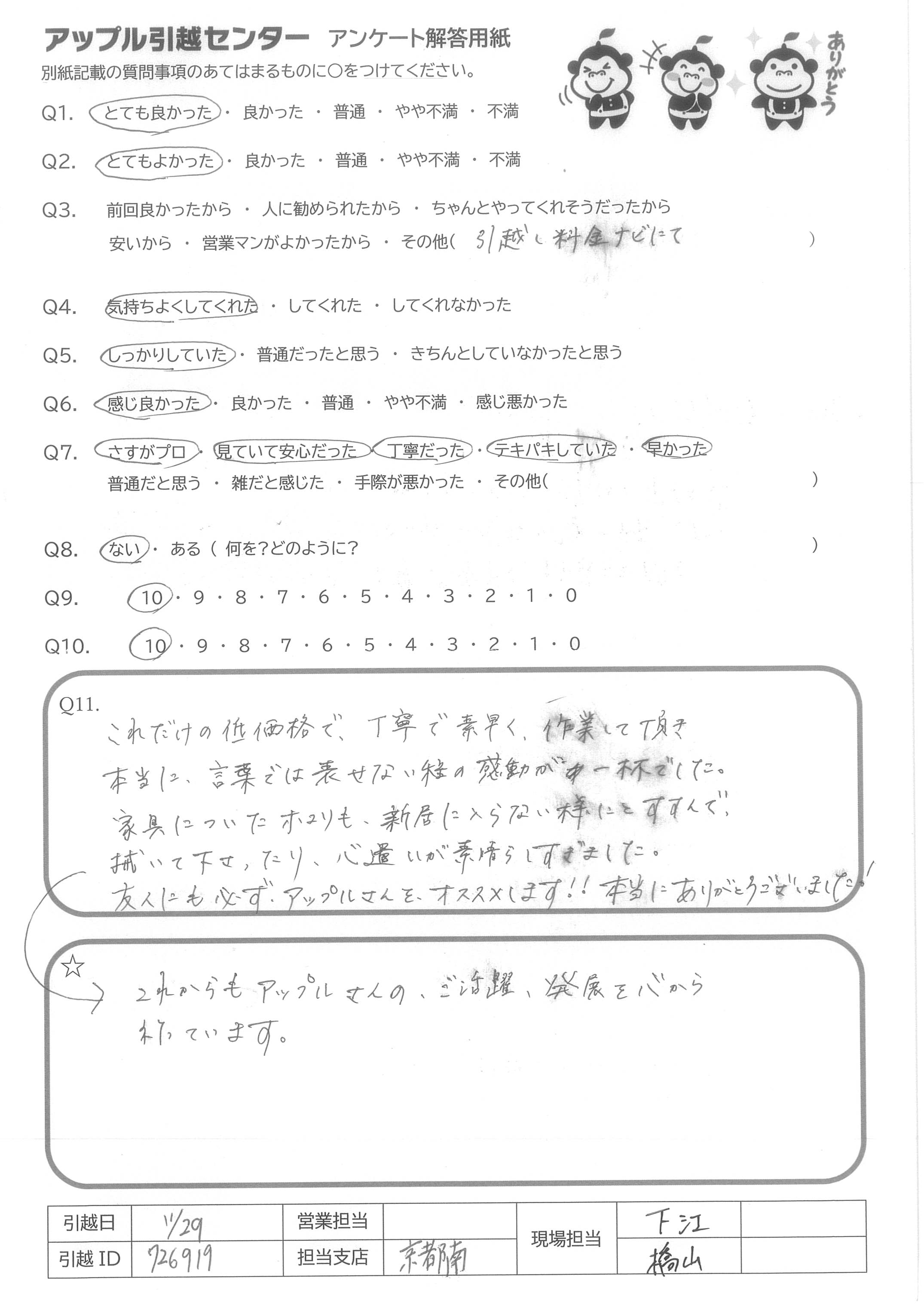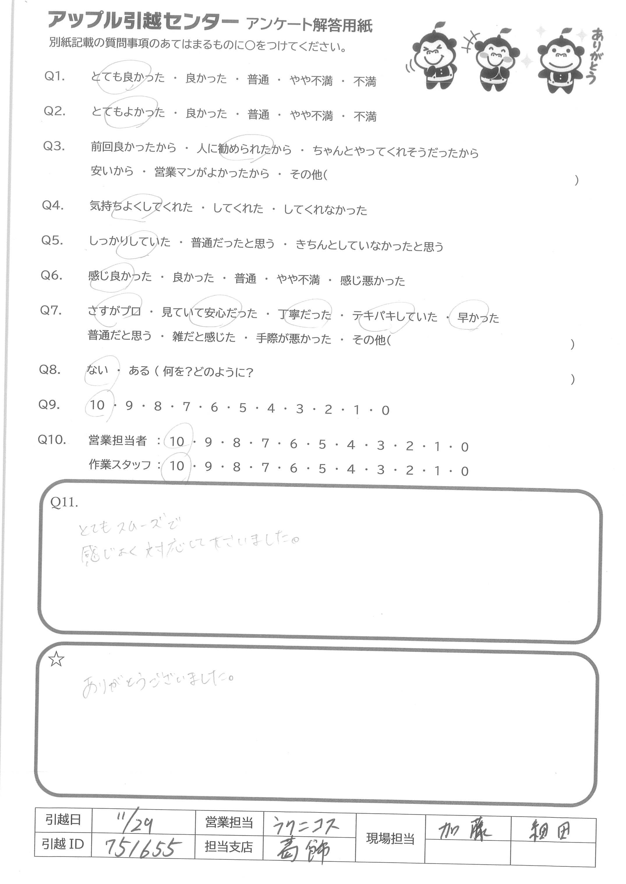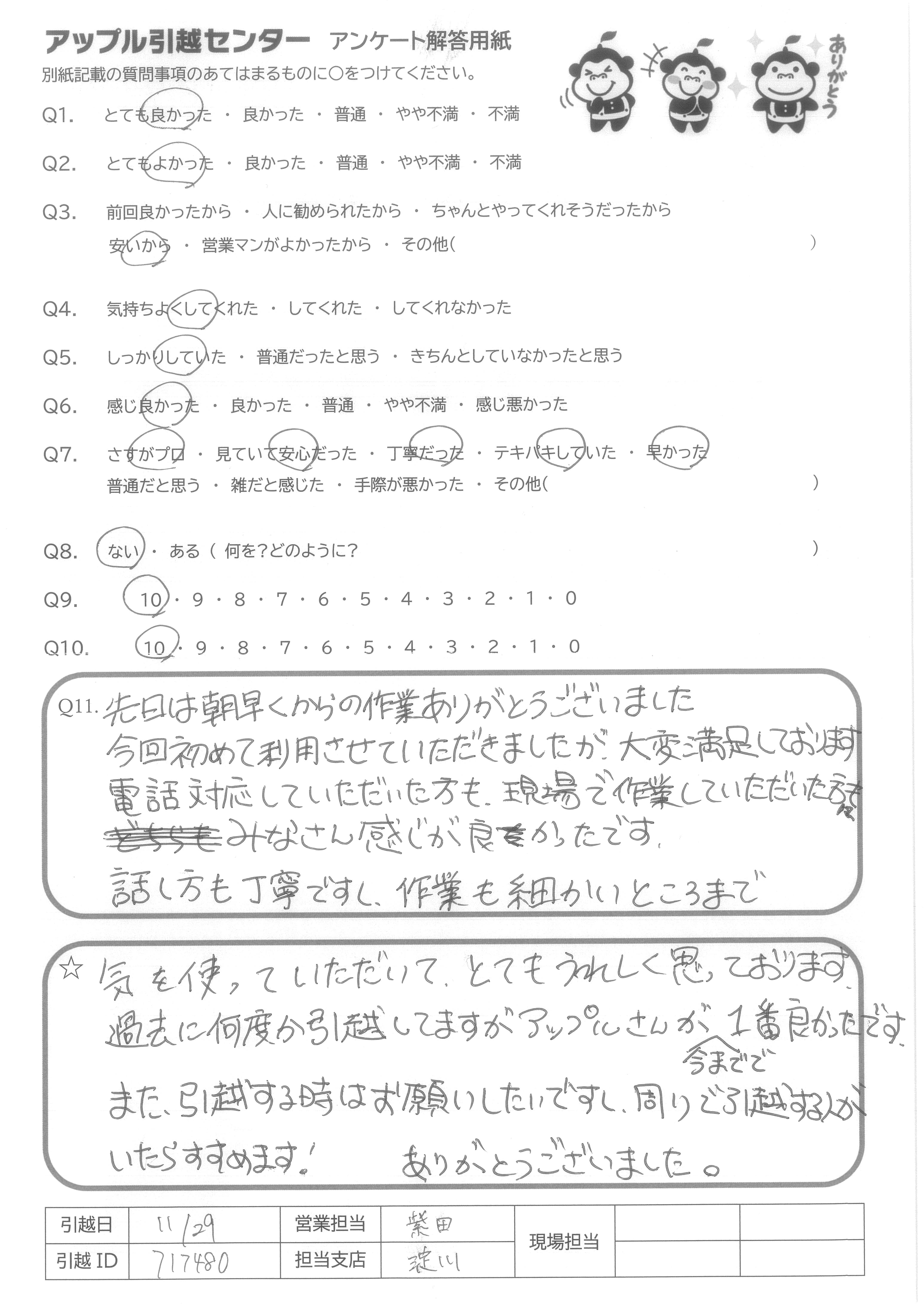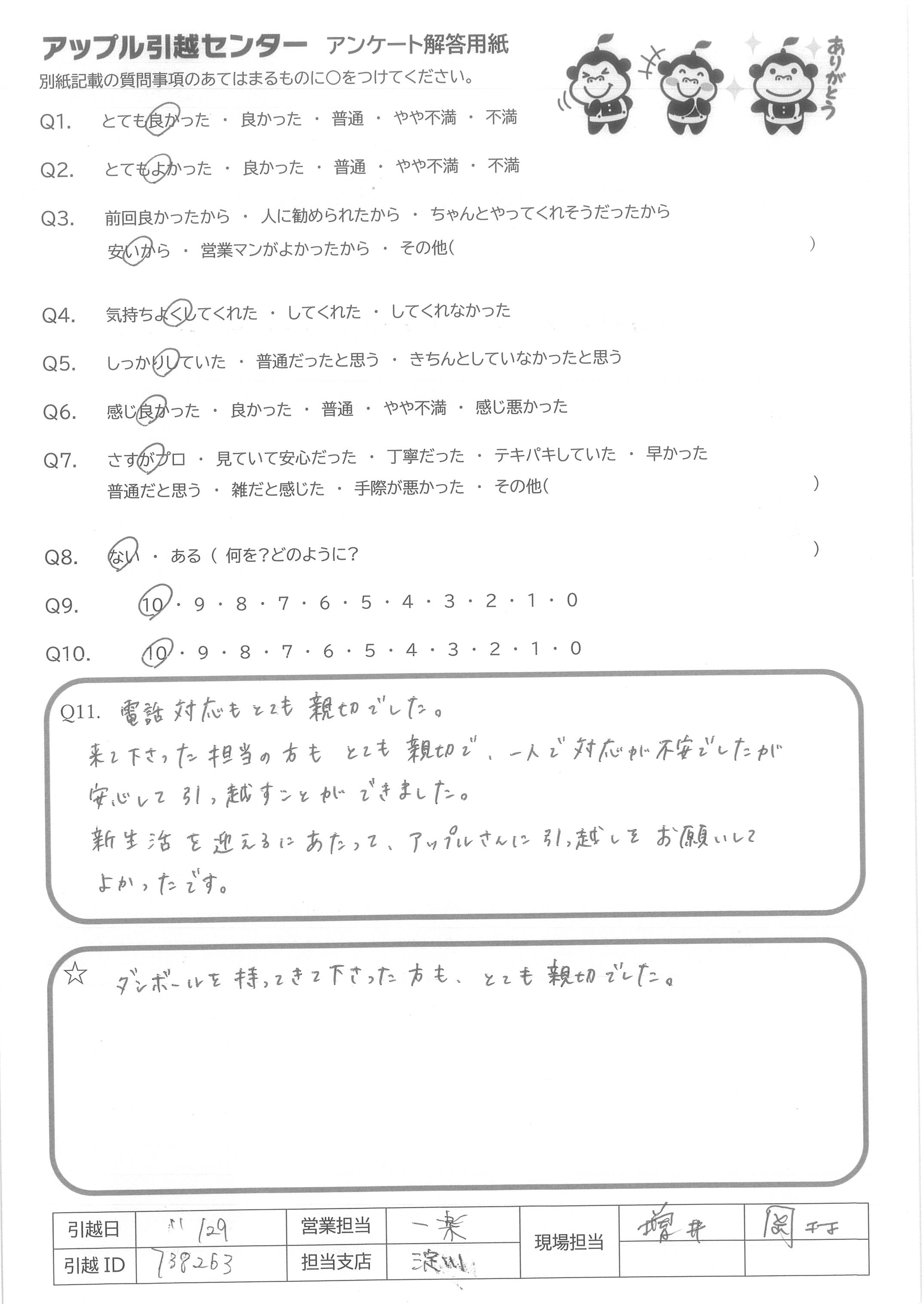 A.先日は朝早くからの作業ありがとうございました 今回初めて利用させていただきましたが、大変満足しております 電話対応していただいた方も、現場で作業していただいた方も みなさん感じが良かったです 話し方も丁寧ですし、作業も細かいところまで 気を使っていただいて、とてもうれしく思っております 過去に何度か引越してますがアップルさんが今までで1番良かったです また、引越する時はお願いしたいですし、周りで引越する人が いたらすすめますありがとうございました。