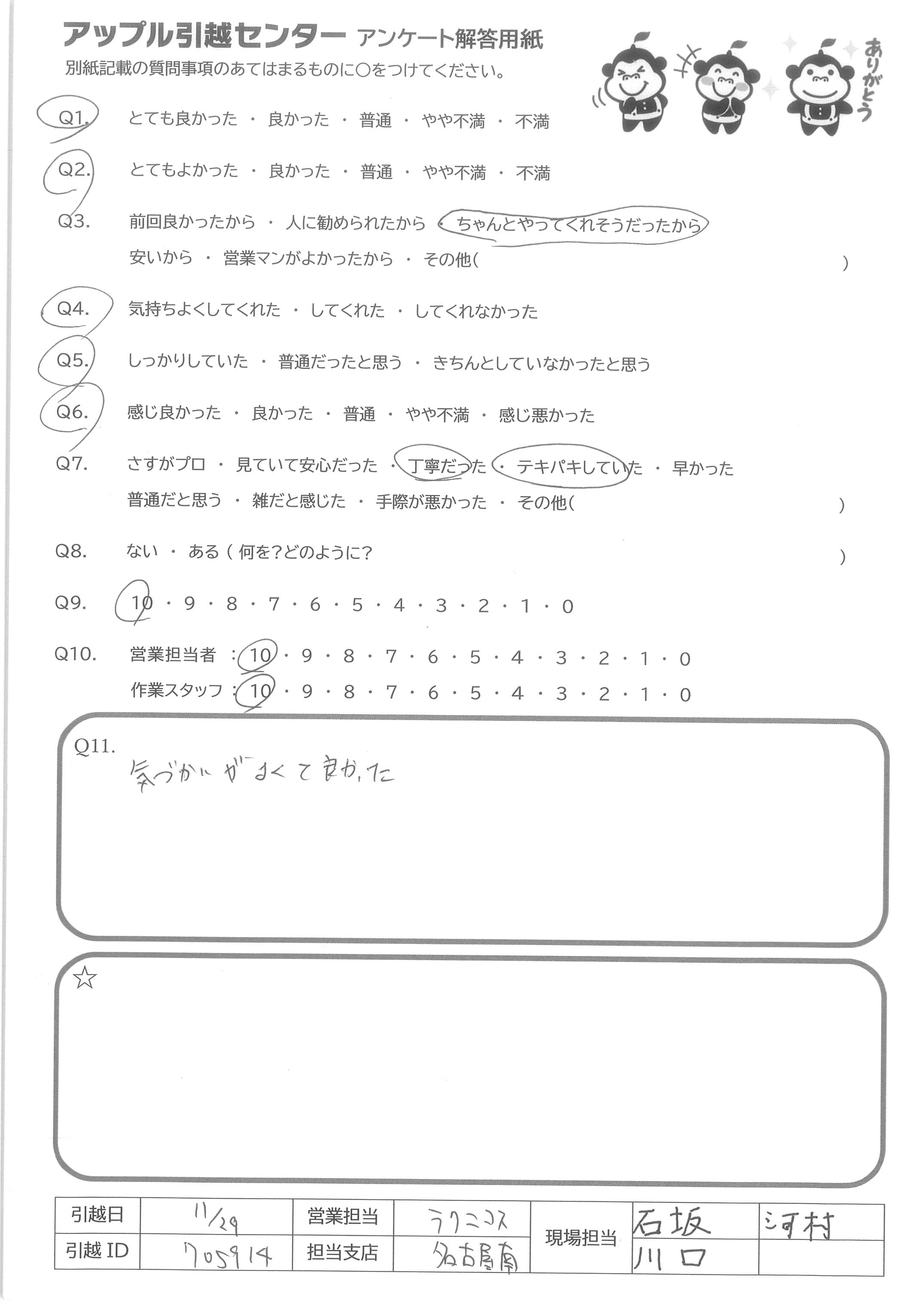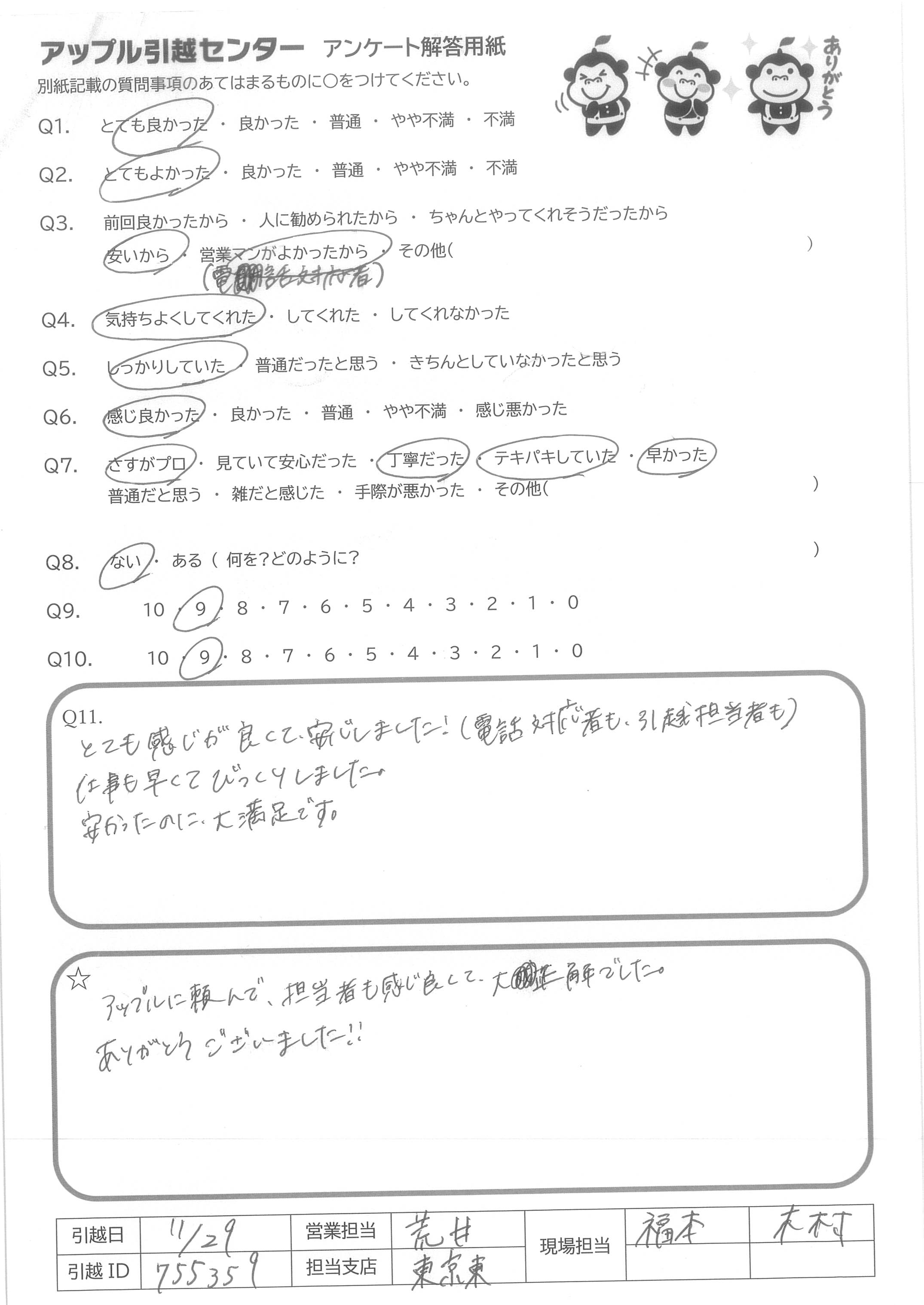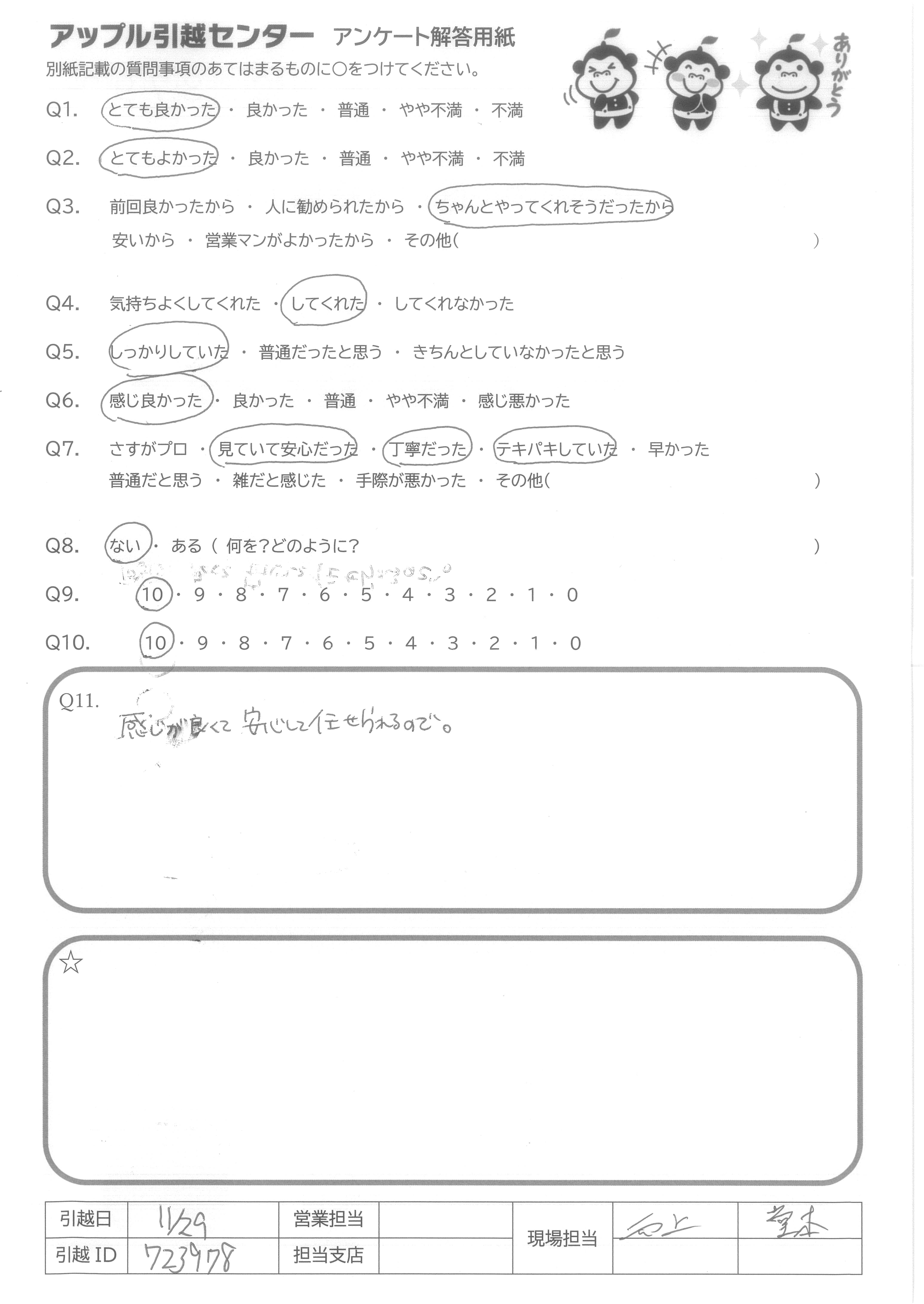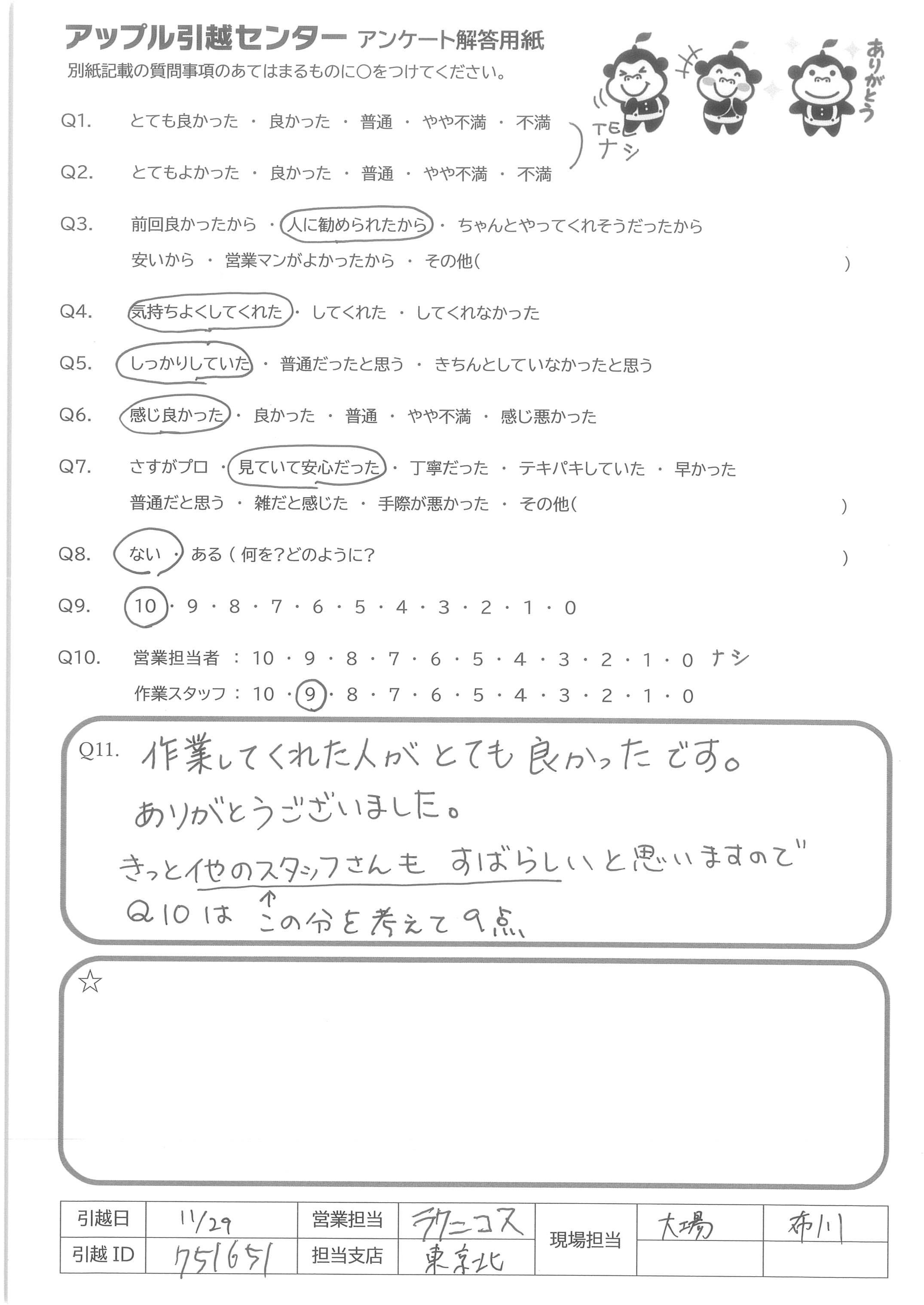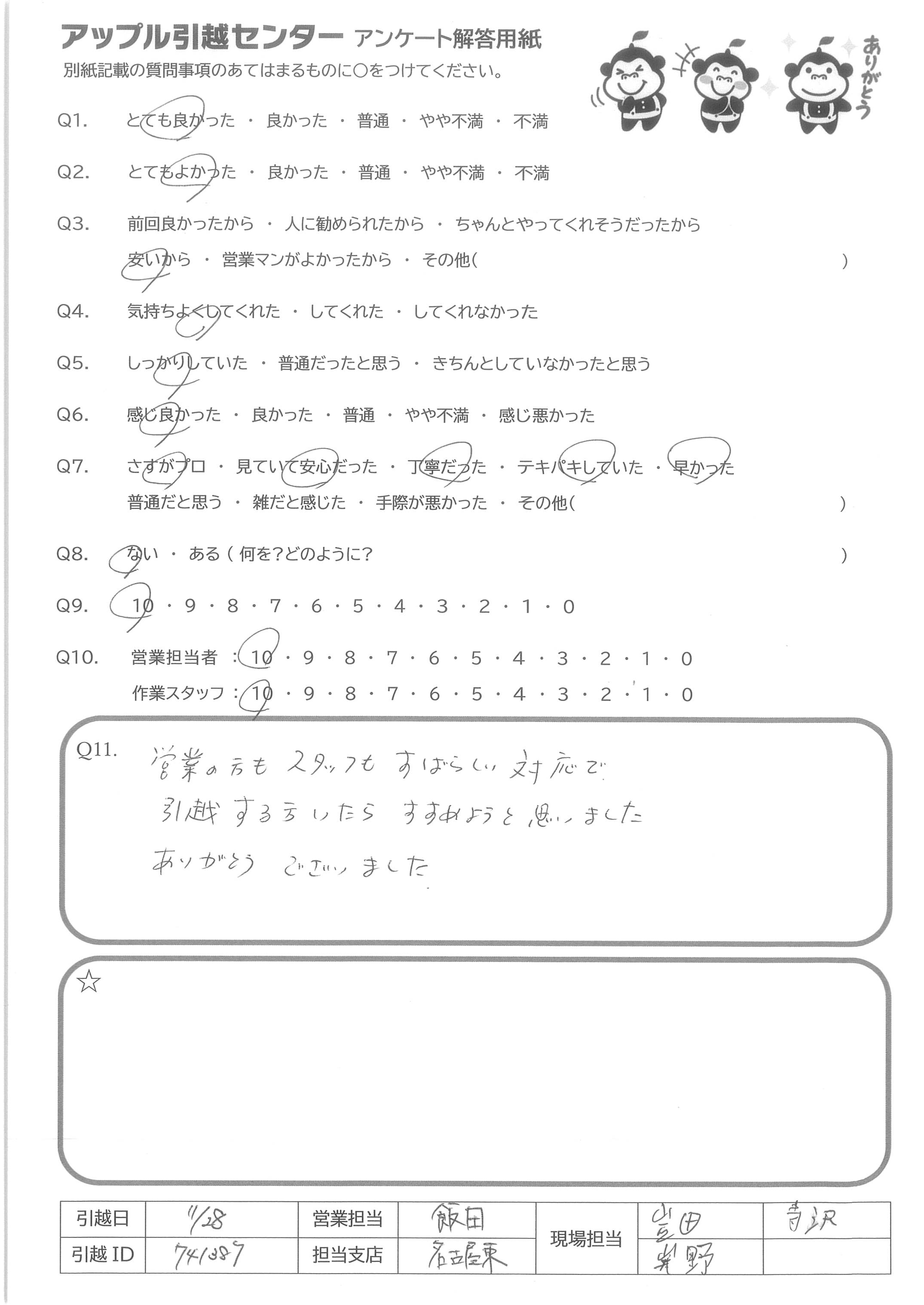 A.先日は朝早くからの作業ありがとうございました 今回初めて利用させていただきましたが、大変満足しております 電話対応していただいた方も、現場で作業していただいた方も みなさん感じが良かったです 話し方も丁寧ですし、作業も細かいところまで 気を使っていただいて、とてもうれしく思っております 過去に何度か引越してますがアップルさんが今までで1番良かったです また、引越する時はお願いしたいですし、周りで引越する人が いたらすすめますありがとうございました。