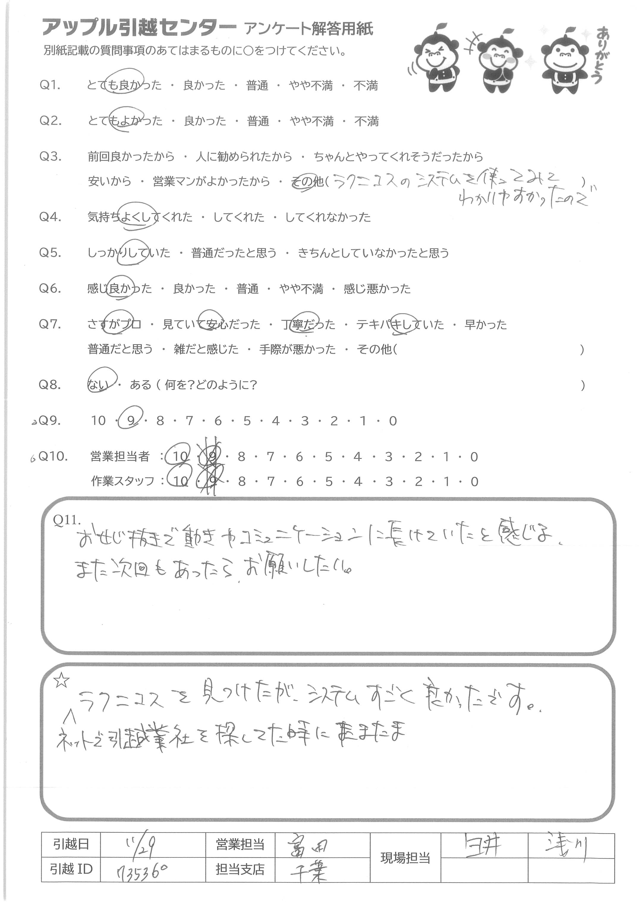 A.ネットで引越業社を探してた時にたまたまラクニコスを見つけたが、システムすごく良かったです。