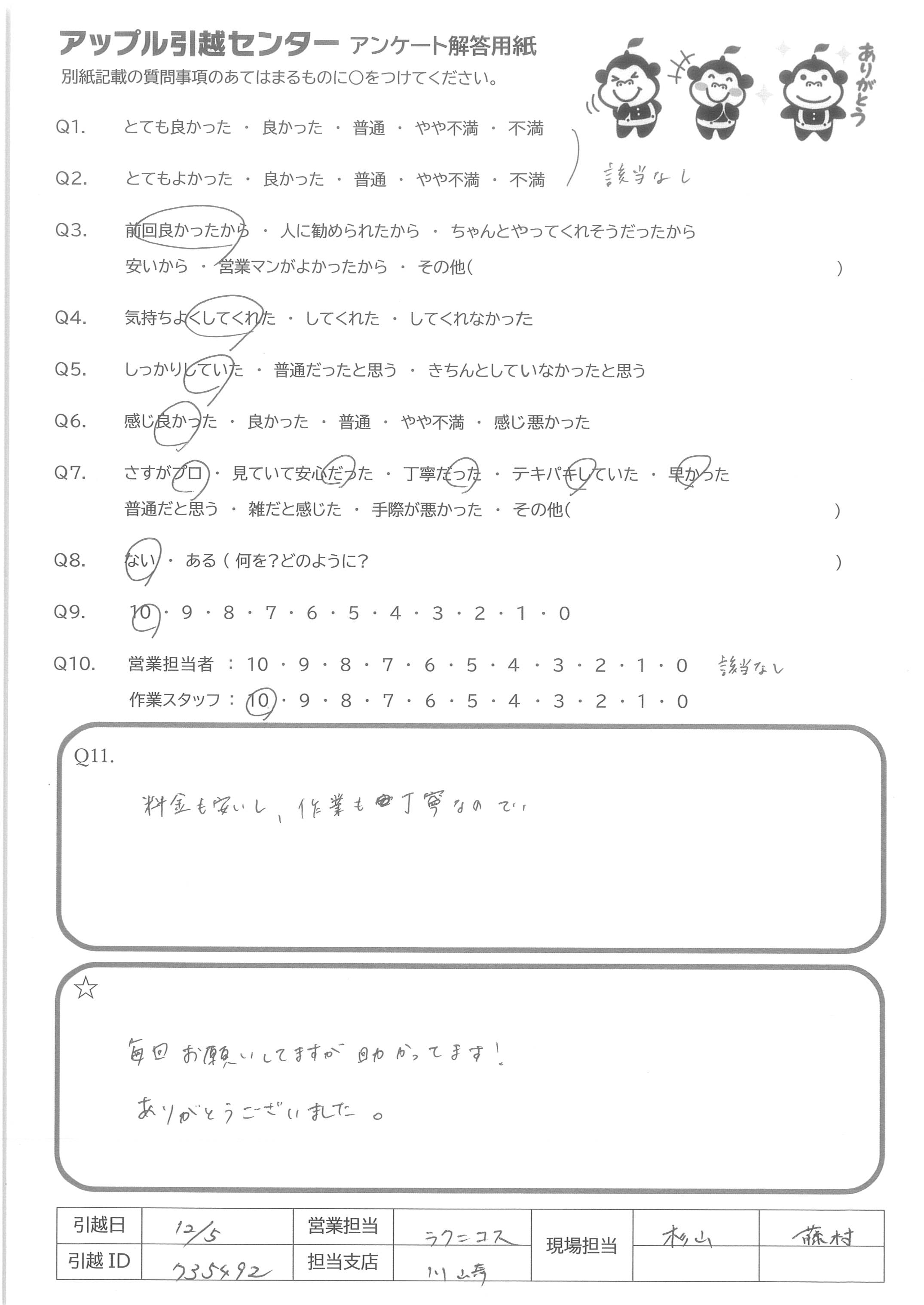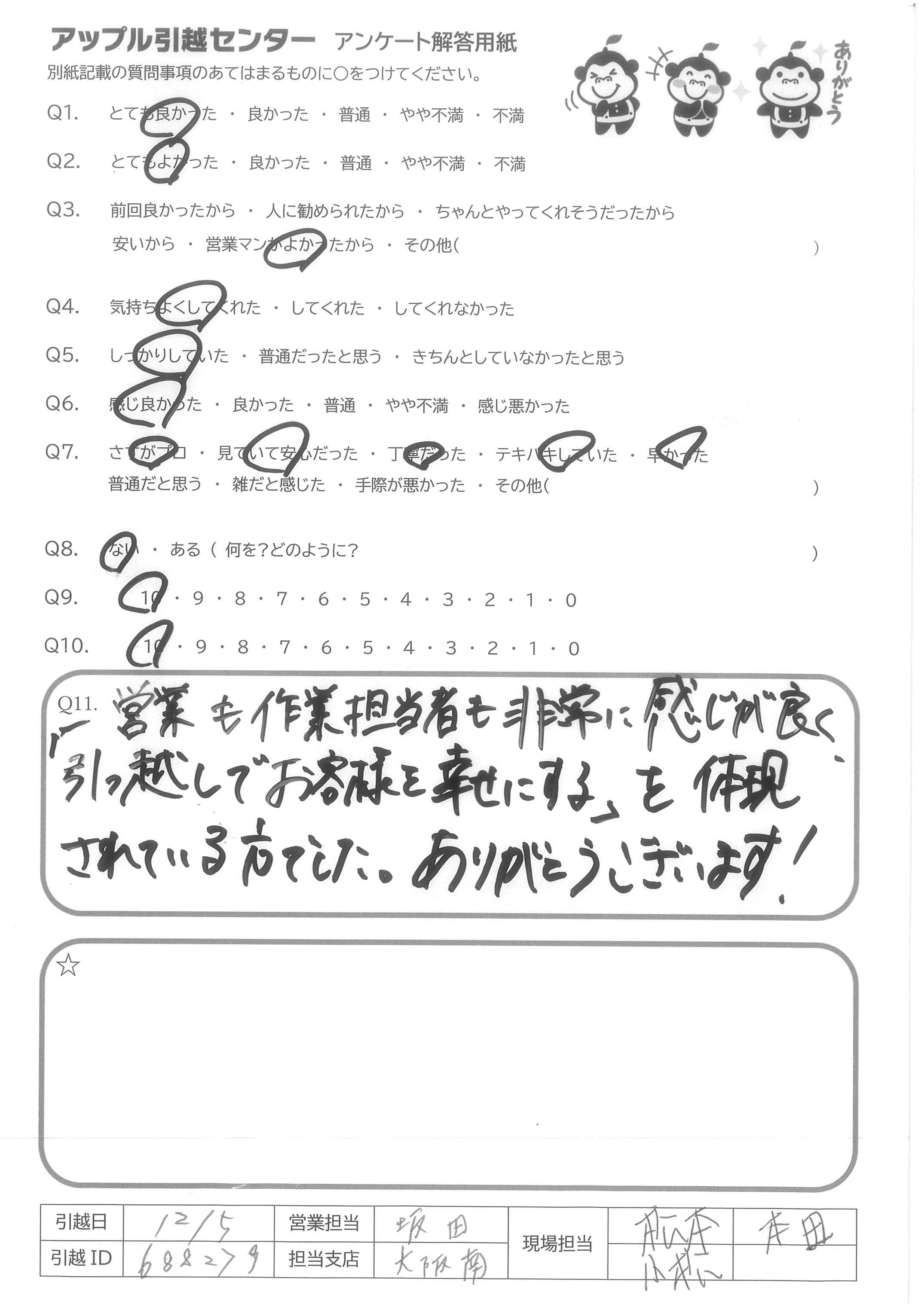 引越し日:2020年12月05日 エリア:大阪府大阪市平野区