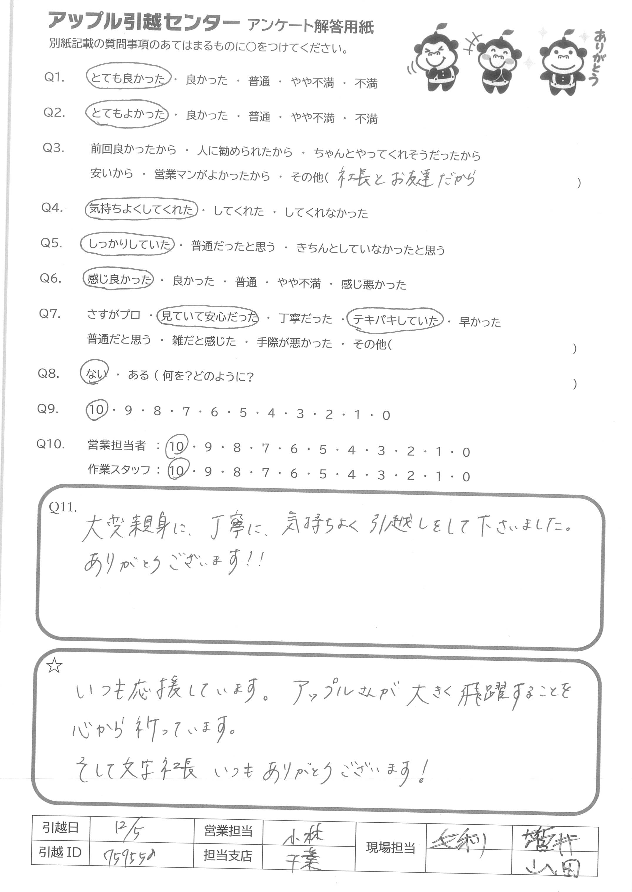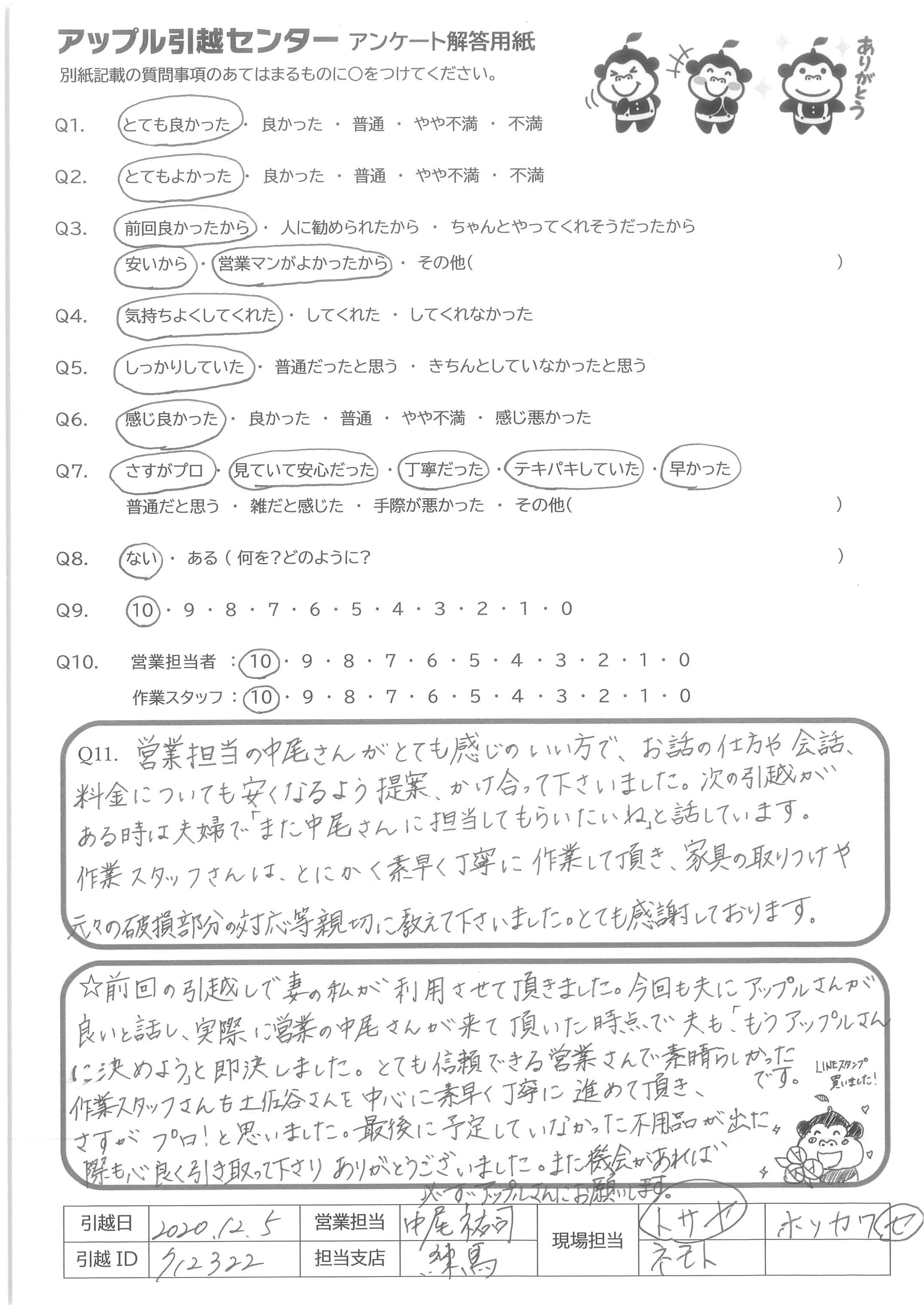 A.前回の引越しで妻の私が利用させて頂きました。今回も夫にアップルさんが良いと話し、実際に営業の中尾さんが来て頂いた時点で夫も「もうアップルさんに決めよう」と即決しました。とても信頼できる営業さんで素晴らしかったです。作業スタッフさんも土佐谷さんを中心に素早く丁寧に進めて頂き、さすがプロ!と思いました。最後に予定していなかった不用品が出た際も心良く引き取って下さりありがとうございました。また機会があれば必ずアップルさんにお願いします。LINEスタンプ買いました!